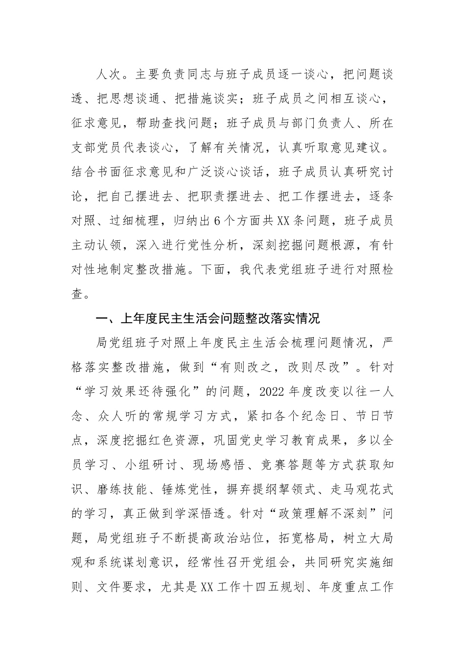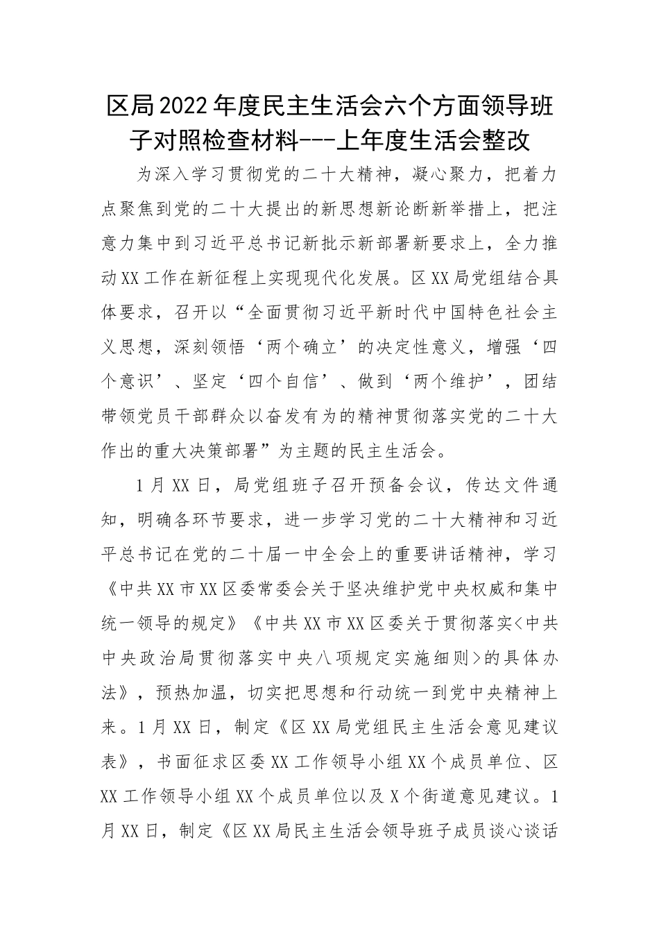 区局2022年度民主生活会六个方面领导班子对照检查材料---上年度生活会整改为深入学习贯彻党的二十大精神,凝心聚力,把着力点聚焦到党的二十大提出的新思想新论断新举措上,把注意力集中到习近平总书记新批示新部署新要求上,全力推动XX工作在新征程上实现现代化发展。区XX局党组结合具体要求,召开以“全面贯彻习近平新时代中国特色社会主义思想,深刻领悟‘两个确立’的决定性意义,增强‘四个意识’、坚定‘四个自信’、做到‘两个维护’,团结带领党员干部群众以奋发有为的精神贯彻落实党的二十大作出的重大决策部署”为主题的民主生活会。1月XX日,局党组班子召开预备会议,传达文件通知,明确各环节要求,进一步学习党的二十大精神和习近平总书记在党的二十届一中全会上的重要讲话精神,学习《中共XX市XX区委常委会关于坚决维护党中央权威和集中统一领导的规定》《中共XX市XX区委关于贯彻落实<中共中央政治局贯彻落实中央八项规定实施细则>的具体办法》,预热加温,切实把思想和行动统一到党中央精神上来。1月XX日,制定《区XX局党组民主生活会意见建议表》,书面征求区委XX工作领导小组XX个成员单位、区XX工作领导小组XX个成员单位以及X个街道意见建议。1月XX日,制定《区XX局民主生活会领导班子成员谈心谈话工作方案》,开展谈心谈话共XX人次。主要负责同志与班子成员逐一谈心,把问题谈透、把思想谈通、把措施谈实;班子成员之间相互谈心,征求意见,帮助查找问题;班子成员与部门负责人、所在支部党员代表谈心,了解有关情况,认真听取意见建议。结合书面征求意见和广泛谈心谈话,班子成员认真研究讨论,把自己摆进去、把职责摆进去、把工作摆进去,逐条对照、过细梳理,归纳出6个方面共XX条问题,班子成员主动认领,深入进行党性分析,深刻挖掘问题根源,有针对性地制定整改措施。下面,我代表党组班子进行对照检查。一、上年度民主生活会问题整改落实情况局党组班子对照上年度民主生活会梳理问题情况,严格落实整改措施,做到“有则改之,改则尽改”。针对“学习效果还待强化”的问题,2022年度改变以往一人念、众人听的常规学习方式,紧扣各个纪念日、节日节点,深度挖掘红色资源,巩固党史学习教育成果,多以全员学习、小组研讨、现场感悟、竞赛答题等方式获取知识、磨练技能、锤炼党性,摒弃提纲挈领式、走马观花式的学习,真正做到学深悟透。针对“政策理解不深刻”问题,局党组班子不断提高政治站位,拓宽格局,树立大局观和系统谋划意识,经常性召开党组会,共同研究实施细则、文件要求,尤其是XX工作十四五规划、年度重点工作等,详细制定适应我区实际、我局职能的工作方案,做到把握全面、理解深刻、琢磨透彻。针对“调研走访不够深”问题,一年来党组班子结合党员干部大走访、机关驻街机制和信访突出问题攻坚化解行动,深入践行群众路线,合理安排工作,每月抽出X天走进基层,走近群众,近距离交谈、零距离交心,最直观了解群众的现实情况,最真切解决群众的急难愁盼。党组班子全年走访企业、群众近百次,协调解决X名困难党员子女入学现实问题,积极化解重点人员问题,保证管辖范围内安全稳定,尤其做好党的二十大期间的维稳安保。针对“忧患意识不强”问题,党组班子严于律己,提高自我要求,增强自我革命意识,结合系统练兵比武活动和区委对党员干部的要求,比学赶超,进院校、进系统,解决本领恐慌和知识恐慌,将所学业务知识和理论素养有效转化为工作思路和方式方法,提升对深层次风险隐患的察觉力和敏感度,时刻以发展的眼光推进XX工作。针对“干部教育不够严”问题,坚持严管与厚爱相结合的原则,班子成员之间、分管领导与科室之间经常性谈心谈话,对问题严肃指出,抓早抓小。结合组织部对干部要求的“能上能下”,敢动真碰硬,加强日常考察,通过岗位调整等激发队伍干事创业的热情,能者上、庸者下,严格管理。二、2022年度存在的问题(一)在带头深刻领悟“两个确立”的决定性意义,增强“四个意识”、坚定“四个自信”、做到“两个维护”。严明政治纪律和政治规矩,提高政治判断力、政治领悟力、政治执行力,始终在政治立场、政治方向、政治原则、政...