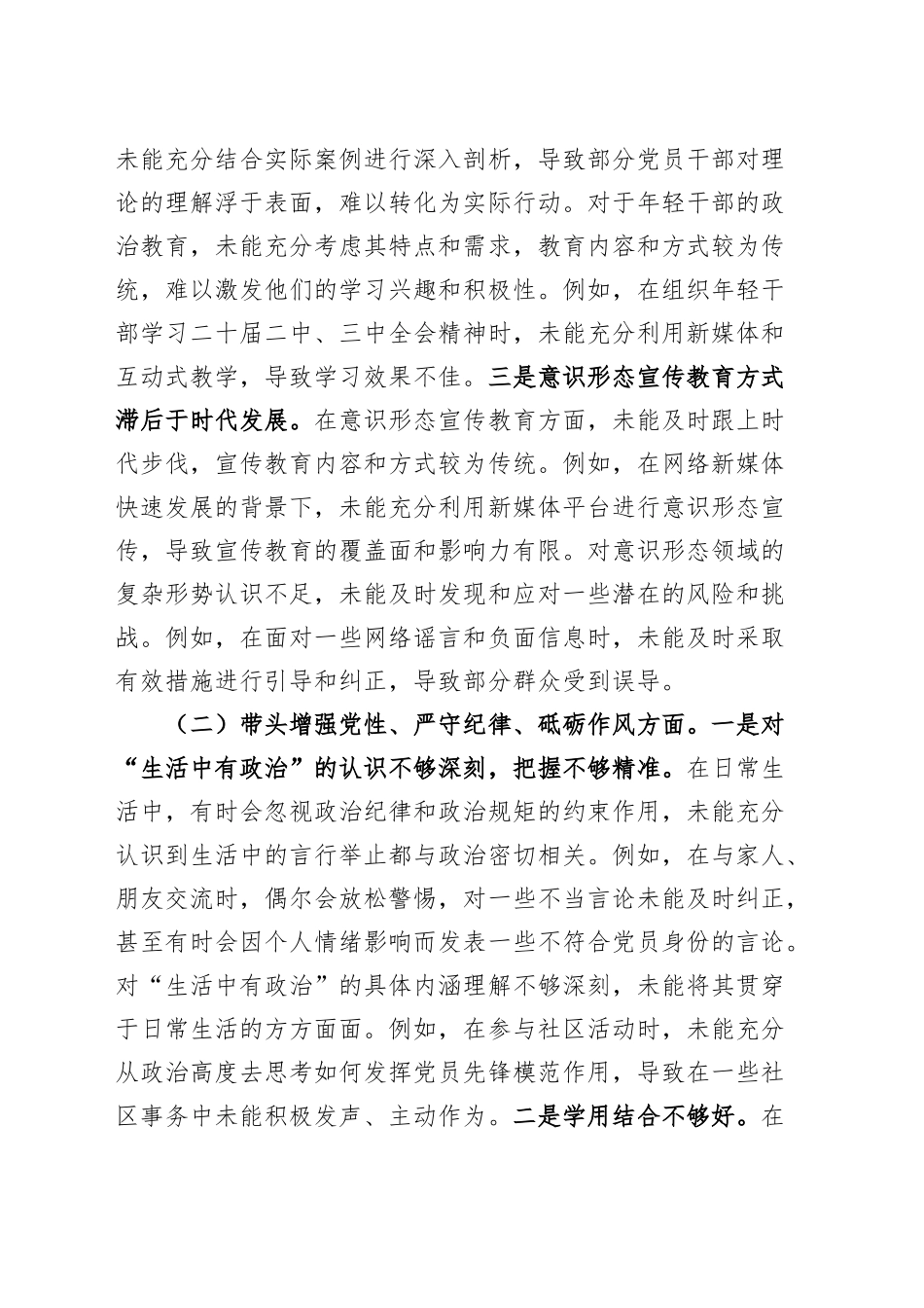 2024年度民主生活会、组织生活会个人对照检查发言材料(四个带头)(1)根据市委《关于召开2024年度民主生活会的通知》有关要求和局党组相关工作部署,我紧扣本次专题民主生活会主题,聚焦“四个带头”总体要求,坚持问题导向,认真学习研讨,开展谈心谈话,深入查摆和梳理自身存在的问题,深刻剖析原因,并提出整改方案,落实整改措施。按照会议安排,现对照检查如下:一、存在的主要问题(一)带头严守政治纪律和政治规矩,维护党的团结统一方面。一是对政治信仰的重要作用认识不够深刻。虽然始终坚定政治信仰,但在实际工作中,未能充分认识到政治信仰对工作的引领作用。例如,在面对复杂多变的工作任务时,有时会因任务繁重而忽视从政治高度去思考和谋划工作,导致工作推进不够系统、全面。例如,在推进某项重大改革项目时,未能充分从政治大局出发,导致在项目初期出现了一些协调不畅的问题,影响了整体进度。对政治信仰的内涵理解不够深入,未能将其与日常工作紧密结合。在组织学习和讨论时,有时会因缺乏深入思考而流于形式,未能真正将政治信仰内化于心、外化于行。二是强化政治教育的方式单一。在组织政治教育时,形式较为单一,多以集中学习、传达文件为主,缺乏创新性和针对性。例如,在学习习近平新时代中国特色社会主义思想时,未能充分结合实际案例进行深入剖析,导致部分党员干部对理论的理解浮于表面,难以转化为实际行动。对于年轻干部的政治教育,未能充分考虑其特点和需求,教育内容和方式较为传统,难以激发他们的学习兴趣和积极性。例如,在组织年轻干部学习二十届二中、三中全会精神时,未能充分利用新媒体和互动式教学,导致学习效果不佳。三是意识形态宣传教育方式滞后于时代发展。在意识形态宣传教育方面,未能及时跟上时代步伐,宣传教育内容和方式较为传统。例如,在网络新媒体快速发展的背景下,未能充分利用新媒体平台进行意识形态宣传,导致宣传教育的覆盖面和影响力有限。对意识形态领域的复杂形势认识不足,未能及时发现和应对一些潜在的风险和挑战。例如,在面对一些网络谣言和负面信息时,未能及时采取有效措施进行引导和纠正,导致部分群众受到误导。(二)带头增强党性、严守纪律、砥砺作风方面。一是对“生活中有政治”的认识不够深刻,把握不够精准。在日常生活中,有时会忽视政治纪律和政治规矩的约束作用,未能充分认识到生活中的言行举止都与政治密切相关。例如,在与家人、朋友交流时,偶尔会放松警惕,对一些不当言论未能及时纠正,甚至有时会因个人情绪影响而发表一些不符合党员身份的言论。对“生活中有政治”的具体内涵理解不够深刻,未能将其贯穿于日常生活的方方面面。例如,在参与社区活动时,未能充分从政治高度去思考如何发挥党员先锋模范作用,导致在一些社区事务中未能积极发声、主动作为。二是学用结合不够好。在学习党纪党规和习近平新时代中国特色社会主义思想时,存在学用脱节的现象。虽然能够认真学习理论知识,但在实际工作中,未能将理论与实践紧密结合,导致工作效果不够理想。例如,在处理一些复杂问题时,未能充分运用所学理论进行分析和解决,导致问题久拖不决。三是对理论学习的深度和广度把握不够,未能做到系统学习、全面领会。例如,在学习党的二十届二中、三中全会精神时,仅停留在对文件的表面理解上,未能深入挖掘其精神实质和核心要义,导致在实际工作中难以有效运用。纪律自觉尚未完全转化为日常习惯和行动准绳虽然能够严格遵守党纪党规,但在日常工作中,有时会因工作繁忙而放松对纪律的自我约束。例如,在执行请示报告制度时,偶尔会出现口头报告代替书面报告的情况,未能将纪律要求完全内化为日常习惯。对纪律的敬畏之心有所减弱,未能时刻以高标准严格要求自己。例如,在一些非工作时间的场合,未能严格遵守廉洁自律各项规定,存在一定的廉政风险。(三)带头在遵规守纪、清正廉洁前提下勇于担责、敢于创新方面。一是创新思维能力有待提升。在工作中,习惯于按照传统模式和经验开展工作,缺乏创新意识和创新思维。例如,在推动重点项目时,未能充分运用新的理念和技术手段,导致项目推进速度较慢。...