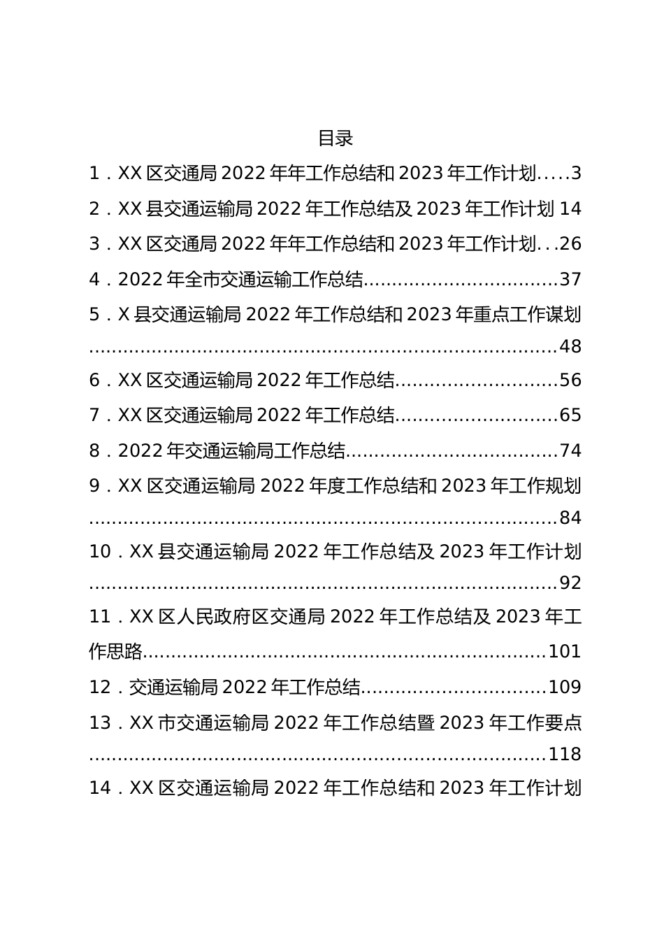 目录1.XX区交通局2022年年工作总结和2023年工作计划.....32.XX县交通运输局2022年工作总结及2023年工作计划143.XX区交通局2022年年工作总结和2023年工作计划...264.2022年全市交通运输工作总结..................................375.X县交通运输局2022年工作总结和2023年重点工作谋划..................................................................................486.XX区交通运输局2022年工作总结............................567.XX区交通运输局2022年工作总结............................658.2022年交通运输局工作总结.....................................749.XX区交通运输局2022年度工作总结和2023年工作规划..................................................................................8410.XX县交通运输局2022年工作总结及2023年工作计划..................................................................................9211.XX区人民政府区交通局2022年工作总结及2023年工作思路.......................................................................10112.交通运输局2022年工作总结................................10913.XX市交通运输局2022年工作总结暨2023年工作要点................................................................................11814.XX区交通运输局2022年工作总结和2023年工作计划................................................................................12715.XX区交通运输局2022年工作总结和2023年重点工作计划..........................................................................13516.XX市交通运输局2022年工作总结及2023年工作思路................................................................................14317.XX市交通运输局2022年度工作总结.....................15818.XX交通运输局2023年工作计划和2022年工作总结...173XX县交通运输局2022年工作总结及2023年工作计划...185XX县交通运输局2022年工作总结及2023年工作计划................................199XX县交通运输局2022年工作总结................................................................................21419.XX市交通运输局2022年度工作总结.....................22120.XX区住房建设(交通)局2022年工作总结及2023年工作计划....................................................................22921.XX县交通运输局2022年工作总结和2023年工作思路................................................................................23522.XX市交通运输局2022年工作总结........................24823.XX市XX区交通运输局2022年交通主要工作总结及2023年工作安排........................................................26024.市交通运输局2022年度工作总结..........................27125.XX县交通运输局2022年工作总结及2023年工作谋划................................................................................28226.XX市XX区交通运输局2022年工作总结................29227.XX区交通运输局2022年工作总结及2023年工作计划................................................................................29928.XX区交通运输局2022年度工作总结及2023年工作计划.............................................................................30729.县交通运输局2022年工作总结2023年工作思路....31730.县交通运输局2022年工作总结及2023年工作打算.32431.XX县交通运输局2022年工作总结及2023年工作计划-年度计划.................................................................33132.XX县交通运输局2022年工作总结暨2023年工作计划...341XX市交通运输局2022年工作总结和2023年工作设想................................................................................34833.XX县交通运输局2022年工作总结和2023年工作计划......