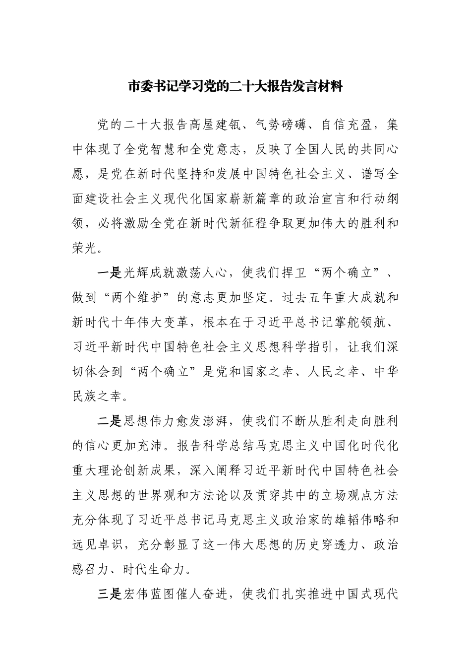 市委书记学习党的二十大报告发言材料党的二十大报告高屋建瓴、气势磅礴、自信充盈,集中体现了全党智慧和全党意志,反映了全国人民的共同心愿,是党在新时代坚持和发展中国特色社会主义、谱写全面建设社会主义现代化国家崭新篇章的政治宣言和行动纲领,必将激励全党在新时代新征程争取更加伟大的胜利和荣光。一是光辉成就激荡人心,使我们捍卫“两个确立”、做到“两个维护”的意志更加坚定。过去五年重大成就和新时代十年伟大变革,根本在于习近平总书记掌舵领航、习近平新时代中国特色社会主义思想科学指引,让我们深切体会到“两个确立”是党和国家之幸、人民之幸、中华民族之幸。二是思想伟力愈发澎湃,使我们不断从胜利走向胜利的信心更加充沛。报告科学总结马克思主义中国化时代化重大理论创新成果,深入阐释习近平新时代中国特色社会主义思想的世界观和方法论以及贯穿其中的立场观点方法充分体现了习近平总书记马克思主义政治家的雄韬伟略和远见卓识,充分彰显了这一伟大思想的历史穿透力、政治感召力、时代生命力。三是宏伟蓝图催人奋进,使我们扎实推进中国式现代化的思路更加清晰。报告历史性地谋划提出新时代新征程党的中心任务,强调坚持以中国式现代化推进中华民族伟大复兴,深刻阐释了中国式现代化的重要特征、本质要求战略安排和重大原则,展现了我们党作为百年大党的政治智慧、战略定力和奋进姿态。四是斗争形势深刻变化,使我们继续深化自我革命的头脑更加警醒。报告贯穿着强烈的责任担当、忧患意识、斗争意志,帮助我们读懂“关键在党”,告诫我们“四大考验”“四种危险”长期存在,必须始终牢记“三个务必”,深刻领会“两个永远在路上”,持之以恒推进全面从严治党。同全国全省一样,党的十八大以来xx各项事业也走过了不平凡历程、取得了历史性成就,是新时代十年伟大变革的生动缩影。十年间,让全市人民倍感温暖、倍感振奋倍感自豪的是总书记的一份嘱托和一封回信。一份嘱托,就是2013年3月8日,总书记殷切嘱托我们“把周总理的家乡建设好,很有象征意义”。这些年来我们以总书记嘱托为遵循,全力加快经济转型、深化改革开放、推动城乡融合、促进富民增收,与全省一道高水平全面建成小康社会,交出了“强富美高”新xx建设的xx答卷。一封回信,就是2021年5月30日,总书记给我市xx小学少先队员回信。去年以来,我们以总书记重要回信为动力,谋划确立聚焦打造“绿色高地、枢纽新城”、全面建设长三角北部现代化中心城市的奋斗目标,制定实施“153”发展战略,推动经济社会发展呈现“稳中有进、进中提质”良好态势。回首十年,我们越来越深切地体会到,事业发展每一次进步、挑战面前每一次胜利,都是坚决听从总书记号令的结果,都是认真践行习近平新时代中国特色社会主义思想的结果。迈向新时代新征程,我们将以党的二十大精神为指引——始终紧跟习近平总书记步伐向前进,坚定捍卫“两个确立”、做到“两个维护”,坚决落实总书记重要指示要求和党中央重大决策部署,以矢志跨越赶超、追逐复兴梦想的实际行动和过硬成果,展示建设好周总理家乡的“象征意义”,为xx“扛起新使命、谱写新篇章”作出xx贡献。始终沿着中国式现代化道路向前进,紧扣高质量发展这一首要任务,深刻领悟省委“xx正处在‘重塑’发展阶段”的重要判断,完整准确全面贯彻新发展理念,坚持对标找差、补短强特科学方法,树牢项目为王、环境是金工作导向,加速产业结构、中心城市功能、交通地位“三个重塑”,努力在推动高质量发展中实现跨越赶超;突出用好文化、生态等特色资源,以持续擦亮四张名片为抓手提升城市影响力,以深化生态产品价值实现机制试点为引领探索绿色转型新路,不断增创新优势、激发新动能。始终为了人民美好生活追求向前进,坚持以人民为中心的发展思想,聚焦共同富裕目标,一方面富“口袋”,完善就业创业扶持、社会保障、困难群众帮扶救助等各方面制度,稳步提升教育、医疗、“一老一幼”等基本公共服务供给水平,深入实施“三级先导”工程、加快乡村全面振兴;另一方面富“脑袋”,加快建设高水平文明城市打造“为中华之崛起而读书”书香xx品牌,协调推进物质文明、精神...