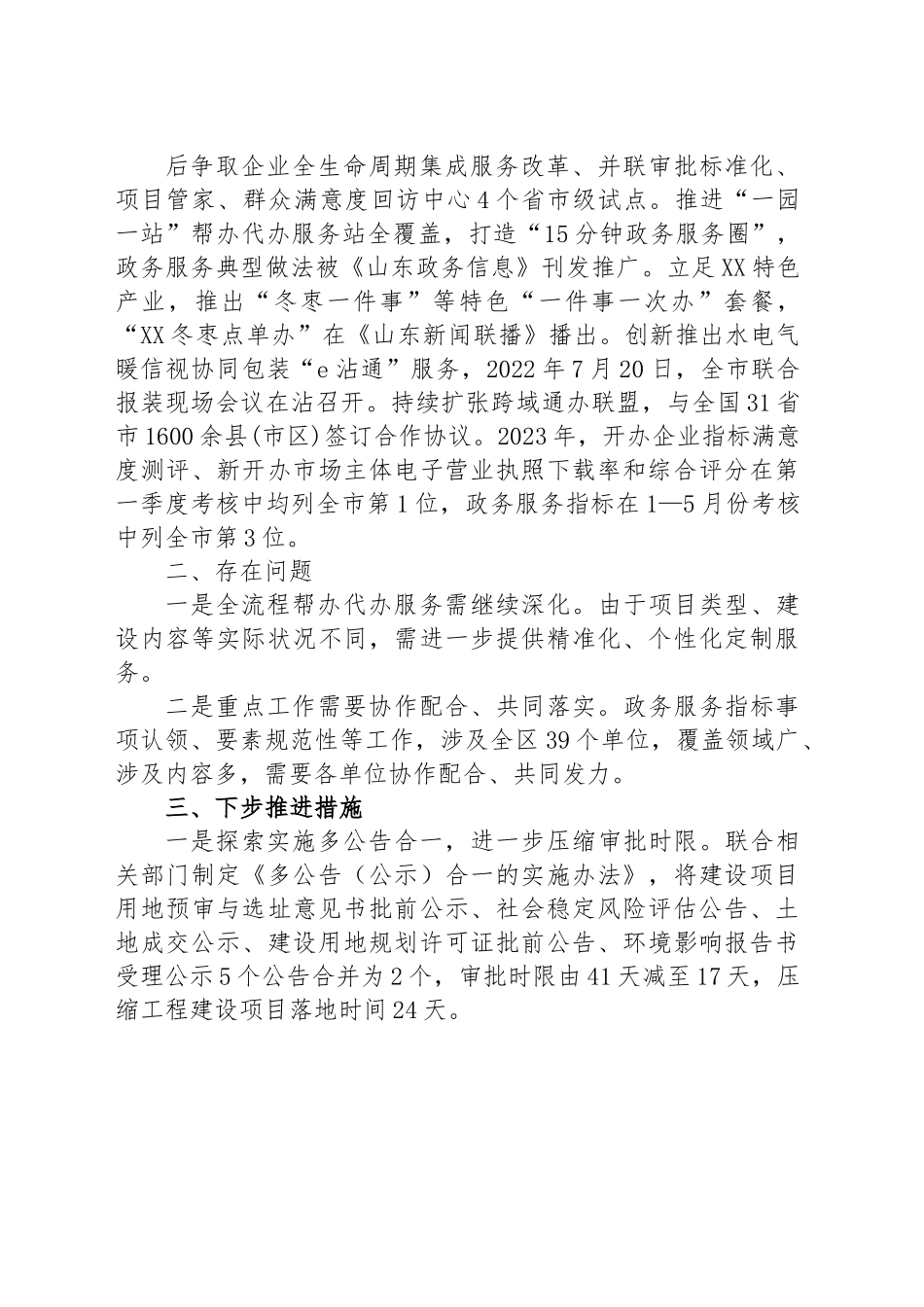 XX市XX区行政审批服务局2023年上半年工作进展情况报告一、工作开展情况一是思维转变,早介入、迎上前、解难题。全力推行大导服、小窗口、微审批服务模式,将指导和服务挺在前、干在先,建立导服帮办区,配备帮办代办员提供咨询引导和资料整理、系统填报等帮办服务。优化窗口设置,全区1324项依申请政务服务事项全部纳入9个综合受理窗口实行“一站式”办理。大力推行“互联网+政务服务”,加快推进线下一窗、线上一网深度融合,实现“不见面+无感”审批服务。以“解放思想大讨论”和“在知爱建”主题实践活动为契机,深化落实“大干2023”工作要求,以实干争先谋突破。坚持有解思维和问题导向,树牢“依法有法办、有法依法办”理念,“不说不行,只说怎么行”,让企业“难事线上有人帮,急事不跑也能办”。二是服务求变,上门办、帮代办、亲清办。全面推行直通园区、项目、企业、现场、老总、问题“六个直通”的“一线工作法”,主动为企送证、遍访企业。组建132人的“项目管家”队伍,为76个重点项目提供“一对一”上门服务,为28个项目量身打造专属审批流程图。4月10日,联合区纪委监委开展了护航优化营商环境助企“廉”心服务活动,征集各单位在政策落实、廉洁履职等7个方面的问题线索,让企业群众和政府之间建立起了联络交流的“连心桥”。三是变中向新,争试点、创亮点、奔一流。2022年以来,先后争取企业全生命周期集成服务改革、并联审批标准化、项目管家、群众满意度回访中心4个省市级试点。推进“一园一站”帮办代办服务站全覆盖,打造“15分钟政务服务圈”,政务服务典型做法被《山东政务信息》刊发推广。立足XX特色产业,推出“冬枣一件事”等特色“一件事一次办”套餐,“XX冬枣点单办”在《山东新闻联播》播出。创新推出水电气暖信视协同包装“e沾通”服务,2022年7月20日,全市联合报装现场会议在沾召开。持续扩张跨域通办联盟,与全国31省市1600余县(市区)签订合作协议。2023年,开办企业指标满意度测评、新开办市场主体电子营业执照下载率和综合评分在第一季度考核中均列全市第1位,政务服务指标在1—5月份考核中列全市第3位。二、存在问题一是全流程帮办代办服务需继续深化。由于项目类型、建设内容等实际状况不同,需进一步提供精准化、个性化定制服务。二是重点工作需要协作配合、共同落实。政务服务指标事项认领、要素规范性等工作,涉及全区39个单位,覆盖领域广、涉及内容多,需要各单位协作配合、共同发力。三、下步推进措施一是探索实施多公告合一,进一步压缩审批时限。联合相关部门制定《多公告(公示)合一的实施办法》,将建设项目用地预审与选址意见书批前公示、社会稳定风险评估公告、土地成交公示、建设用地规划许可证批前公告、环境影响报告书受理公示5个公告合并为2个,审批时限由41天减至17天,压缩工程建设项目落地时间24天。二是聚焦企业全生命周期,提升集成化服务水平。推行企业开办一个平台,公章、社保等6项业务与营业执照同步办理,个体工商户等3类市场主体实现“无人工干预”办理营业执照。不断增强企业开办、企业准营、企业注销等5个企业“一件事一次办”体验感,再推出一批点单办产业清单。三是推进政务服务“双百工程”,便利基层办事。上线政务服务“百事通”2.0版,推动县乡“1+12”位置导航、事项查询、帮办代办等服务高度集成。10月底前,至少在全区建立建成100个村(社区)便民服务站,真正打通服务群众“最后一公里”。