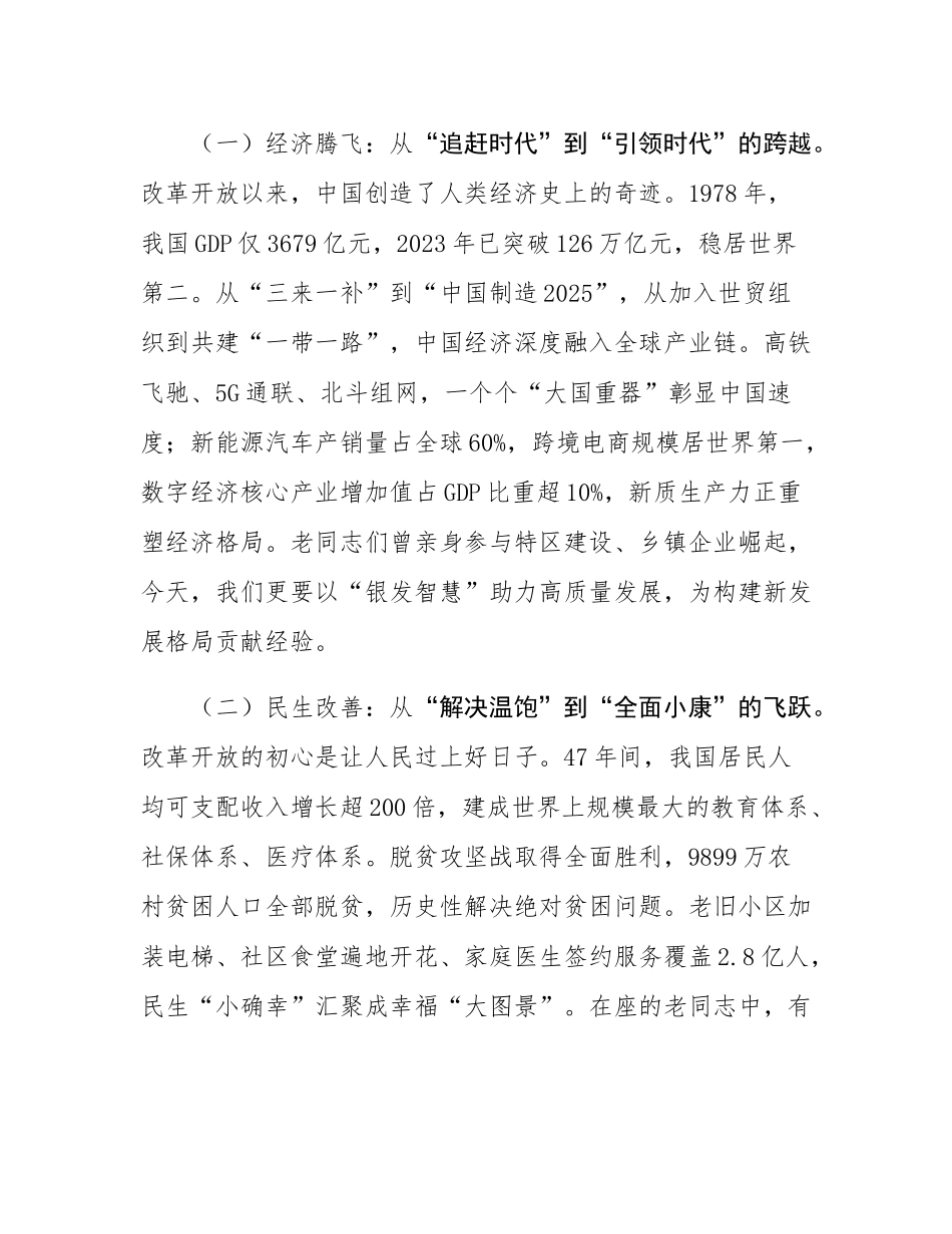 组织部部长在2025年端午节老干系统“我看改革开放新成就”文艺汇演致辞尊敬的各位老领导、老同志们:大家上午好!粽香飘溢的端午时节,我们齐聚一堂,以“我看改革开放新成就”为主题举办文艺汇演,既是对中华优秀传统文化的深情传承,更是对改革开放伟大征程的集体礼赞。在此,我谨代表组织部,向各位老领导、老同志致以节日的问候和崇高的敬意!向为改革开放事业奋斗终身的前辈们表示衷心的感谢!改革开放是党和人民大踏步赶上时代的重要法宝,是坚持和发展中国特色社会主义的必由之路。47年来,中国从“站起来”到“富起来”,再到“强起来”,每一步跨越都凝聚着老一辈开拓者的智慧与汗水。今天,我们以文艺之名回望征程,既要感悟改革开放的磅礴力量,更要传承老同志的初心使命,凝聚起奋进新时代的银发力量。下面,我围绕三个主题与大家交流:一、改革开放铸就千秋伟业,中国式现代化书写壮丽篇章(一)经济腾飞:从“追赶时代”到“引领时代”的跨越。改革开放以来,中国创造了人类经济史上的奇迹。1978年,我国GDP仅3679亿元,2023年已突破126万亿元,稳居世界第二。从“三来一补”到“中国制造2025”,从加入世贸组织到共建“一带一路”,中国经济深度融入全球产业链。高铁飞驰、5G通联、北斗组网,一个个“大国重器”彰显中国速度;新能源汽车产销量占全球60%,跨境电商规模居世界第一,数字经济核心产业增加值占GDP比重超10%,新质生产力正重塑经济格局。老同志们曾亲身参与特区建设、乡镇企业崛起,今天,我们更要以“银发智慧”助力高质量发展,为构建新发展格局贡献经验。(二)民生改善:从“解决温饱”到“全面小康”的飞跃。改革开放的初心是让人民过上好日子。47年间,我国居民人均可支配收入增长超200倍,建成世界上规模最大的教育体系、社保体系、医疗体系。脱贫攻坚战取得全面胜利,9899万农村贫困人口全部脱贫,历史性解决绝对贫困问题。老旧小区加装电梯、社区食堂遍地开花、家庭医生签约服务覆盖2.8亿人,民生“小确幸”汇聚成幸福“大图景”。在座的老同志中,有人曾参与希望工程、春蕾计划,有人为医保改革奔走呼吁,正是这份“以人民为中心”的坚守,让改革成果惠及亿万百姓。(三)文化繁荣:从“打开国门”到“自信自强”的升华。改革开放不仅是物质的丰盈,更是精神的觉醒。从《红楼梦》等经典著作被译成多国文字、成为世界文学宝库中的璀璨明珠,到《流浪地球》以中国视角开启科幻元年、展现人类命运共同体的宏大愿景;从非遗技艺通过数字化手段实现活态传承,让千年匠心在新时代焕发新生,到数字敦煌利用高科技让千年壁画“触手可及”、跨越时空与世界对话,中华文化在交流互鉴中不断拓展传播半径。端午节申遗成功让屈原的爱国情怀成为全人类共同的精神财富,二十四节气入选非遗让东方智慧照亮现代生活,这些传统文化符号如同文化基因链上的闪亮节点,成为连接古今、沟通中外的桥梁。老同志们是文化传承的“活字典”,你们笔下的回忆录记载着烽火岁月中的文化坚守,口述的历史课诠释着革命年代的信仰力量,这些珍贵的精神财富正是让红色基因代代相传、让中华文脉永续流淌的“精神密码”。二、老干部是改革开放的见证者、参与者和贡献者(一)回望来时路,老同志是改革事业的“拓荒牛”。特区建设初期,是你们在蛇口“开山炮”声中破除思想坚冰,用“时间就是金钱,效率就是生命”的呐喊唤醒改革开放的春天;国企改革浪潮中,是你们以“壮士断腕”的勇气推动转型,在职工安置率达98%的艰巨任务中展现责任担当;扶贫攻坚战场上,是你们扎根山村带领群众修路架桥,用“不获全胜决不收兵”的誓言镌刻脱贫奇迹。一位退休老干部曾动情地说:“我们这一代人,把青春献给了改革开放,看着国家从贫弱到富强,比什么都值!”这种“敢为天下先”的精神,如同永不熄灭的火炬,照亮了中国改革最宝贵的财富——人民至上的初心与使命传承。(二)立足新时代,老同志是发展大局的“智囊团”。在乡村振兴一线,老专家们顶着烈日走进田间地头,手把手教授村民草莓立体栽培、稻虾共养等新技术,让昔日贫困村蜕变为年产值破亿的“产业强村”;在社区治理中,老书记带领...