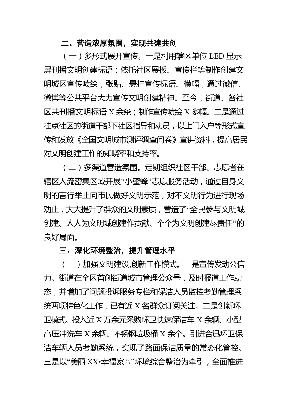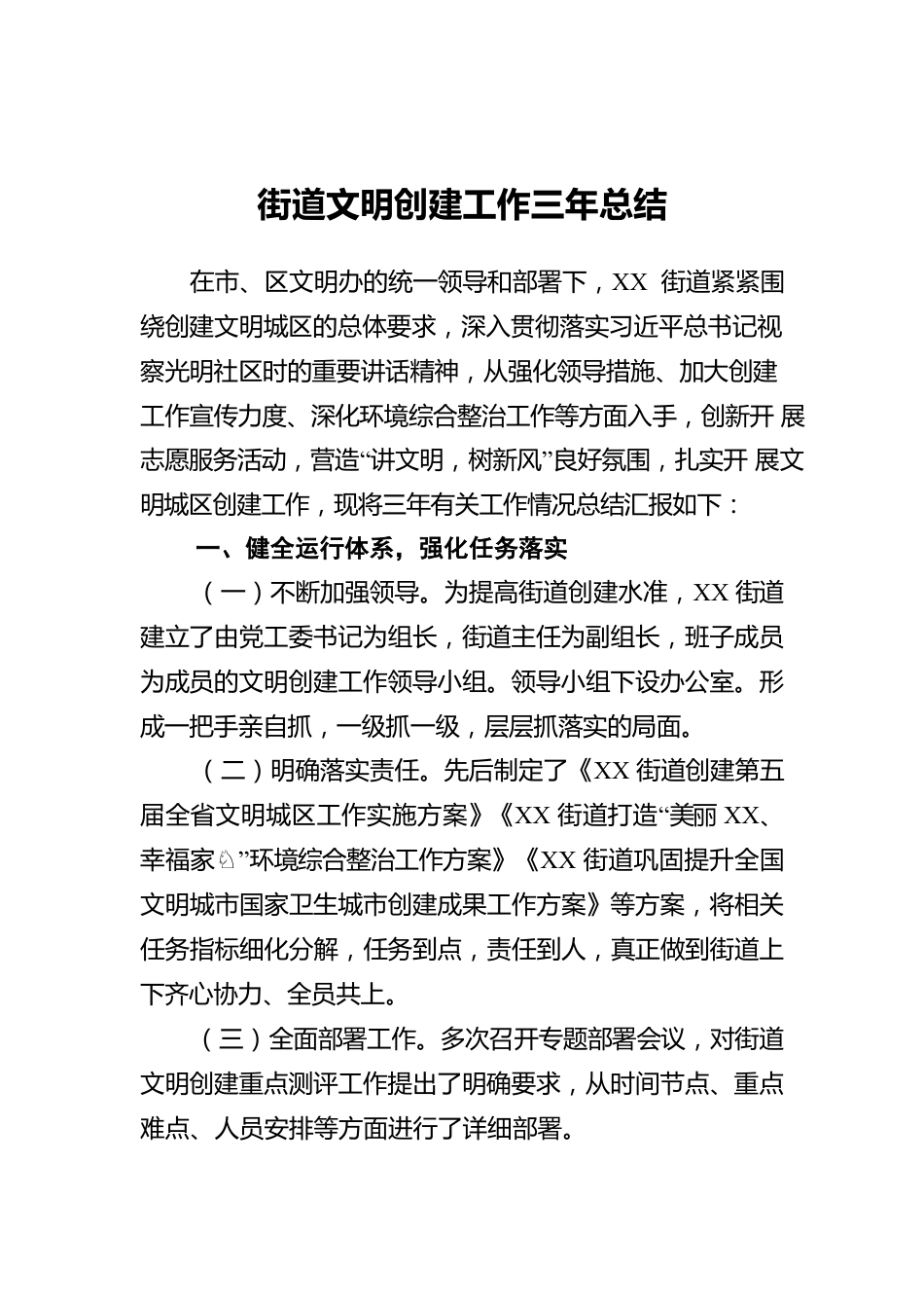 街道文明创建工作三年总结在市、区文明办的统一领导和部署下,XX街道紧紧围绕创建文明城区的总体要求,深入贯彻落实习近平总书记视察光明社区时的重要讲话精神,从强化领导措施、加大创建工作宣传力度、深化环境综合整治工作等方面入手,创新开展志愿服务活动,营造“讲文明,树新风”良好氛围,扎实开展文明城区创建工作,现将三年有关工作情况总结汇报如下:一、健全运行体系,强化任务落实(一)不断加强领导。为提高街道创建水准,XX街道建立了由党工委书记为组长,街道主任为副组长,班子成员为成员的文明创建工作领导小组。领导小组下设办公室。形成一把手亲自抓,一级抓一级,层层抓落实的局面。(二)明确落实责任。先后制定了《XX街道创建第五届全省文明城区工作实施方案》《XX街道打造“美丽XX、幸福家♘”环境综合整治工作方案》《XX街道巩固提升全国文明城市国家卫生城市创建成果工作方案》等方案,将相关任务指标细化分解,任务到点,责任到人,真正做到街道上下齐心协力、全员共上。(三)全面部署工作。多次召开专题部署会议,对街道文明创建重点测评工作提出了明确要求,从时间节点、重点难点、人员安排等方面进行了详细部署。二、营造浓厚氛围,实现共建共创(一)多形式展开宣传。一是利用辖区单位LED显示屏刊播文明创建标语;依托社区展板、宣传栏等制作创建文明城区宣传喷绘,张贴、悬挂宣传标语、横幅;通过微信、微博等公共平台大力宣传文明创建精神。至今,街道、各社区共刊播文明标语X余条;制作宣传喷绘X多幅。二是通过挂点社区的街道干部下社区指导和动员,以上门入户等形式宣传和发放《全国文明城市测评调查问卷》宣讲资料,提高居民对文明创建工作的知晓率和支持率。(二)多渠道营造氛围。定期组织社区干部、志愿者在辖区人流密集区域开展“小蜜蜂”志愿服务活动,通过自身文明的言行举止向市民做好文明示范,对不文明行为进行现场劝止,大大提升了群众的文明素质,营造了“全民参与文明城创建、人人为文明城创建作贡献、个个为文明创建尽责任”的良好局面。三、深化环境整治,提升管理水平(一)加强文明建设,创新工作模式。一是宣传发动公信力。街道在全区首创街道城市管理公众号,及时报道工作动态,并增加了问题投诉服务专栏和保洁人员监控考勤管理系统两项特色化工作,已有近X名群众订阅关注。二是创新环卫模式。投入近X万余元采购环卫快速保洁车X余辆、小型高压冲洗车X余辆、不锈钢垃圾桶X余个。引进合迅环卫保洁车辆人员考勤系统,实现了路面保洁质量的常态化管控。三是以“美丽XX•幸福家♘”环境综合整治为牵引,全面推进社区“微整治”,试点居民生活垃圾分类,打造精品社区庭院X处,文教路X号、文教路X号被评为“最美庭院”。三是制订《XX街道“美丽XX•幸福家♘”社区环境综合整治检查考核办法》,成立社区庭院卫生督查队,每天对全街道社区庭院卫生进行排查并录制问题视频每周通报,及时排查重大问题,每年整改率达100%,实现了辖区“路平道净见本色、线齐物整有秩序、灯亮墙美提形象”的目标。(二)持续精细管理,改善城市面貌。一是针对辖区内广告垃圾屡禁不止的问题,采取疏堵结合的方式,组织两支专业队伍对辖区内12个社区开放式庭院楼道的垃圾广告进行粉刷,同时在庭院主要出入口处制作大型便民服务广告栏,在楼道内制作小型便民服务广告栏,引导规范垃圾广告日常化管理。年均共粉刷楼道X平方米,清理广告垃圾X余条;新增统一大型规范的“便民信息张贴栏”便民服务栏X余块,小型X块,制作卡片式便民服务X余条、便民信报箱X余个。二是坚持以“美丽XX•幸福家♘”环境综合整治活动为抓手,大力实施“两建三改五新六清”庭院微改造工程,年均清理暴露垃圾X处,屋檐顶棚垃圾X处,卫生死角X处,庭院杂物X处,清理楼栋单元X个,整治社区庭院X个,共发动X人次参加劳动。(三)狠抓市容秩序,全面优化环境。一是扎实开展“蓝天行动”,辖区内烧烤店烧烤器具全部更换为无烟烧烤炉。采用“加大巡查、专人负责、严管重罚”的工作方法,联合公安、交警、工商局等部门多次开展整治行动,取缔出店、占道摆摊经营。同时增派夜间巡查人员,加大机动...