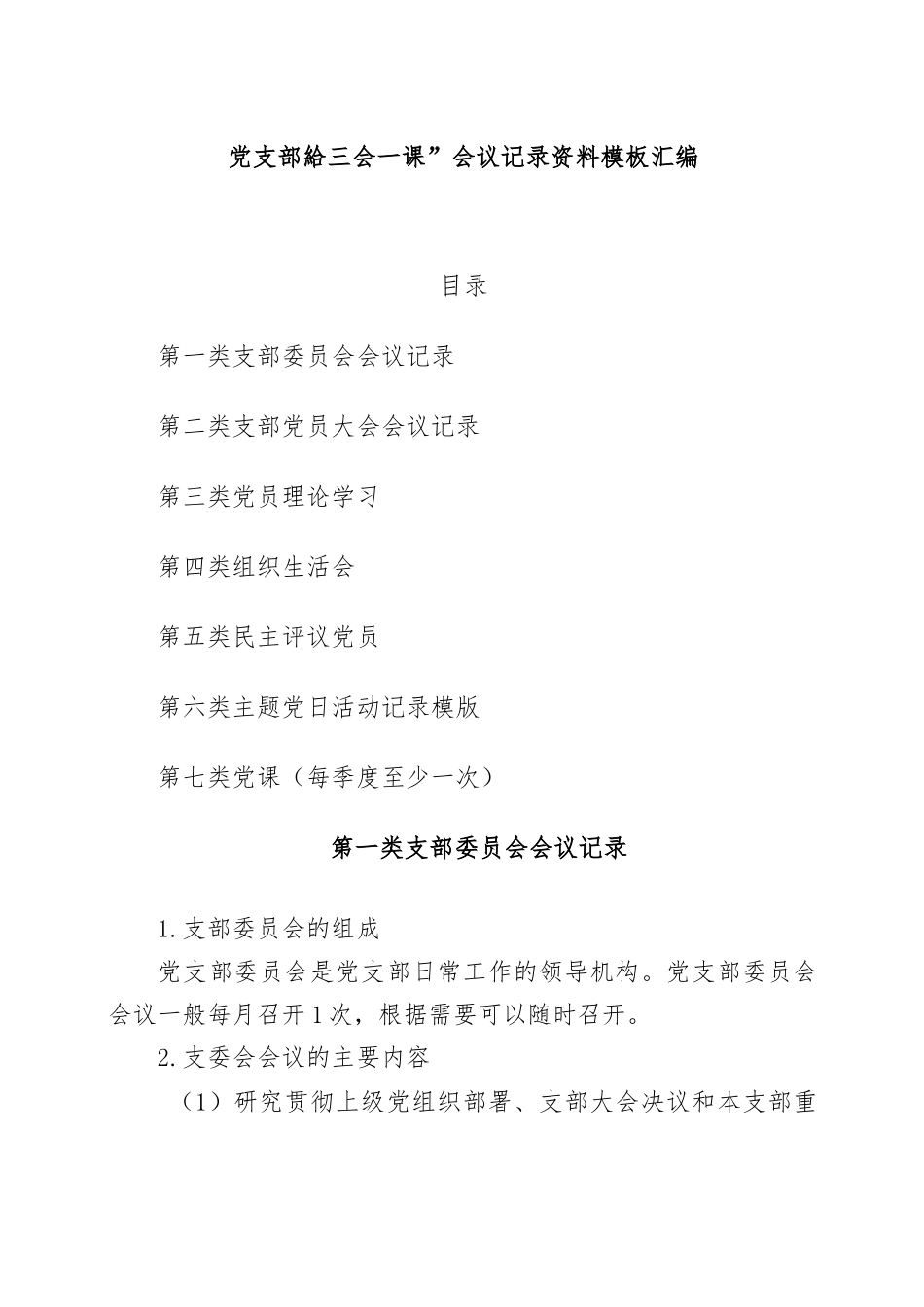 党支部給三会一课”会议记录资料模板汇编目录第一类支部委员会会议记录第二类支部党员大会会议记录第三类党员理论学习第四类组织生活会第五类民主评议党员第六类主题党日活动记录模版第七类党课(每季度至少一次)第一类支部委员会会议记录1.支部委员会的组成党支部委员会是党支部日常工作的领导机构。党支部委员会会议一般每月召开1次,根据需要可以随时召开。2.支委会会议的主要内容(1)研究贯彻上级党组织部署、支部大会决议和本支部重要工作的安排及落实措施。(2)研究加强党支部及支部班子自身建设方面的问题,研究党员日常管理、教育和发展党员等工作。(3)分析党员、群众的思想状况,研究制定做好思想政治工作的措施。(4)研究党内〃创先争优〃评选表彰和向上级推荐各类先进典型以及党员违纪处罚等问题。(5)研究工会、共青团组织的重要工作以及提请职代会审议的问题。(6)研究其他需要集体讨论决定的重要问题。3.支部委员会参加人:全体支委4.支部委员会记录内容:会议时间和地点、会议主持人和记录人、参加人数、缺席委员名单、会议主题、会议内容(发言情况)、会议决议等。5.支部委员会召开方法:(1)会议一般由支部书记主持(若书记不在,可由副书记或支委主持);(2)要有明确议题;(3)要充分发扬民主,畅所欲言;(4)对需要表决的问题,要议而有决。6.支部委员会注意事项:(1)党支部委员会会议须有半数以上委员到会方可进行。半数以上支委到会,并有全体支委半数以上同意,决议生效。(2)重要事项提交党员大会决定前,一般应当经党支部委员会会议讨论。(3)实体经营企业党支部委员会按照〃先党内、后提交〃原则,前置研究讨论企业〃三重一大〃问题,提出明确意见建议。7.支部委员会会议记录模版:会议时间:XXXX年XX月XX0XX时XX分至XX时XX分会议地点:XXXX会议室主持人:张XX参会人员:李XX、赵XX、王XX(要记录姓名)缺席人员:杨XX(如有,请写明缺席原因)列席人员:无(如有,请记录姓名)记录人员:李XX(组织委员)会议议题:一、了解掌握党员近期情况,做好思想政治工作。二、学习贯彻习近平总书记浙江考察重要讲话精神。三、讨论研究支部特色党小组建设方案。四、讨论确定入党积极分子。五、讨论确定发展对象。六、研究预备党员转正。七、研究支部下半年工作计划。八、听取XX工作情况汇报。九、讨论人员分工调整。会议记录:张XX(党支部书记主持会议):根据支部工作安排,今天我们召开XX月份支委会,会议应到委员5名,实到4名,1人缺席,到会人数超过应到会人数的半数,符合法定人数要求,可以开会会前,支委委员在充分沟通的情况下确定了XX项议题,并将会议要求和相关学习资料提前发给大家做了会前准备。首先进行第一项议题:了解掌握党员近期情况,做好思想政治工作。请组织委员李XX同志介绍相关情况。李XX:3月1日至今,支部XX名党员全员到岗,按时上下班。大家在思想上工作上学习上发现的问题以上是了解的支部党员近期情况。张XX:针对当前疫情防控形式和了解的党员情况,请大家分别就如何强化支部党员思想政治教育,加强政治理论学习,帮助大家解决工作、生活上的实际困难展开讨论,并分别说说个人的看法。(讨论过程)李XX:建议赵XX:应该王XX:重视张XX:大家刚才已经分别谈了自己的想法,支部要按照年初制定的方案认真开展各项工作,要在抓好疫情防控底线要求不放松的情况下,关心关怀困难党员,通过结对子的方式帮助困难党员解决实际问题,让其感受到组织的温暖。张XX:下面进行第二项议题:学习贯彻习近平总书记浙江考察重要讲话精神。请宣传委员赵XX带领大家开展集中学习。赵XX:同志们下午好,接下来大家一起学习习近平总书记浙江考察重要讲话精神。3月29日至4月1日,习近平在浙江考察,就统筹推进新冠肺炎疫情防控和经济社会发展工作进行调研。习近平在考察时强调,要全面贯彻党中央各项决策部署,做好统筹推进新冠肺炎疫情防控和经济社会发展工作,坚持稳中求进工作总基调,坚持新发展理念,坚持以〃八八战略〃为统领,干在实处、走在前列、勇立潮头,精准落实疫情防控和复工复产各项举措,奋力实现今年经济社会发展目标任务...