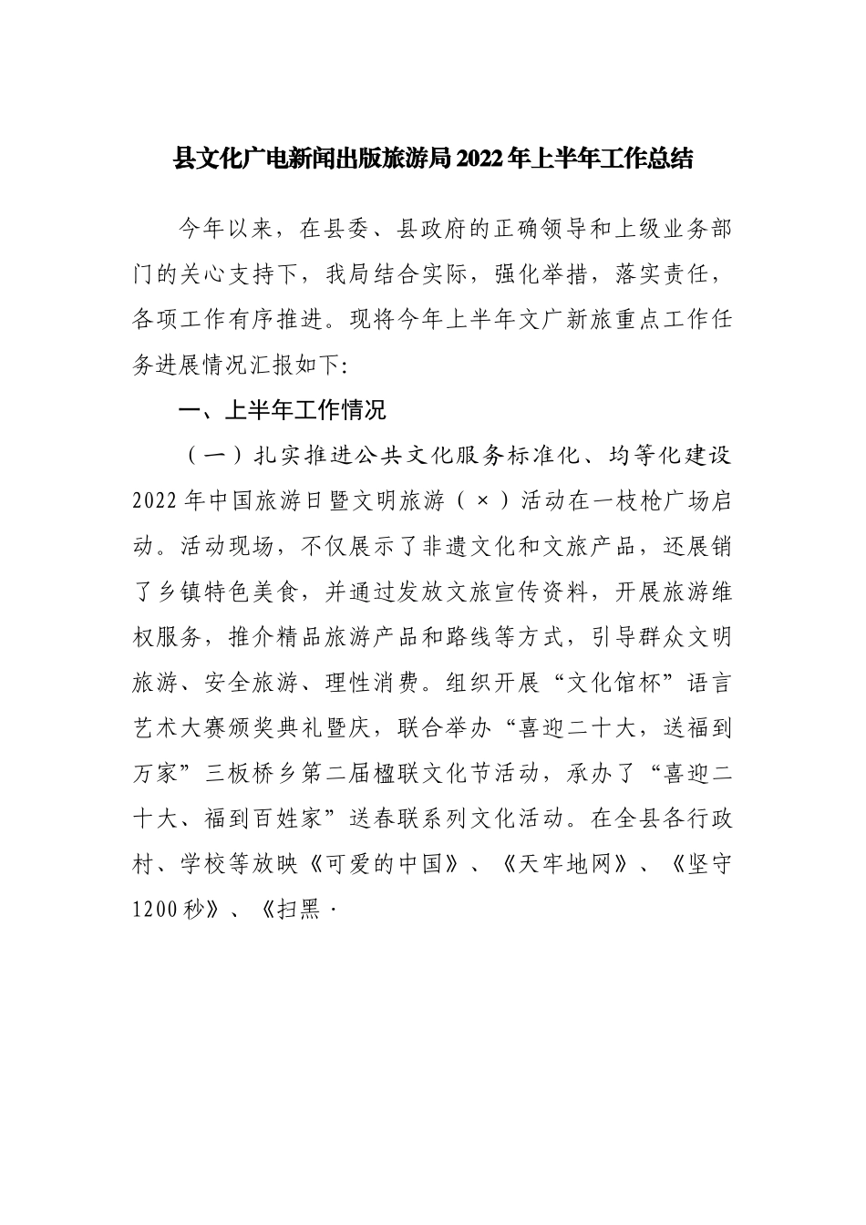 县文化广电新闻出版旅游局2022年上半年工作总结今年以来,在县委、县政府的正确领导和上级业务部门的关心支持下,我局结合实际,强化举措,落实责任,各项工作有序推进。现将今年上半年文广新旅重点工作任务进展情况汇报如下:一、上半年工作情况(一)扎实推进公共文化服务标准化、均等化建设2022年中国旅游日暨文明旅游(×)活动在一枝枪广场启动。活动现场,不仅展示了非遗文化和文旅产品,还展销了乡镇特色美食,并通过发放文旅宣传资料,开展旅游维权服务,推介精品旅游产品和路线等方式,引导群众文明旅游、安全旅游、理性消费。组织开展“文化馆杯”语言艺术大赛颁奖典礼暨庆,联合举办“喜迎二十大,送福到万家”三板桥乡第二届楹联文化节活动,承办了“喜迎二十大、福到百姓家”送春联系列文化活动。在全县各行政村、学校等放映《可爱的中国》、《天牢地网》、《坚守1200秒》、《扫黑·决战》等优秀爱国主义电影929余场。县图书馆每周开放60小时,坚持节假日正常开放,各阅览室和阅览设备免费开放,并及时安排新书上架,保障读者基本文化权益,为读者阅读提供方便,共接待读者5.7万人次,办理阅览证约400张,外借书刊4.8万册次。发布线上推文300余条,内容包含图书荐读、绘本故事、党史学习、展览讲座、节日节气等多方面的信息。在节假日、读书日、服务宣传周等开展征文、诵读、绘画、科普、知识竞答、手工等形式多样的主题活动60余次。在4月23日举办“书香×”全民阅读暨第十二届“读好书”活动启动仪式,在5月28日举办喜迎二十大“悦”读引领未来——2022年图书馆服务宣传周暨庆“六一”活动。举办图片展7次、专题培训和讲座6次、各类影视展播150余次,受到读者一致好评。(二)实施文化旅游项目建设。一是做好全域旅游发展特色区指挥部日常组织协调工作。建立完善调度制度,健全信息共享和协同机制,制定行动方案、重点事项和重点项目,明晰工作思路,突出重点,精准发力。二是加强沟通协调,做好九项重大文旅项目和七个重点事项的调度及时汇总上报项目进展情况和存在问题。三是做好省级全域旅游示范区创建相关工作。对照验收标准,围绕全域旅游体制机制、政策保障、公共服务、供给体系、秩序与安全、资源与环境、品牌影响、创新示范八项指标,明确工作任务,加强工作部署,逐步推进落实。四是秋收起义纪念地系列景点国家社会事业项目全部完成,并进行验收,正在进行审计工作;投资340万元×一枝枪纪念馆预防性保护项目已完成采购和设备安装,已申请省文旅厅验收;投资292.39万元列宁学校旧址(花塘官厅)消防项目已挂网采购,预计6月进行招投标;投资50.3万元秋收起义高滩行军会议旧址王氏初始祠文物维修设计方案,已上报省厅进行项目批复。(三)加强文化遗产传承保护。一是不可移动文物保护。积极申报创建江西省革命文物保护利用示范县工作,已上报市文广新旅局。完成刘仁堪故居本体维修以及花塘官厅(列宁学校)安防、防雷省级文物保护资金申报工作。上半年,组织文物安全检查6次,发现安全隐患1处,已完成整改,建立消防微型站2个,更换添置消防设施35件。二是可移动文物保护。馆藏文物按照文物保护安全要求,建立台帐、制定制度、专人负责管理。征集民间木工用具22件。截止5月,×一枝枪纪念馆、花塘官厅、甘祖昌故居、秋收起义高滩行军会议旧址、垄上改编旧址等5处陈列布展接待游客36258人次;“×血鸭”入选国家级非遗文字材料已基本完成,正筹备撰写脚本拍摄申报片;《×苏区舞蹈》、《×红色故事》、《地力神药酒文化》、《×客家绣》、《×采茶戏》、《×岳家四门拳》等6个非遗项目升为市级非遗项目,现已申报省级非遗项目3个,即:《×苏区舞蹈》、《×客家绣》《×采茶戏》。(四)积极实施精品力作工程。充分发挥阵地作用和工作职能,推荐《哦嗬歌》参选全省推介会精品短节目库组织收集整理文字资料,创排《红色背篓》、《×血鸭名远扬》、《×苏区舞蹈》。(五)积极实施品牌创建工作。一是结合乡村振兴战略,大力发展乡村旅游,打造乡村旅游精品。获取更多实用资料,加微信xaddxh推荐甘红初心茶产业园、吉内得国家稻田公园创建省4A、5A级乡村旅游点;...