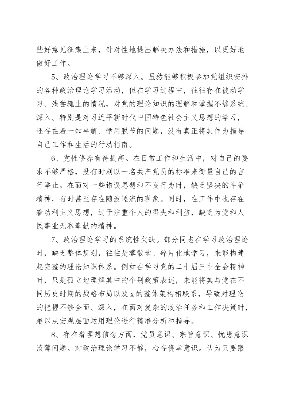 2024年度民主生活会、组织生活会批评与自我批评意见建议(45条)1、学习的自觉性有待加强。xx同志对参加中心组重视程度高、积极性强,但是自学的自觉性不高、主动性不强,致使对新思想理解不够全面、不够系统。2、“学”“用”结合点找的不准。xx同志习惯于用时间和精力处理具体业务工作,但对理论学习不够重视,致使指导开展工作“底子”不厚、本领不够、基础不牢,用习近平新时代中国特色社会主义思想谋划和推动工作与实际结合不够紧密,学以致用的作用没有充分发挥。3、政治理论学习深度不够,平时,自己虽然也重视政治理论的学习,能够及时、认真的学习有关政策,但不够系统,缺乏全面的、系统的钻研精神。仅仅满足于有关安排学习,学过了事,在学习的自觉性方面还存在较大的差距,没有对学过的东西进行认真反思,没有深刻钻研。在以后的工作,我还需认真加以克服和改善。4、深入基层调查研究不够,领导干部与一般职工需要应对面地交心、谈心,从这个角度上讲我做得不细。今后我要进一步牢固树立党的从群众中来,到群众中去的观点,多深入基层,多搞调查研究,了解状况,职工生活和思想状况,多倾听群众推荐,及时掌握干部职工的思想动态和普遍要求,把他们的一些好意见征集上来,针对性地提出解决办法和措施,以更好地做好工作。5、政治理论学习不够深入。虽然能够积极参加党组织安排的各种政治理论学习活动,但在学习过程中,往往存在被动学习、浅尝辄止的情况,对党的理论知识的理解和掌握不够系统、深入。特别是对习近平新时代中国特色社会主义思想的学习,还存在着一知半解、学用脱节的问题,没有真正将其作为指导自己工作和生活的行动指南。6、党性修养有待提高。在日常工作和生活中,对自己的要求不够严格,没有时刻以一名共产党员的标准来衡量自己的言行举止。在面对一些错误思想和不良行为时,缺乏坚决的斗争精神,有时甚至存在随波逐流的现象。同时,在工作中也存在着功利主义思想,过于注重个人的得失和利益,缺乏为党和人民事业无私奉献的精神。7、政治理论学习的系统性欠缺。部分同志在学习政治理论时,缺乏整体规划,往往是零散地、碎片化地学习,未能构建起完整的理论知识体系。例如在学习党的二十届三中全会精神时,只是孤立地理解其中的个别政策表述,未能将其与党在不同历史时期的战略布局以及x的整体架构相联系,导致对理论的把握不够全面、深入,在面对复杂的政治任务和工作决策时,难以从宏观层面运用理论进行精准分析和指导。8、存在着理想信念方面,党员意识、宗旨意识、忧患意识淡薄问题。对政治理论学习不够,心存侥幸意识。认为只要跟着党组织学习就已足够,用心干好本职工作就能够了。没有将加强自我学习提高政治素养放在完善自我的高度,没有自觉和系统地学习党的创新理论,导致自己理论水平不够高。导致对自身世界观、人生观和价值观自我改造重视不够,从而使思想水平在较低层次徘徊,看待问题、分析问题,解决问题潜力明显不够。9、在学懂、弄通、做实上下功夫不够。xx同志无论集体还是个人自学,有时候存在形式主义问题,缺乏深层次的思考,致使所学理论知识联系实际不深、不透。10、学习深度广度有待拓展。xx同志有时思想重视程度不够,参加集体学习不够积极主动,缺乏热情,特别是当具体业务工作与学习矛盾突出时,存在重工作、轻学习的思想,总是以工作忙、任务重、没时间学为由,不能自觉静下心来学习,没有撰写学习心得体会,导致了政治理论学习效果不明显。11、自己的领导艺术和水平还待进一步提高,领导艺术和水平还需要在今后工作中进一步加强。要透过学习,不断提高领导水平,提高明辨是非的潜力,提高政治敏锐性和政治鉴别力,要善于透过现象看本质,站在全局的高度,从整体利益看待问题,解决问题,以适应现代企业管理的需要。12、用心探索xx发展的新路子积极性不够,工作方法创新不多,造成目前招商引资难度很大。因此自己在今后的工作中,更要加强学习,吸收好的经验,切实做好招商工作。13、理想信念不够坚定。随着社会的发展和变革,各种思想观念相互碰撞,自己在一定程度上受到了一些不良思想的影响,对x的信念有所动摇。在工...