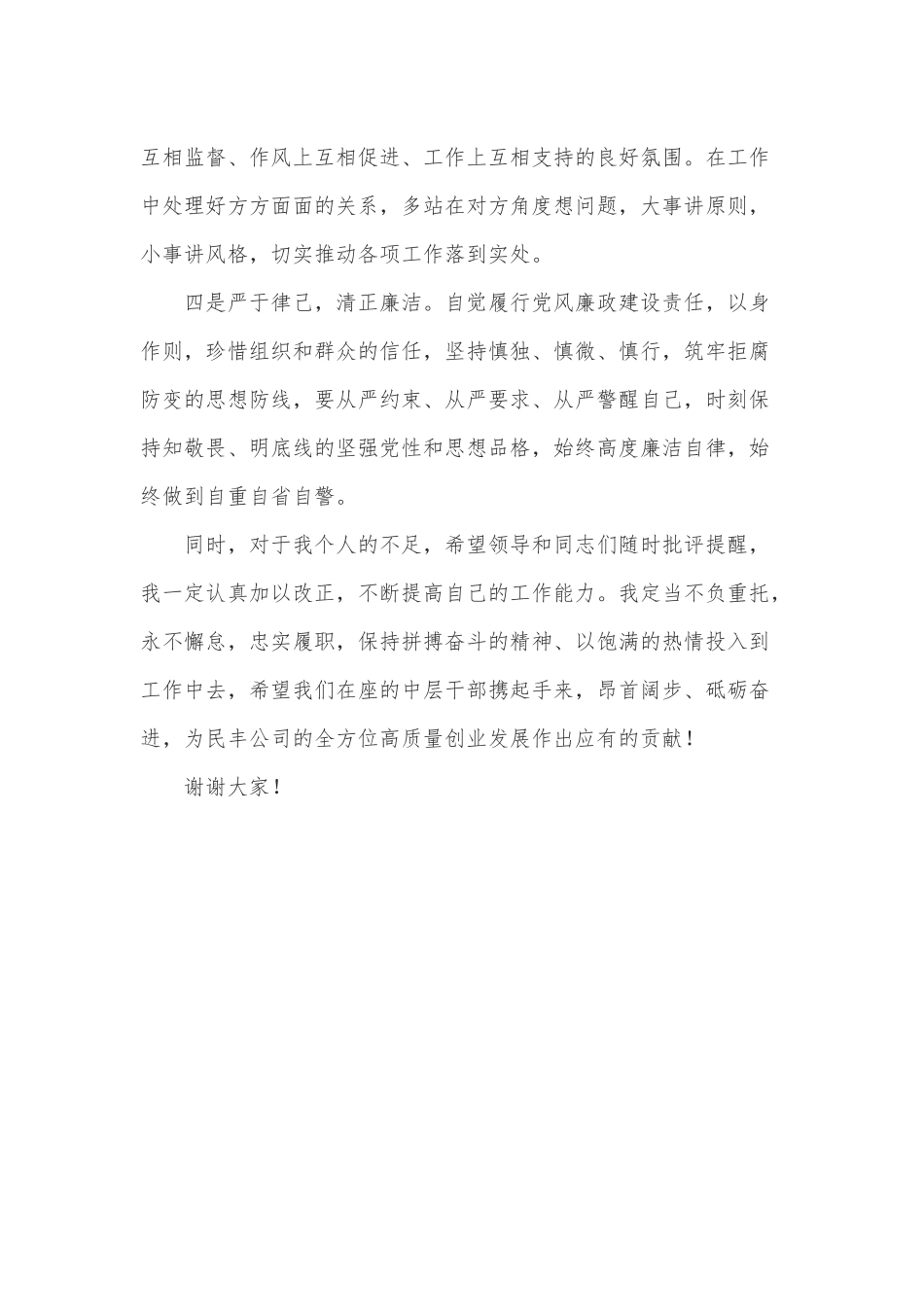 公司综合办公室主任任前表态发言尊敬的各位领导、同志们:这次能被公司党组织推荐到综合办公室主任这个的工作岗位,首先,衷心感谢组织多年来的教育和培养,感谢各位领导的器重和厚爱,感谢公司同事对我的信任和支持!这次任职对我来说,不仅是一种认同与肯定,更是一份希望和重托。我将把今天作为一个新的起点,认真履行职责,注重服务意识,扎实工作,创新实干。在今后的工作中,我将努力做到以下几点:一是加强学习,提高能力。坚持把学习作为履职尽责的第一需要,要始终做到对党忠诚,讲团结、讲奉献,进一步树牢”四个意识”,坚定”四个自信”,切实做到”两个维护”,牢记”两个确立”。同时,加强办公室业务知识的学习,熟练运用办公室工作技能,着力提升研究新情况、解决新问题的能力和水平。二是勤奋工作,认真履职。始终坚持工作上求真务实,坚持围绕民丰公司中心工作,认真做好办文、办事、办会等工作,主动发挥好综合协调、参谋助手、督促检查的作用,着力提升”三服务”工作的能力和水平。按照公司的要求,加强与各部室及上级单位的对接沟通,找准工作的切入点和契合点,在办公服务、后勤保障方面实现突破,实现管理科学化、规范化、制度化,促使公司各项工作稳步推进。三是加强沟通,团结共事。在公司领导的坚强领导下,带领并依靠办公室全体职员努力工作,努力形成一种思想上互相学习、组织上互相监督、作风上互相促进、工作上互相支持的良好氛围。在工作中处理好方方面面的关系,多站在对方角度想问题,大事讲原则,小事讲风格,切实推动各项工作落到实处。四是严于律己,清正廉洁。自觉履行党风廉政建设责任,以身作则,珍惜组织和群众的信任,坚持慎独、慎微、慎行,筑牢拒腐防变的思想防线,要从严约束、从严要求、从严警醒自己,时刻保持知敬畏、明底线的坚强党性和思想品格,始终高度廉洁自律,始终做到自重自省自警。同时,对于我个人的不足,希望领导和同志们随时批评提醒,我一定认真加以改正,不断提高自己的工作能力。我定当不负重托,永不懈怠,忠实履职,保持拼搏奋斗的精神、以饱满的热情投入到工作中去,希望我们在座的中层干部携起手来,昂首阔步、砥砺奋进,为民丰公司的全方位高质量创业发展作出应有的贡献!谢谢大家!