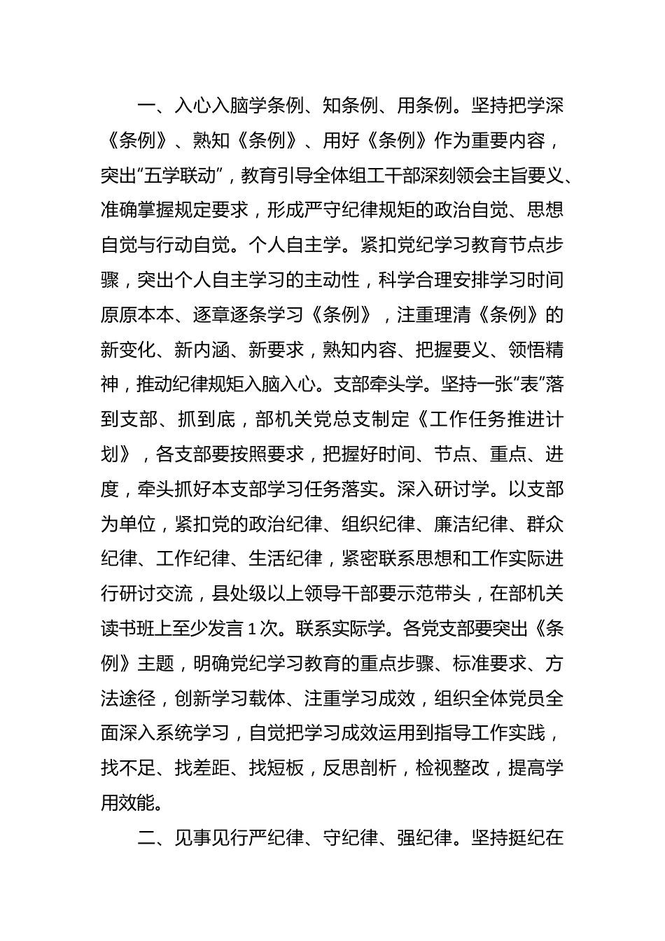 在党纪学习教育阶段性工作总结会上的发言开展好部机关党纪学习教育,要在融合融入上下功夫必须更加注重与科室日常工作深度融合、更加注重与年度重点任务深度融合、更加注重与全州中心大局深度融合、更加注重与今后长远工作深度融合,把科室工作做实、年度工作出彩、长远工作谋深,切实把党纪学习教育激发的内生动力,转化为推动落实的实际业绩。一、入心入脑学条例、知条例、用条例。坚持把学深《条例》、熟知《条例》、用好《条例》作为重要内容,突出“五学联动”,教育引导全体组工干部深刻领会主旨要义、准确掌握规定要求,形成严守纪律规矩的政治自觉、思想自觉与行动自觉。个人自主学。紧扣党纪学习教育节点步骤,突出个人自主学习的主动性,科学合理安排学习时间原原本本、逐章逐条学习《条例》,注重理清《条例》的新变化、新内涵、新要求,熟知内容、把握要义、领悟精神,推动纪律规矩入脑入心。支部牵头学。坚持一张“表”落到支部、抓到底,部机关党总支制定《工作任务推进计划》,各支部要按照要求,把握好时间、节点、重点、进度,牵头抓好本支部学习任务落实。深入研讨学。以支部为单位,紧扣党的政治纪律、组织纪律、廉洁纪律、群众纪律、工作纪律、生活纪律,紧密联系思想和工作实际进行研讨交流,县处级以上领导干部要示范带头,在部机关读书班上至少发言1次。联系实际学。各党支部要突出《条例》主题,明确党纪学习教育的重点步骤、标准要求、方法途径,创新学习载体、注重学习成效,组织全体党员全面深入系统学习,自觉把学习成效运用到指导工作实践,找不足、找差距、找短板,反思剖析,检视整改,提高学用效能。二、见事见行严纪律、守纪律、强纪律。坚持挺纪在前、执纪从严,深入开展以案说德、以案说纪、以案说法以案说责,着力解决对党规党纪不上心、不了解、不掌握等突出问题。挖掘教育资源。精心挑选一系列具有代表性和教育意义的典型案例和忏悔录,特别是精选一批组织部门党员干部违法乱纪的警示教育案例,引导全体组工干部树牢纪律防线、绷紧纪律心弦、守好纪律家园,倾力清扫苗头性、倾向性纪律风险。开展警示教育。结合观看违纪违法干部警示录、专题片、警示教育片,深刻剖析违纪典型案例,深刻认识违纪干部步步走向违法犯罪深渊的思想轨迹、行动轨迹、脱变轨迹,教育引导组工干部扣好守纪守法守规的第一粒扣子。丰富教育形式。以支部为单位,组织全体组工干部对照《条例》要求,深入查找违纪风险点,抓好“三会一课”、用好主题党日,引导全体组工干部明确道德底线、严明党纪国法、普及法律知识、牢记职责使命,注重从身边人身边事中汲取教训,发挥警示作用、强化警示震慑,推动以案促改促治。讲好专题党课。突出主题、讲好党课,由党总支书记在全州组织系统讲1次专题党课,第二支部书记在部机关讲1次纪律党课,第四支部书记为共驻共建单位讲1次党课,第三支部书记同志为机关青年党员干部政治理论学习小组讲1次党课,第一支部书记到支部联建村讲1次党课,切实将纪律规矩意识延伸到基层。三、用情用力求深入、促深入、抓深入。发扬组织部门事事带头、处处表率的传统优良作风,推动部机关党纪学习教育更先一步、更深一层、更强一招。用好党媒求深入。用好共产党员网、求是网、红旗文稿、中国组织人事学报等微信资源平台,定期搜集整理深入学习《条例》的解读内容,广泛借鉴学习《条例》的多元视角、多维视野多重视点,真正把《条例》精神悉心领会、全面掌握、学以致用。专题讲座抓深入。由党总支牵头,举办党纪党规党法系列专题讲座,邀请省内外知名学者、优秀专家,深入解读《条例》精神内涵,系统学习条例内容,重点学习修改章节,深刻理解修改的重大意义、重要指向、重要原则,掌握修改内容内涵,确保学有重点、用有重点,推动《条例》精神内化于心、外化于行。融合工作促深入。坚持把推动重点工作、长远工作作为开展党纪学习教育的有效途径,紧紧围绕本年度工作要点,抓结合、促融合,从党纪学习教育中厚植攻坚克难的勇气、集聚担当作为的动力、点燃奋发有为的魄力,全力推动各项工作落实落地。