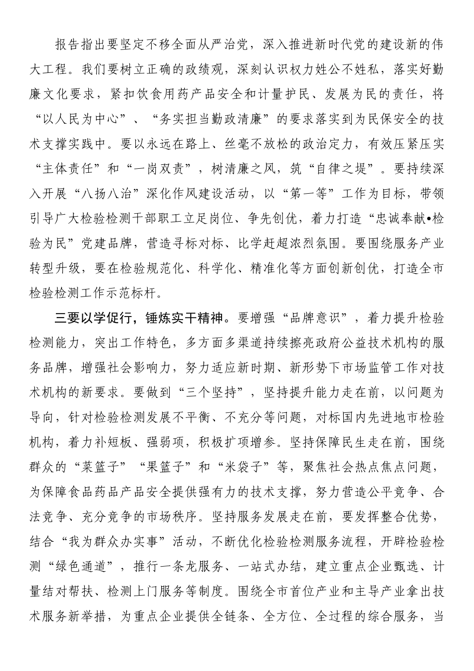 在干部进修班研讨发言xx月x日,省委党校常务副校长、教授xx来党校主体班就如何深入学习贯彻党的二十大精神作专题辅导课,听后,我深受启发,核心意识更强、指导思想更明、目标任务更清、担当觉悟更高。一要以学促思,厚植为民情怀。二十大报告强调,必须“坚持人民至上”,报告愈学愈感悟思想的伟力,愈发坚定让人民生活幸福就是“国之大者”。鉴往知来,砺行致远。要始终牢记“我们党为人民而生、因人民而兴”,党的根基在人民、血脉在人民、力量在人民。作为市场监管部门的技术支撑机构,要始终秉承为民服务的宗旨,以努力提升人民满意度为目标,怀“为民”之心,行“利民”之便,施“惠民”之举,开展“市场监管人在身边八大服务”和“检验检测守护您”活动,为企业办实事,把群众是否满意作为衡量工作实绩的最大标准,努力在保障人民群众生命健康安全、维护消费者合法权益、助力提升生活品质等方面打造一个社会责任心强、技术服务优、创新能力强、政府信得过、企业认可高、百姓口碑好的检验检测机构。二要以学提能,绘就清白底色。报告指出要坚定不移全面从严治党,深入推进新时代党的建设新的伟大工程。我们要树立正确的政绩观,深刻认识权力姓公不姓私,落实好勤廉文化要求,紧扣饮食用药产品安全和计量护民、发展为民的责任,将“以人民为中心”、“务实担当勤政清廉”的要求落实到为民保安全的技术支撑实践中。要以永远在路上、丝毫不放松的政治定力,有效压紧压实“主体责任”和“一岗双责”,树清廉之风,筑“自律之堤”。要持续深入开展“八扬八治”深化作风建设活动,以“第一等”工作为目标,带领引导广大检验检测干部职工立足岗位、争先创优,着力打造“忠诚奉献检•验为民”党建品牌,营造寻标对标、比学赶超浓烈氛围。要围绕服务产业转型升级,要在检验规范化、科学化、精准化等方面创新创优,打造全市检验检测工作示范标杆。三要以学促行,锤炼实干精神。要增强“品牌意识”,着力提升检验检测能力,突出工作特色,多方面多渠道持续擦亮政府公益技术机构的服务品牌,增强社会影响力,努力适应新时期、新形势下市场监管工作对技术机构的新要求。要做到“三个坚持”,坚持提升能力走在前,以问题为导向,针对检验检测发展不平衡、不充分等问题,对标国内先进地市检验机构,着力补短板、强弱项,积极扩项增参。坚持保障民生走在前,围绕群众的“菜篮子”“果篮子”和“米袋子”等,聚焦社会热点焦点问题,为保障食品药品产品安全提供强有力的技术支撑,努力营造公平竞争、合法竞争、充分竞争的市场秩序。坚持服务发展走在前,要发挥整合优势,结合“我为群众办实事”活动,不断优化检验检测服务流程,开辟检验检测“绿色通道”,推行一条龙服务、一站式办结,建立重点企业甄选、计量结对帮扶、检测上门服务等制度。围绕全市首位产业和主导产业拿出技术服务新举措,为重点企业提供全链条、全方位、全过程的综合服务,当好助推xx经济高质量发展的技术排头兵。