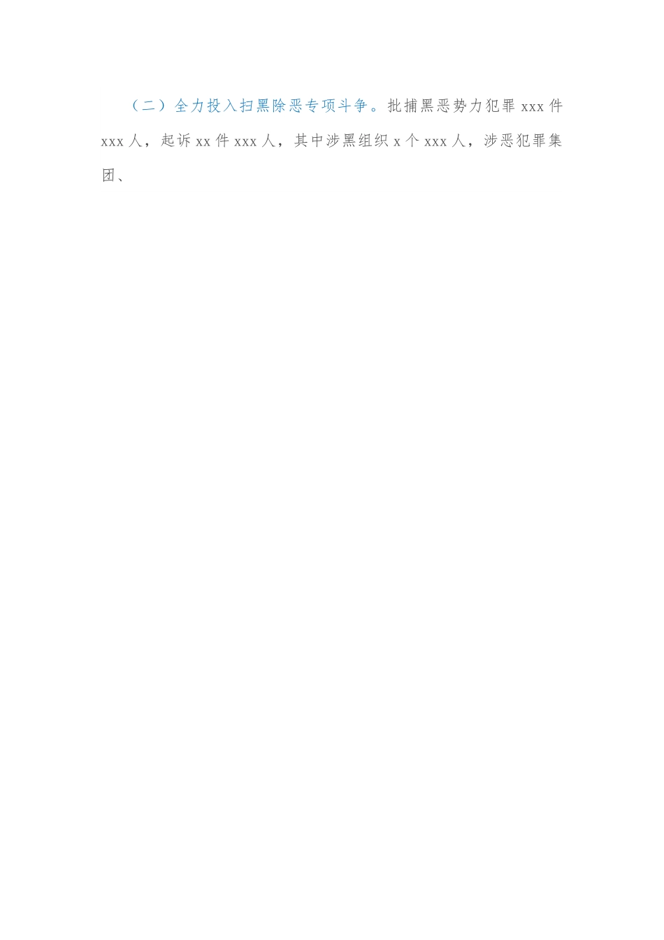 2022年市人民检察院工作报告各位代表:我代表市检察院向大会报告工作,请予审议,并请市政协委员和列席人员提出意见。2021年以来主要工作2021年以来,在市委和省检察院的坚强领导下,在市人大及其常委会有力监督和市政府、市政协及社会各界的大力支持下,全市检察机关坚持以习近平新时代中国特色社会主义思想为指导,全面贯彻党的十九大和十九届历次全会精神,深入学习贯彻习近平法治思想和习近平总书记来x考察重要讲话精神,认真落实中省市委决策部署和市五届人大及其常委会各项决议,忠实履行宪法法律赋予的法律监督职责,各项检察工作取得了新成效。一、旗帜鲜明讲政治,以检察力量服务中心大局更加坚定(一)全面参与打赢脱贫攻坚战。积极参与扶贫领域腐败和作风问题专项治理,起诉套取侵吞、挤占挪用扶贫资金等侵财案犯罪xxxx件xxxx人,追回资金xxx.xx万余元。主动把因案致贫返贫的刑事被害人或其近亲属纳入司法救助范围,发放司法救助金xxx.x万元,助力稳定脱贫攻坚。坚持全员参与,投入大量精力开展精准帮扶,市检察院帮扶的xx村镇解放村xx户xx人经过x年持续帮扶,顺利实现脱贫摘帽。xxxx年,市检察院被表彰为脱贫攻坚先进帮扶单位。(二)全力投入扫黑除恶专项斗争。批捕黑恶势力犯罪xxx件xxx人,起诉xx件xxx人,其中涉黑组织x个xxx人,涉恶犯罪集团、团伙xx个xxx人。全力打财断血,配合公安、法院完成清查、监管、收缴黑恶财产xx亿余元。坚持破网打伞,监督发现并移送涉”保护伞”线索xx条,起诉”保护伞”x人。全国扫黑办副主任、最高检副检察长x深入市检察院调研指导并给予充分肯定。市检察院被表彰为全省扫黑除恶专项斗争先进集体,x名干警被表彰为全国扫黑除恶专项斗争先进个人。(三)全员融入疫情防控工作大局。坚持自身防疫与依法履职两不误,xxx名党员干警下沉一线,助力联防联控和复产复工。批准逮捕涉疫刑事犯罪xx件xx人,起诉xx件xx人。办理涉野生动物保护、医疗废弃物污染等公益诉讼案件xx件。向监狱、看守所发出涉疫检察建议xxx份,均被采纳,确保全市监管场所安全。x区检察院办理的”依托xxxxx检察服务中心,主动发现并妥善处理涉疫案件线索”入选最高检典型案例,”提前介入王某景编造虚假信息案”被省检察院列为指导性案例。二、贯彻新发展理念,以检察担当助推经济社会发展更加有力(一)持续助力优化营商环境。制定出台依法保障和促进民营经济健康发展的意见,与市工商联建立常态化沟通协作机制,依法惩处侵犯民营企业合法权益的犯罪xx件xxx人,进一步优化营商环境。督促依法清理涉民营企业刑事诉讼”挂案”xx件,解除企业诉累。落实”少捕慎诉慎押”刑事司法政策,对涉案民营企业负责人依法不捕不诉、建议适用缓刑xxx人,最大限度保障企业正常经营。积极开展企业合规改革试点工作,探索办理首例企业合规案件,督促涉案企业作出合规承诺并整改落实,助力行业持续健康发展。(二)坚决防范化解金融风险。加强与金融监管部门的配合,健全协作机制,形成工作合力。依法办理破坏金融管理秩序、金融诈骗、非法集资等经济犯罪案件xxx件xxxx人,挽回经济损失xxxx.xx万余元。与公安、人民银行联合开展反洗钱行动,起诉x件xx人,办案量位居全省第一。从严从快办理”两卡”犯罪案件,起诉xx件xxx人。市检察院设立知识产权检察办公室,办理侵犯知识产权案件xx件xx人。(三)积极推动绿色转型发展。联合市纪委监委开展秦岭生态环境保护专项监督活动,立案xx件。会同xx等地检察机关建立跨区域协作机制,联合开展x平原大气污染防治,办理污染环境犯罪xx件xxx人。强化”检察长+河长”履职合力,扎实开展”携手清四乱,保护母亲河”专项监督活动,督促清理污染和占用河道xxx.xx亩,整改拆除违法建筑xxxx平方米,清理生活垃圾xxxxx立方米,办理的违法开采砂石破坏xx湿地自然保护区案被最高检列为指导案例。三、牢记司法为民初心,以检察作为守护群众美好生活更加有效(一)积极推进平安xx建设。坚决维护国家安全,起诉组织和利用邪教组织犯罪案件xx件xx人。始终保持惩治刑事犯罪高压态势,共批捕各类刑事犯罪嫌疑人xxxx件xxxxx人,起诉xxxxx件xxxxx人,全力维护社会大局...