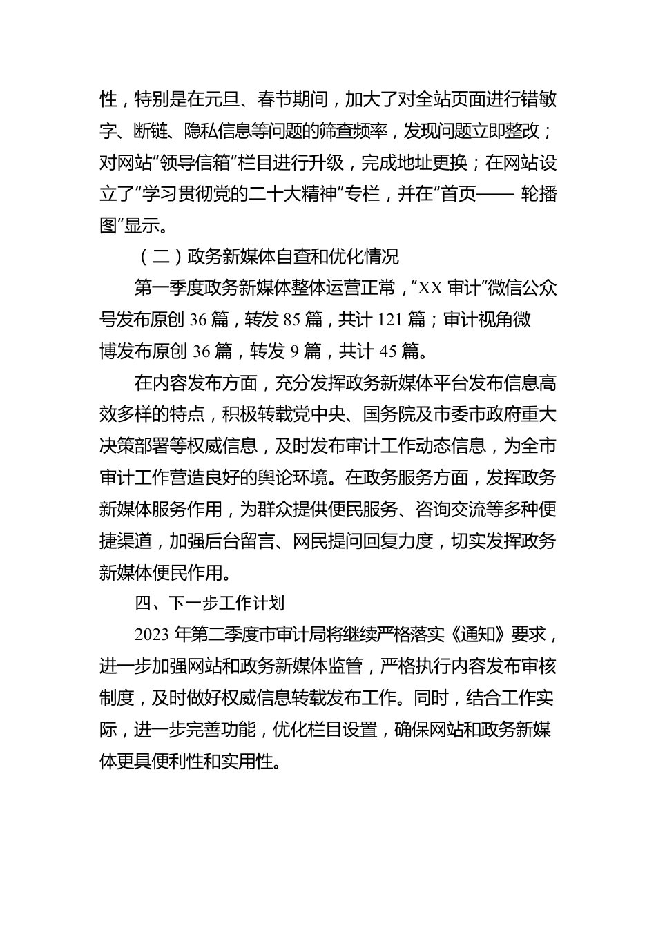 市审计局2023年第一季度政府网站与政务新媒体工作自查报告按照市政务服务局《关于印发政府网站和政务新媒体检查指标的通知》(以下简称《通知》)要求,市审计局开展了2023年第一季度(数据统计周期为2022年11月27日至2023年2月12日)网站和政务新媒体自查工作,具体情况如下:一、网站运行情况第一季度市审计局网站整体运行情况良好。网站页面总浏览量(PV)为144948页,总访问次数为76381人次,其中“通知公告”“图片新闻”“机构职能”等栏目网民关注度较高。网站信息更新量为225条,其中“区信息”“综合动态”等栏目更新频率较高。网站连通性好,链接可用性好。二、网民留言办理情况第一季度“领导信箱”共收到留言30条,办结回复30条,正在办理0条,平均办理时限“1个工作日”,回复率100%,满意度为100%,主要问题集中在审计职称考试相关问题;本季度“我为政府网站找错”平台未收到网民留言。三、网站与政务新媒体自查情况(一)网站自查和优化情况对全站信息更新、发布情况进行了自查,网站运行良好,各项监测指标正常;同时,为保障网站内容的准确性和实用性,特别是在元旦、春节期间,加大了对全站页面进行错敏字、断链、隐私信息等问题的筛查频率,发现问题立即整改;对网站“领导信箱”栏目进行升级,完成地址更换;在网站设立了“学习贯彻党的二十大精神”专栏,并在“首页——轮播图”显示。(二)政务新媒体自查和优化情况第一季度政务新媒体整体运营正常,“XX审计”微信公众号发布原创36篇,转发85篇,共计121篇;审计视角微博发布原创36篇,转发9篇,共计45篇。在内容发布方面,充分发挥政务新媒体平台发布信息高效多样的特点,积极转载党中央、国务院及市委市政府重大决策部署等权威信息,及时发布审计工作动态信息,为全市审计工作营造良好的舆论环境。在政务服务方面,发挥政务新媒体服务作用,为群众提供便民服务、咨询交流等多种便捷渠道,加强后台留言、网民提问回复力度,切实发挥政务新媒体便民作用。四、下一步工作计划2023年第二季度市审计局将继续严格落实《通知》要求,进一步加强网站和政务新媒体监管,严格执行内容发布审核制度,及时做好权威信息转载发布工作。同时,结合工作实际,进一步完善功能,优化栏目设置,确保网站和政务新媒体更具便利性和实用性。