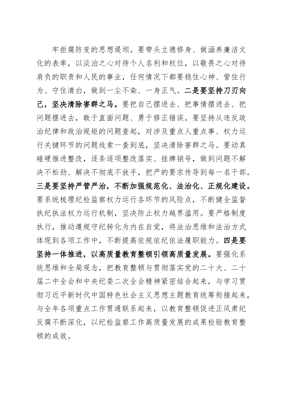廉政教育党课:做一名政治过硬、能力过硬、作风过硬的纪检监察人员按照纪检监察干部队伍教育整顿的整体工作安排,今天由我为纪检监察干部作廉政教育。总书记在二十届中央纪委二次全会中强调,要坚持严的主基调不动摇,一体推进“不敢腐、不能腐、不想腐”。我们纪检监察工作的职责当中有很重要的一条,就是协助党组推进全面从严治党、加强党风廉政建设。“廉政”,既是政治管理学的概念,又是政治伦理学的范畴。廉政的主体既指政务工作者,也指党风工作部门,对前者是官品人品,对后者就是党风政风。用传统的话来说,廉政就是“一身正气,两袖清风”。所谓正气,是指忠于职守、坚持原则、秉公办事、不徇私情;所谓清风,是指不贪财肥私,不贪赃枉法,不以权谋利,不沾公家一分便宜。在古代,官员穿的官服袖子都很肥大,肥袖可以载物,两袖一抖,对于贪官来说常常可以抖出赃银贿财,而对于明朝的名臣于谦那样的廉吏来说抖出的却是“两袖清风”。用现在的话来说,廉政就是堂堂正正做人、清清白白做官、干干净净做事。党的十八大以来,党中央以“不得罪成百上千的腐败分子,就要得罪十四亿人民”的豪迈气概,明确以“全面从严”为基本特征的反腐败政策,坚定不移“打虎”“拍蝇”“猎狐”,反腐败斗争十年磨一剑,取得了压倒性胜利并全面巩固,“赢得了保持同人民群众的血肉联系、人民衷心拥护的历史主动,赢得了全党高度团结统一、走在时代前列、带领人民实现中华民族伟大复兴的历史主动”。进入新发展阶段,随着中国共产党对历史周期率认识的不断深化,致力于同一切损害党的先进性和纯洁性的因素作斗争的自我革命思想日益成熟,全面从严治党的理论基础、实践基础更加成熟。党对反腐败斗争的领导更加强化、更加全面、更加高效。总的来说,我们这支队伍是一支能够让党和人民放心的队伍。当然,我们的队伍也还存在一些问题和不足,有的瞻前顾后,在履行监督职责中,怕触“马蜂窝”,怕碰“关系网”,不敢大胆履行职责,不管事情大小都指望党组的主体责任、或者部门“一把手”的第一责任,忘记或弱化了自己的监督责任和协助的职责。有的得过且过,过分强调缺乏工作抓手等客观困难,一年到头向党组或部门“一把手”通报或指出廉政方面不足的问题没有几次,不图有功,但求无过。有的满足现状,固步自封,不善于研究新情况,解决新问题。以上这些问题和不足,都与我们从事纪检监察工作承担的职责使命不符,必须加以彻底整改。为此我们要注重抓好以下四个方面工作要求:一是要坚持思想引领,坚决做到“两个维护”。深入开展思想政治教育,深化落实“第一议题”制度,认真学习贯彻习近平总书记重要讲话和重要指示批示精神,内化于心、外化于行,赓续红色血脉基因,把对“两个确立”的坚定拥护转化为“两个维护”的自觉行动。要深入开展纪律警示教育,推动以案示警入脑入心,要用好警示案例,用身边事教育身边人,不断筑牢拒腐防变的思想堤坝。要带头立德修身、做涵养廉洁文化的表率,以淡泊之心对待个人名利和权位,以敬畏之心对待肩负的职责和人民的事业,任何情况下都要稳住心神、管住行为、守住清白,做到一尘不染、一身正气。二是要坚持刀刃向己,坚决清除害群之马。要把自己摆进去、把事情摆进去、把问题摆进去,敢于直面问题、勇于修正错误。要坚持从违反政治纪律和政治规矩的问题查起,对涉及重点人重点事、权力运行关键环节的问题线索一查到底,坚决清除害群之马。要动真碰硬推进整改,逐条逐项整改落实、挂牌销号,做到问题不解决不松劲、解决不彻底不放手,把严的要求传导到每一名干部。三是要坚持严管严治,不断加强规范化、法治化、正规化建设。要系统梳理纪检监察权力运行各环节的风险点,不断健全监督执纪执法权力运行机制,坚决防止权力越界滥用。要严格制度执行,推动遵规守纪转化为内在自觉,将法治思维和法治方式体现到各项工作中,不断提高依规依纪依法履职能力。四是要坚持一体推进,以高质量教育整顿引领高质量发展。要强化系统思维和全局观念,把教育整顿与贯彻落实党的二十大、二十届二中全会和中央纪委二次全会精神紧密结合起来,与学习贯彻习近平新时代中国特色社会...