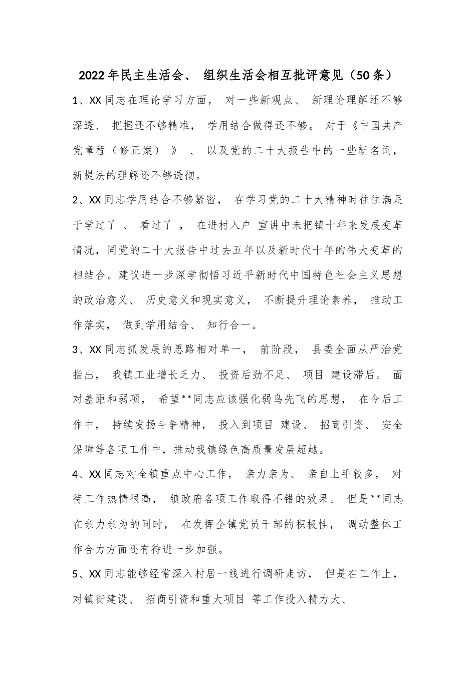 2022年民主生活会、组织生活会相互批评意见(50条)1、XX同志在理论学习方面,对一些新观点、新理论理解还不够深透、把握还不够精准,学用结合做得还不够。对于《中国共产党章程(修正案)》、以及党的二十大报告中的一些新名词,新提法的理解还不够透彻。2、XX同志学用结合不够紧密,在学习党的二十大精神时往往满足于学过了、看过了,在进村入户宣讲中未把镇十年来发展变革情况,同党的二十大报告中过去五年以及新时代十年的伟大变革的相结合。建议进一步深学彻悟习近平新时代中国特色社会主义思想的政治意义、历史意义和现实意义,不断提升理论素养,推动工作落实,做到学用结合、知行合一。3、XX同志抓发展的思路相对单一,前阶段,县委全面从严治党指出,我镇工业增长乏力、投资后劲不足、项目建设滞后。面对差距和弱项,希望**同志应该强化弱鸟先飞的思想,在今后工作中,持续发扬斗争精神,投入到项目建设、招商引资、安全保障等各项工作中,推动我镇绿色高质量发展超越。4、XX同志对全镇重点中心工作,亲力亲为、亲自上手较多,对待工作热情很高,镇政府各项工作取得不错的效果。但是**同志在亲力亲为的同时,在发挥全镇党员干部的积极性,调动整体工作合力方面还有待进一步加强。5、XX同志能够经常深入村居一线进行调研走访,但是在工作上,对镇街建设、招商引资和重大项目等工作投入精力大、关注程度高,对村集体经济发展、农业发展等工作关注相对较少,推动乡村振兴工作仍存在薄弱环节,存在一手硬、一手软的问题。希望**同志能够全面贯彻新发展理念,进一步统筹全镇经济社会发展。6、XX同志工作创新不够,平时工作勤勤恳恳、任劳任怨,但是积极性主动性不够,创新意识、灵活机动的劲头还需加强,特别是要解放思想、更新观念,推动我镇宣传思想和精神文明建设工作取得新成效。尤其是新媒体方面,要加大培育力度,推出精品力作,把我镇特色产业、优秀文化宣传出去。7、XX同志传导从严治党压力需进一步加强。**同志能够始终把政治建设摆在首位,多次召开班子会议研究部署,切实加强对全镇党员干部的党风廉政教育。但是从今年全县查办案件情况看,我镇有3名党员干部因为“四风”问题被追责问责,占全县8%,说明工作中抓细抓实方面还存在薄弱环节。建议**同志深刻领会***报告关于全面从严治党的重要论述,进一步加大责任传导力度,坚定不移地把全面从严治党和反腐败斗争引向深入。8、XX同志抓学习不够主动,作为党委书记,抓全镇全面工作比较多,领学理论知识时候较少,特别是未能有效推动村党组织书记贯通学习《习近平谈治国理政》第一到四卷,没有同《习近平经济思想》等重要理论书籍相结合、相融入。9、XX同志在信访维稳工作上下了很大功夫,但具体到实际信访件来看,还存在化解信访矛盾不够大胆的问题。当前,我镇信访工作形势相对严峻,存在到省***的突出问题,下一步,建议**同志尽快牵头完善信访工作机制,压实工作责任,加强催办督办,推动全镇减存控增工作取得预期成效。10、XX同志长期工作在镇村一线,但是随着新形势新变化,对待工作时改革创新意识需要进一步增强。尤其是面对当前我镇经济社会发展遇到的瓶颈和困境,思想还不够解放,改革创新意识还需加强。比如,当前全县正在大力培育林下经济,引进中药材种植项目帮助村财增收,我镇**江南岸有着大面积林地,但在挂村工作中推动林下经济考虑较少,希望**同志面对新形势新任务,需要多思考新思路新想法,努力破解当前阻碍发展的各种问题。11、XX同志推进项目力度还需加大,县委主体责任检查指出,当前我镇2个在建重大项目相对滞后,引进大项目好项目较少,拉动经济实现企稳回升力还不足。希望**同志持续以***精神为指引,牢记“三个务必”,在以后的工作中要狠抓项目建设,加强决策和落实力度,确保在项目建设上取得新突破。12、XX同志理论学习形式单一,未能有效利用新媒体学习相关知识。当前,各类媒体对***进行深入解析解读,利用漫画、短视频等多种形式宣传推介,但是**同志还是满足于读报看书的老形式老办法,没有适应新时代下的新闻媒介,并加以利用提高自身理论政策水平。13、XX同志在镇村一线工作了近...