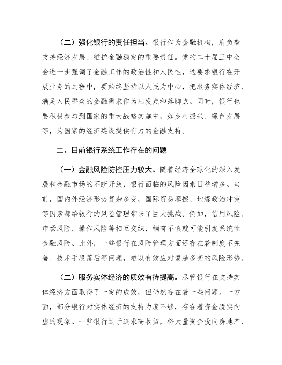 某银行干部在金融系统理论中心组学习党的二十届三中全会精神专题研讨发言尊敬的各位领导、同事们:党的二十届三中全会是在以中国式现代化全面推进强国建设、民族复兴伟业的关键时期召开的一次具有划时代、里程碑意义的重要会议。全会为进一步全面深化改革、推进中国式现代化作出了一系列战略部署,对银行系统的工作也提出了新的要求和指引。在此,我结合银行系统工作实际,谈谈对党的二十届三中全会精神的学习体会。一、深刻认识党的二十届三中全会对银行系统的重要意义(一)为银行发展指明方向。党的二十届三中全会强调了全面深化改革的重要性,这为银行系统在新的历史时期实现高质量发展指明了方向。在当前复杂多变的经济金融形势下,银行作为金融体系的重要组成部分,必须积极响应全会精神,不断推进自身的改革与创新,以更好地适应经济社会发展的需求。例如,全会提出的构建高水平社会主义市场经济体制,要求银行进一步优化金融资源配置,提高服务实体经济的能力和水平。(二)强化银行的责任担当。银行作为金融机构,肩负着支持经济发展、维护金融稳定的重要责任。党的二十届三中全会进一步强调了金融工作的政治性和人民性,这要求银行在开展业务的过程中,要始终坚持以人民为中心,把服务实体经济、满足人民群众的金融需求作为出发点和落脚点。同时,银行也要积极参与到国家的重大战略实施中,如乡村振兴、绿色发展等,为国家的经济建设提供有力的金融支持。二、目前银行系统工作存在的问题(一)金融风险防控压力较大。随着经济全球化的深入发展和金融市场的不断开放,银行面临的风险因素日益增多。当前,国内外经济形势复杂多变,国际贸易摩擦、地缘政治冲突等因素都给银行的风险管理带来了巨大挑战。例如,信用风险、市场风险、操作风险等相互交织,稍有不慎就可能引发系统性金融风险。此外,一些银行在风险管理方面还存在着制度不完善、技术手段落后等问题,难以有效应对复杂多变的风险形势。(二)服务实体经济的质效有待提高。尽管银行在支持实体经济方面取得了一定的成效,但仍然存在着一些问题。一方面,部分银行对实体经济的支持力度不够,存在着资金脱实向虚的现象。一些银行过于追求高收益,将大量资金投向房地产、金融衍生品等领域,而对制造业、小微企业等实体经济的支持不足。另一方面,银行的金融服务模式和产品创新能力有待提高,难以满足实体经济多样化的金融需求。例如,一些小微企业由于缺乏抵押物、信用记录不完善等原因,难以获得银行的贷款支持。(三)数字化转型面临诸多困难。在信息技术飞速发展的背景下,银行的数字化转型已成为必然趋势。然而,银行在数字化转型过程中也面临着诸多困难。一是技术人才短缺,银行缺乏既懂金融又懂技术的复合型人才,难以满足数字化转型的需求。二是数据安全和隐私保护问题突出,随着银行数据的不断积累和应用,数据安全和隐私保护成为了银行面临的重要挑战。三是数字化转型的成本较高,银行需要投入大量的资金和资源进行系统建设、技术升级等,这对银行的盈利能力和财务状况带来了一定的压力。三、坚持党的二十届三中全会精神,推动银行系统工作稳步前行(一)加强风险防控体系建设。建立健全全面风险管理体系,完善风险管理制度和流程,加强对各类风险的识别、评估、监测和控制。银行要加强对宏观经济形势、行业发展趋势等的研究和分析,及时发现潜在的风险因素,并采取相应的风险防范措施。加强内部控制建设,强化对业务流程的监督和管理,防范操作风险。银行要建立健全内部审计制度,加强对内部各部门、各岗位的监督和检查,确保各项业务操作合规、合法。加强与监管部门的沟通与协作,积极配合监管部门的工作,及时报告风险情况,共同维护金融稳定。同时,银行也要加强对监管政策的学习和研究,确保自身的经营行为符合监管要求。(二)提升服务实体经济的能力和水平。加大对实体经济的支持力度,优化信贷结构,将更多的资金投向制造业、小微企业、乡村振兴等领域。银行要积极创新金融产品和服务模式,针对不同类型的实体经济主体,提供个性化、差异化的金融服务。例如,针对小微企业的特点,开发适合小微企业的...