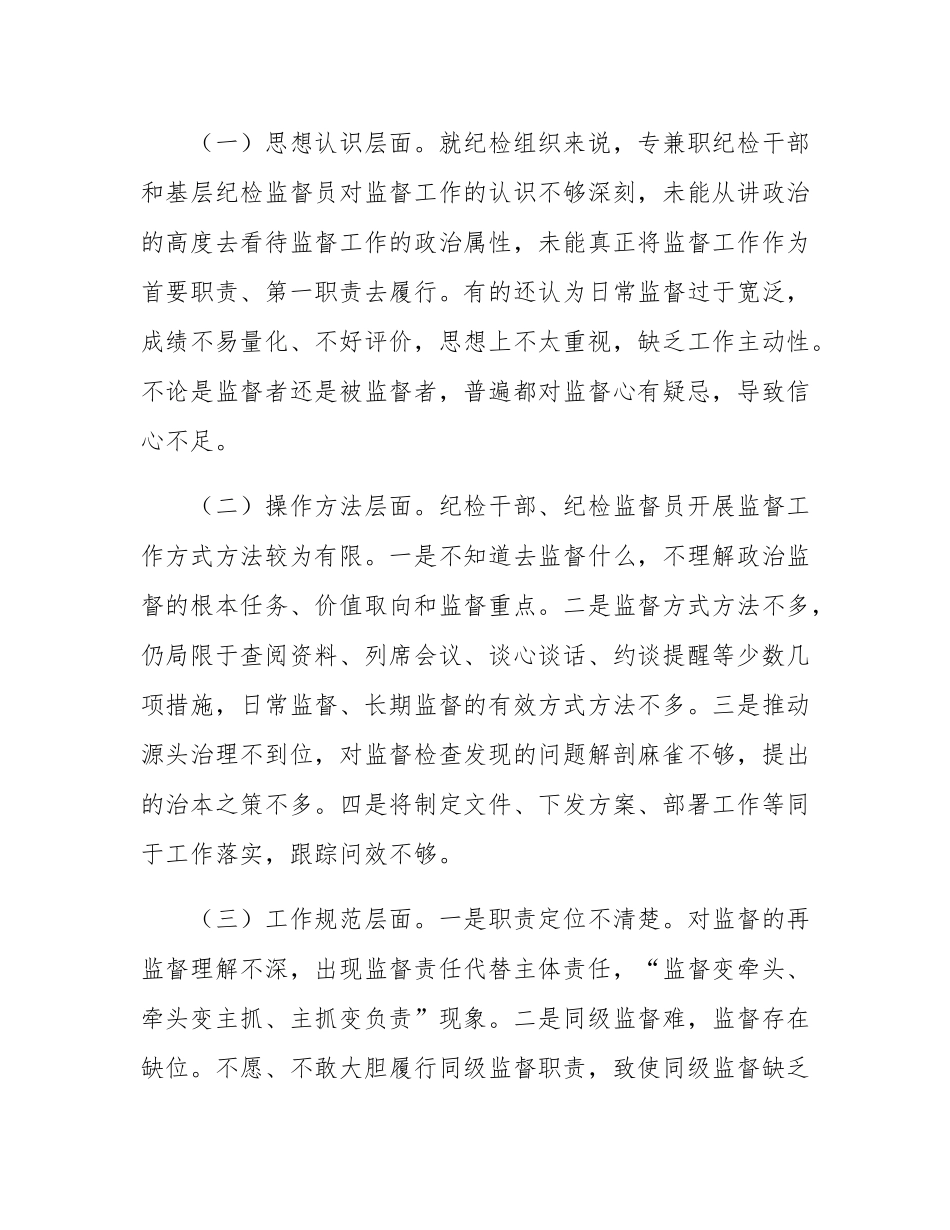 廉政党课:做深做实基层监督,确保严的基调一贯到底同志们:按照公司党委工作安排,下面,我围绕“做深做实基层监督,确保严的基调一贯到底”这一主题,为大家讲一堂廉政党课,与大家共勉。基层监督是党和国家监督体系的重要组成部分,加强基层监督是推动全面从严治党向基层延伸、提升基层治理效能的有力举措。党的二十届三中全会审议通过的《中共中央关于进一步全面深化改革、推进中国式现代化的决定》要求“深化基层监督体制机制改革”。二十届中央纪委三次全会强调,完善基层监督体系,优化基层纪检监察机构设置,统筹用好县乡监督力量,推动加大基层监督办案力度。纪检机构要积极探索提升基层监督质效的方法路径,构建基层监督“一盘棋”工作格局,推动基层监督力量整合、程序契合、工作融合,实现基层监督从有形覆盖到有效覆盖,将监督成果更好转化为治理效能。一、当前基层监督中存在的问题和不足(一)思想认识层面。就纪检组织来说,专兼职纪检干部和基层纪检监督员对监督工作的认识不够深刻,未能从讲政治的高度去看待监督工作的政治属性,未能真正将监督工作作为首要职责、第一职责去履行。有的还认为日常监督过于宽泛,成绩不易量化、不好评价,思想上不太重视,缺乏工作主动性。不论是监督者还是被监督者,普遍都对监督心有疑忌,导致信心不足。(二)操作方法层面。纪检干部、纪检监督员开展监督工作方式方法较为有限。一是不知道去监督什么,不理解政治监督的根本任务、价值取向和监督重点。二是监督方式方法不多,仍局限于查阅资料、列席会议、谈心谈话、约谈提醒等少数几项措施,日常监督、长期监督的有效方式方法不多。三是推动源头治理不到位,对监督检查发现的问题解剖麻雀不够,提出的治本之策不多。四是将制定文件、下发方案、部署工作等同于工作落实,跟踪问效不够。(三)工作规范层面。一是职责定位不清楚。对监督的再监督理解不深,出现监督责任代替主体责任,“监督变牵头、牵头变主抓、主抓变负责”现象。二是同级监督难,监督存在缺位。不愿、不敢大胆履行同级监督职责,致使同级监督缺乏权威性和威慑力。三是基层纪检监督员的监督大多注重于对工作效能、基础管理、安全隐患,对党组织履行党风廉政建设主体责任情况、党员领导干部廉洁自律方面的监督不到位。(四)监督力量层面。一是监督力量的整体性、联动性、协同性还不强,党组织的日常监督、纪检组织的专责监督、员工群众的民主监督、主责部门的职能监督,各方面监督力量相互衔接协作不够,缺乏有效的信息共享、沟通协作机制。二是纪检专责监督能力不足。所属各单位纪委书记(纪检委员)都分管经营工作,各单位纪检业务主管、纪检监督员普遍兼职党群、综合、工会等工作。三是新进的纪检干部、纪检监督员业务水平不高,政策理论和业务知识不够过硬。二、公司纪委做深做实基层监督的实践公司纪委在推动省公司构建大监督体系同时,立足纪委专责,在做深做实基层监督上进行一些有益的探索。(一)完善基层监督格局,织密基层监督网络。一是构建三级监督网络。按集团构建大监督体系工作要求,公司全力打造省公司-地市公司-区县支撑服务中心三级联动的监督体系,配齐配强省公司纪检专职人员、地市公司纪委书记(纪检委员)、地市公司纪检业务主管、基层党支部纪检委员、区县支撑服务中心纪检监督员xxx人,形成全面覆盖省公司xx个所属单位、xxx个区县支撑服务中心、省市两级公司机关部室的监督体系,从监督力量上保证了日常监督的开展。二是强化纪检监督员专班的力量。在xx个所属单位采取自愿报名+组织推荐+省公司面试的形式,选拔xx名纪检监督员专班人员,主要精力从事纪检基层监督工作。每名纪检监督员专班人员x人负责2-x个区县支撑服务中心,每月至少深入所辖支撑服务中心开展监督检查x次,做到监督标准统一,监督力量常在。三是明确所属各单位纪委书记(纪检委员)、机关支部纪检委员、机关纪检业务主管负责本单位机关各部门的日常监督工作,每月至少开展x次监督检查,切实织密基层监督网络。(二)健全基层监督制度,推进基层监督规范。一是建立健全了《纪委工作规则》《集团基层党支部(党总支)纪...
