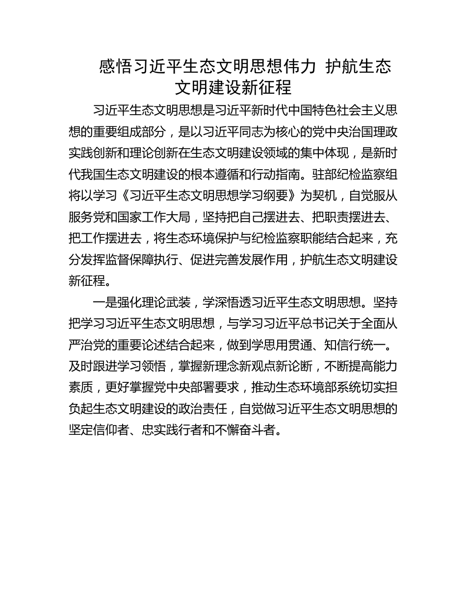感悟习近平生态文明思想伟力护航生态文明建设新征程习近平生态文明思想是习近平新时代中国特色社会主义思想的重要组成部分,是以习近平同志为核心的党中央治国理政实践创新和理论创新在生态文明建设领域的集中体现,是新时代我国生态文明建设的根本遵循和行动指南。驻部纪检监察组将以学习《习近平生态文明思想学习纲要》为契机,自觉服从服务党和国家工作大局,坚持把自己摆进去、把职责摆进去、把工作摆进去,将生态环境保护与纪检监察职能结合起来,充分发挥监督保障执行、促进完善发展作用,护航生态文明建设新征程。一是强化理论武装,学深悟透习近平生态文明思想。坚持把学习习近平生态文明思想,与学习习近平总书记关于全面从严治党的重要论述结合起来,做到学思用贯通、知信行统一。及时跟进学习领悟,掌握新理念新观点新论断,不断提高能力素质,更好掌握党中央部署要求,推动生态环境部系统切实担负起生态文明建设的政治责任,自觉做习近平生态文明思想的坚定信仰者、忠实践行者和不懈奋斗者。二是强化政治监督,确保党中央决策部署落地见效。牢牢把握“两个维护”首要任务,强化政治监督,重点加强对习近平总书记重要指示批示精神和党中央重大决策部署落实情况的监督检查,聚焦生态环境部核心职能,助力深入打好污染防治攻坚战。围绕实施“十四五”生态环保规划、推进“三新一高”等具体化常态化政治监督,紧盯规划实施关键环节,定期了解情况,提出监督要求,着力推动“十四五”规划落地见效。三是强化责任担当,推动“两个责任”一体履行。保持全面从严治党永远在路上的清醒,进一步扭住主体责任“牛鼻子”,推动落实部党组全面从严治党主体责任、党组书记第一责任、班子成员一岗双责,督促管党治党责任落实到生态环境保护工作全过程。坚持“三不腐”一体推进,突出整治生态环境部系统腐败和作风问题,严肃查办违纪违法案件。加强对重点领域和关键环节廉政风险防范,督促进一步健全权力运行监督制约体制机制。四是强化队伍建设,贯通锻造“两个铁军”。对标纪检监察铁军、生态环保铁军要求,坚持在政治过硬、本领高强、纪法严明、作风优良上下功夫、做表率,将“两个铁军”建设贯通融合,以高质量监督推动生态环境高水平保护。突出严管厚爱结合、激励约束并重,充分激发党员干部内生动力,为高质量开展生态环境保护工作提供坚强有力的政治、纪律和作风保障,为生态文明建设和生态环境保护营造良好政治生态。深入学习贯彻习近平生态文明思想不断推动中央生态环境保护督察向纵深发展习近平生态文明思想是中央生态环境保护督察的根本遵循和行动指南,中央生态环境保护督察是习近平生态文明思想的重大原创性成果和制度性保障。习近平总书记亲自谋划亲自部署亲自推动中央生态环境保护督察,多次作出重要指示批示,为深入开展督察指明了方向。在督察中,着重把握好以下几方面。一是坚持以习近平生态文明思想为根本遵循。督察最根本、最首要的,就是推动贯彻落实好习近平生态文明思想。从第二轮第三批开始,我们将被督察对象贯彻落实习近平生态文明思想情况摆在首位,查处了不少这方面的突出问题,这也是今后督察的首要任务和核心工作。二是把习近平总书记重要指示批示贯彻落实情况作为重中之重。每次督察进驻的头等大事、第一要务,就是深入学习领会习近平总书记重要指示批示精神,对标对表、深刻体悟,制定方案、建立台账,专人专组、逐项核实,确保习近平总书记重要指示批示精神不折不扣得到落实。三是把党中央重大决策部署作为督察的重要方面。紧紧围绕经济社会发展大局思考、谋划和推进督察工作,聚焦区域重大战略实施中生态环保要求落实、“两高”项目盲目发展、环境基础设施建设短板弱项、重大生态破坏和环境污染等情况,确保党中央决策部署落到实处。深刻领悟习近平生态文明思想重大意义锻造忠诚干净担当生态环保铁军坚持用习近平生态文明思想武装头脑、指导实践、推动工作,把习近平生态文明思想放到习近平新时代中国特色社会主义思想的科学体系中、放到新时代推进生态文明建设的伟大实践中深入学习把握。在习近平生态文明思想指引下,推动生态文明体制改革系统集成...