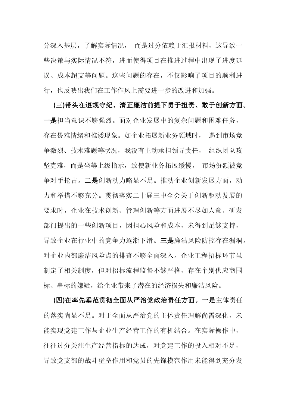 2025年国有企业党支部书记组织生活会“四个带头”对照检查材料与市审计局领导班子专题生活会“四个带头”含典型案例剖析对照检查材料2篇文2025年国有企业党支部书记组织生活会“四个带头”对照检查材料在党的领导下,为了全面深化改革、推进具有中国特色的现代化进程,我们已经清晰地指明了前进的方向。在这样的大背景下,我积极地投身于党的纪律学习教育工作的组织与参与之中,全心全意地推动我们党支部的各项工作向更深层次、更广领域迈进。然而,通过深刻反思与自查,我发觉自己在“四个带头”方面尚存在一些问题,现将对照检查情况汇报如下。一、存在的主要问题(一)带头严守政治纪律和政治规矩,维护党的团结统一方面。一是政治敏锐性有待提升。对潜在的政治风险和意识形态问题缺乏足够的洞察力,未能做到及时察觉与防范。例如,在深入学习贯彻二十届三中全会精神的过程中,有员工在企业内部论坛发表了片面解读改革政策的言论,引起了部分员工的讨论。对此,我们未能及时发现并予以处理,导致错误观点在一定范围内传播,影响了员工对政策的正确理解。二是执行力度需进一步加强。在推动企业落实二十届三中全会关于深化国有企业改革等决策部署时,我们的行动不够迅速果断,落实也不够全面彻底。特别是在混合所有制改革的相关要求方面,本企业在制定具体方案时进度滞后,未能充分利用政策机遇积极引入战略投资者,错失了一些宝贵的合作机会。三是党内沟通协调工作需进一步完善。党支部内部沟通协调工作存在不足,未能充分考虑党员的意见和建议。在组织企业年度发展规划讨论时,未提前广泛征求党员意见,导致部分党员在规划实施过程中积极性不高,执行力度受到影响。(二)在加强党性锻炼、严守纪律规矩、锤炼工作作风方面,我们应率先垂范。一是党性锻炼需进一步加强。在深入学习习近平新时代中国特色社会主义思想及党的理论方针政策的过程中,我们观察到部分党员和干部在学习上存在浅尝辄止的问题,未能深刻领会和全面掌握这些重要思想和政策。特别是在学习二十届三中全会精神时,对于国有企业发展的战略部署,我们未能做到深入研究,这导致在运用这些理论指导企业实践时,缺乏应有的深度和广度,面对市场变化,我们的创新措施显得不足,难以有效推动企业的发展和进步。二是纪律执行需更加严格。企业内部纪律规定在执行过程中存在一定程度的松懈,对于一些违规行为,我们有时采取了姑息纵容的态度。以考勤纪律为例,我们注意到部分员工经常出现迟到早退的现象,而对此类行为的处理往往仅限于口头批评,没有严格按照规定进行严肃处理。这种做法使得考勤制度在一定程度上流于形式,影响了企业的工作氛围,降低了工作效率。三是工作作风存在形式主义和官僚主义倾向。在推进企业重点项目的过程中,未能充分深入基层,了解实际情况,而是过分依赖于汇报材料,这导致一些决策与实际情况不符,进而使得项目在推进过程中出现了进度延误、成本超支等问题。这些问题的存在,不仅影响了项目的顺利进行,也反映出我们在工作作风上需要进一步的改进和加强。(三)带头在遵规守纪、清正廉洁前提下勇于担责、敢于创新方面。一是担当意识不够强烈。面对企业发展中的复杂问题和困难任务,存在畏难情绪和推诿现象。如企业拓展新业务领域时,遇到市场竞争激烈、技术难题等状况,我没有主动承担领导责任,组织团队攻坚克难,而是坐等上级指示,致使新业务拓展缓慢,市场份额被竞争对手抢占。二是创新动力略显不足。推动企业创新发展方面,动力和举措不够充分。贯彻落实二十届三中全会关于创新驱动发展的要求时,企业在技术创新、管理创新等方面进展不尽如人意。研发部门提出的一些创新项目,因担心风险和成本,未得到足够支持,导致企业在行业中的竞争力逐渐下滑。三是廉洁风险防控存在漏洞。对企业内部廉洁风险点的排查不够全面深入。企业工程招标环节虽制定了相关制度,但对招标流程监督不够严格,存在个别供应商围标、串标的嫌疑,给企业带来了潜在的经济损失和廉洁风险。(四)在率先垂范贯彻全面从严治党政治责任方面。一是主体责任的落实尚显不足。对于全面从严治党的主体责任理解尚需深化,未能实现...