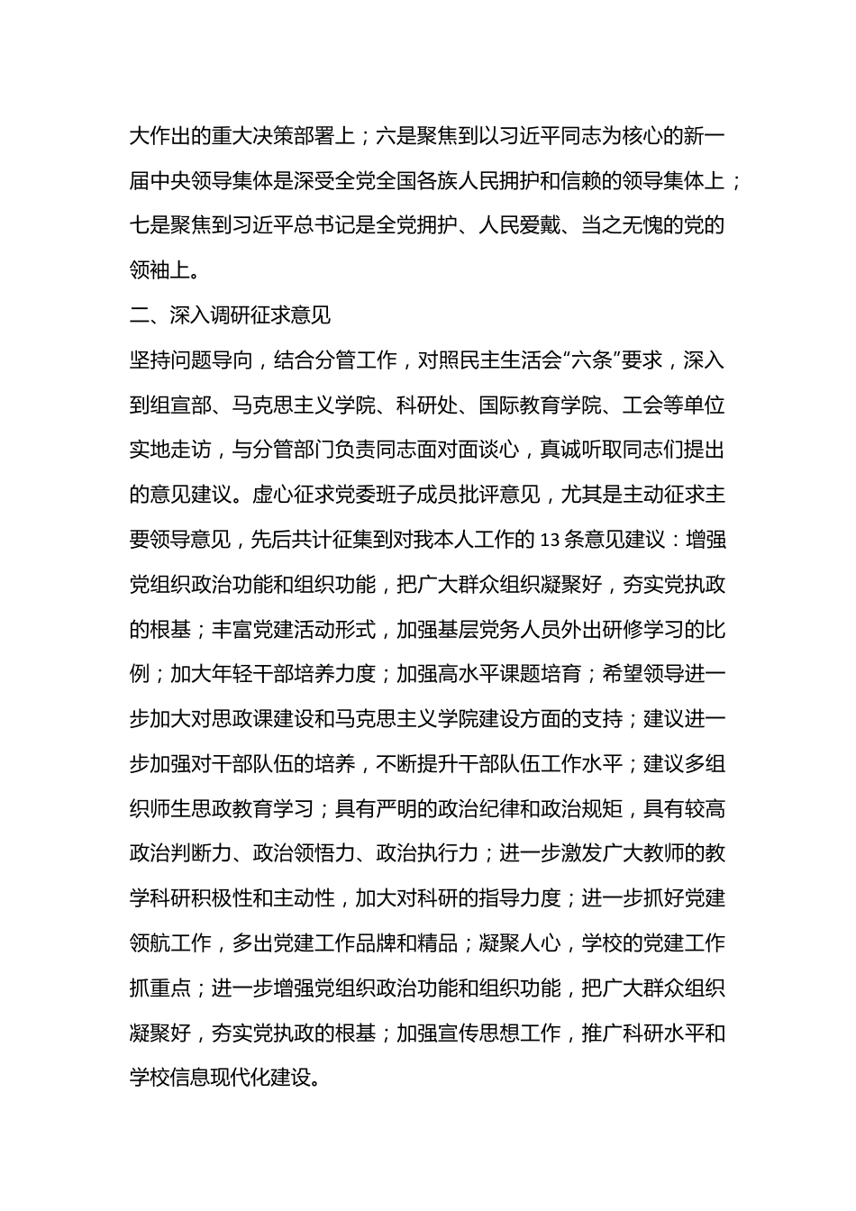 2022年度民主生活会个人对照检查材料(全文5118字)根据中共河北省纪委机关、中共河北省委组织部印发《关于开好2022年度县以上党和国家机关党员领导干部民主生活会的通知》精神和市委、市教育工委有关要求,依据《中共XX学校委员会关于开好2022年度县以上党和国家机关党员领导干部民主生活会的工作方案》,认真做好充分准备,强化自身理论学习,提高政治素养,围绕民主生活会主题,作汇报如下:此次民主生活会的主题是:全面贯彻习近平新时代中国特色社会主义思想,深刻领悟“两个确立”的决定性意义,增强“四个意识”、坚定“四个自信”、做到“两个维护”,团结带领党员干部群众以奋发有为的精神贯彻落实党的XX大作出的重大决策部署。一、不断深化学习提升政治素养围绕民主生活会主题,认真学习习近平新时代中国特色社会主义思想,学习党的XX大报告和党章,学习习近平总书记在党的二十届一中全会上的重要讲话精神。在学习中做到“七个聚焦”:一是聚焦到习近平总书记是党中央的核心、全党的核心,习近平新时代中国特色社会主义思想是党必须长期坚持的指导思想上;二是聚焦到党的十九大以来的重大成就和新时代10年的伟大变革上;三是聚焦到把握好马克思主义中国化时代化最新成果的世界观和方法论,坚持好、运用好贯穿其中的立场观点方法上;四是聚焦到中国式现代化在理论和实践的创新突破上;五是聚焦到贯彻落实党的XX大作出的重大决策部署上;六是聚焦到以习近平同志为核心的新一届中央领导集体是深受全党全国各族人民拥护和信赖的领导集体上;七是聚焦到习近平总书记是全党拥护、人民爱戴、当之无愧的党的领袖上。二、深入调研征求意见坚持问题导向,结合分管工作,对照民主生活会“六条”要求,深入到组宣部、马克思主义学院、科研处、国际教育学院、工会等单位实地走访,与分管部门负责同志面对面谈心,真诚听取同志们提出的意见建议。虚心征求党委班子成员批评意见,尤其是主动征求主要领导意见,先后共计征集到对我本人工作的13条意见建议:增强党组织政治功能和组织功能,把广大群众组织凝聚好,夯实党执政的根基;丰富党建活动形式,加强基层党务人员外出研修学习的比例;加大年轻干部培养力度;加强高水平课题培育;希望领导进一步加大对思政课建设和马克思主义学院建设方面的支持;建议进一步加强对干部队伍的培养,不断提升干部队伍工作水平;建议多组织师生思政教育学习;具有严明的政治纪律和政治规矩,具有较高政治判断力、政治领悟力、政治执行力;进一步激发广大教师的教学科研积极性和主动性,加大对科研的指导力度;进一步抓好党建领航工作,多出党建工作品牌和精品;凝聚人心,学校的党建工作抓重点;进一步增强党组织政治功能和组织功能,把广大群众组织凝聚好,夯实党执政的根基;加强宣传思想工作,推广科研水平和学校信息现代化建设。三、存在的突出问题在充分征求多方意见基础上,围绕核心主题,聚焦六个方面,深入查摆问题,深刻剖析原因,明确整改措施。现对照检查如下:(一)在带头深刻领悟“两个确立”的决定性意义,增强“四个意识”、坚定“四个自信”、做到“两个维护”方面。从思想到行动能够做到严明政治纪律和政治规矩,个人的政治判断力、政治领悟力、政治执行力得到了提升,坚决在政治立场、政治方向、政治原则、政治道路上同以习近平同志为核心的党中央保持高度一致。但在实际工作中用党的创新理论武装头脑、指导实践、推动工作上还存在着一些不足之处。一是理论学习还缺乏系统性,政治站位还需继续提高。在思想意识上能够坚决做到时刻和党中央保持一致,但在理论学习的深刻性、全面性方面还不到位,存在重阅读轻细研、创新学习方式不够等问题;在学习成效上,还没有做到离融会贯通,对党的最新政策理论学懂、弄通、做实不到位,没有真正深入进去全面吃透精神实质、全面掌握精髓要义,所以,我在政治的“领悟力、判断力、执行力”上需继续提升。二是在用党的创新理论指导实践上存在一定差距。对党的创新理论实践认知不够,尤其结合工作实际情况主动思考较少,未能做到用心体会、悉心领悟、诚心践行,在打破传统路径依赖、以创新思维带领群...