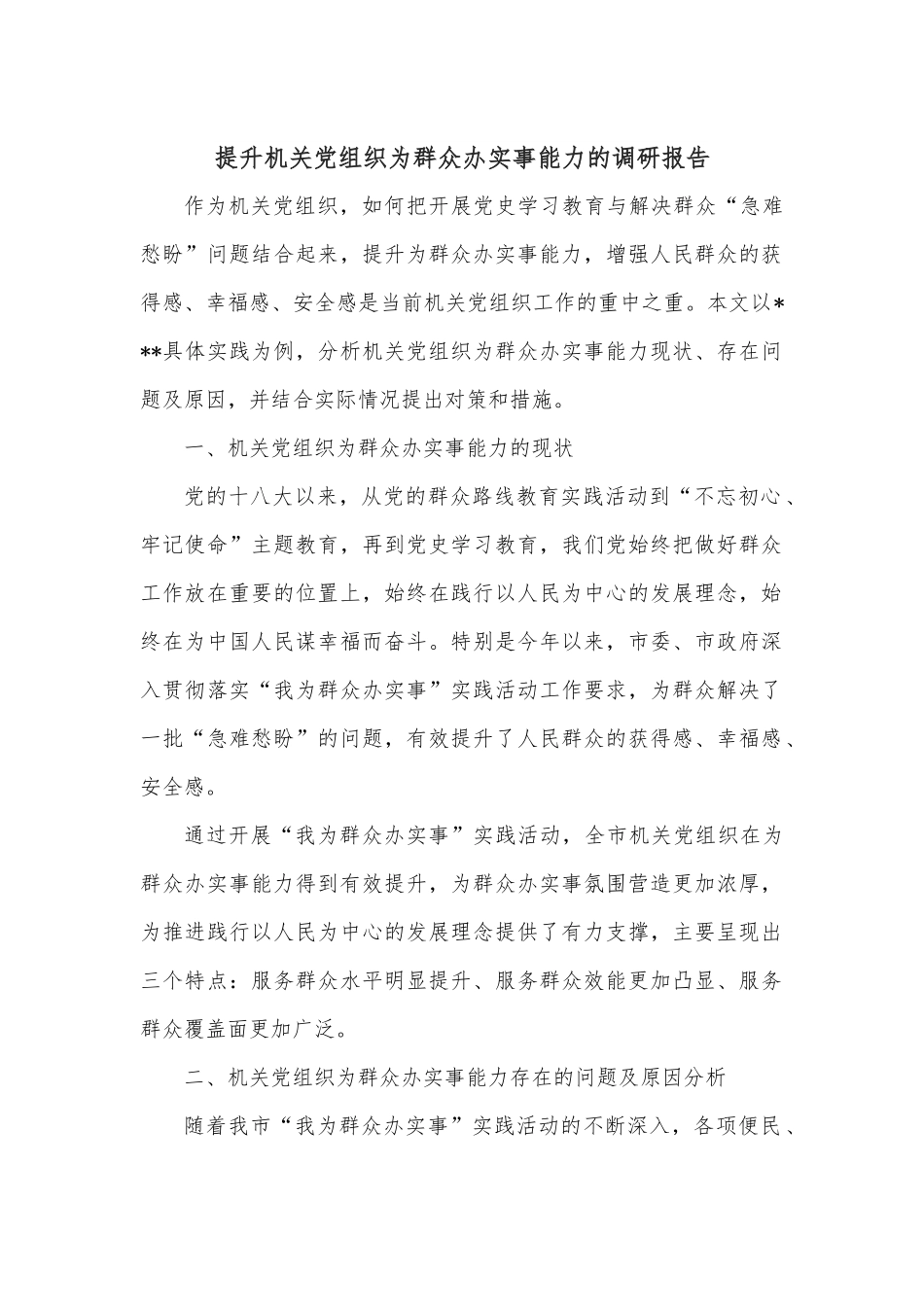 提升机关党组织为群众办实事能力的调研报告作为机关党组织,如何把开展党史学习教育与解决群众“急难愁盼”问题结合起来,提升为群众办实事能力,增强人民群众的获得感、幸福感、安全感是当前机关党组织工作的重中之重。本文以***具体实践为例,分析机关党组织为群众办实事能力现状、存在问题及原因,并结合实际情况提出对策和措施。一、机关党组织为群众办实事能力的现状党的十八大以来,从党的群众路线教育实践活动到“不忘初心、牢记使命”主题教育,再到党史学习教育,我们党始终把做好群众工作放在重要的位置上,始终在践行以人民为中心的发展理念,始终在为中国人民谋幸福而奋斗。特别是今年以来,市委、市政府深入贯彻落实“我为群众办实事”实践活动工作要求,为群众解决了一批“急难愁盼”的问题,有效提升了人民群众的获得感、幸福感、安全感。通过开展“我为群众办实事”实践活动,全市机关党组织在为群众办实事能力得到有效提升,为群众办实事氛围营造更加浓厚,为推进践行以人民为中心的发展理念提供了有力支撑,主要呈现出三个特点:服务群众水平明显提升、服务群众效能更加凸显、服务群众覆盖面更加广泛。二、机关党组织为群众办实事能力存在的问题及原因分析随着我市“我为群众办实事”实践活动的不断深入,各项便民、惠民措施陆续得到落实,社会反响较好,群众也比较认可。但面对新时代人民群众日益增长的需求,我们仍存在一些问题,也面临一些挑战,主要体现在以下几方面:(一)宗旨意识不够强,内生动力不足。随着改革成效不断显现,一些党员干部出现了“躺在以往的功劳簿上睡觉”、“干多错多,不干不错”等负面倾向,淡化了全心全意为人民服务的宗旨,自身为民办实事的内生动力不足,从思想上对为民办实事的重要性认识不够到位,联系群众不够积极、带头为民办实事落实不够到位。比如现在交通便捷了,到基层去却少了;通讯发达了,与群众的沟通却难了;网络发达了,对群众诉求的关注却少了,更多关注上级信息,对基层情况只是走马观花。(二)为民办实事的着力点还不够精准。为民办实事应当要做到有的放矢,才能发挥最大的作用。目前有些为民办事的措施没有充分听取群众意见、深入基层调查研究,虽然落实情况较好,但具体落在群众中时,群众的获得感不强,群众所需与具体措施落实有偏差,出现干得多但干不到点上的问题,影响了为民办实事的能力,削弱了为民办实事的成效。(三)解决实际问题的本领还不够强。在服务群众工作中,一些党组织在自身能力、工作手段、服务水平等方面,不能适应新时代服务群众工作的新形势、新任务,在为民办实事工作中没有转变观念,无法科学处理一些遇见的新问题、新矛盾。部分党员干部理论水平有限、服务技能不够、处理矛盾能力不足,更多在处理业务工作,在为民办实事方面的思考不足,一定程度上存在本领恐慌,导致在服务群众过程中质量不高,效果不明显。(四)创新办实事的意识有待加强。对新形势下群众工作面临的挑战没有深刻认识,没有把创新意识融入到服务群众的具体工作中,习惯于用旧思维、老方法去解决新的问题,思想僵化、因循守旧、墨守成规,不能跳出圈子看问题,面对新情况、新问题,不能以开拓的精神面对、分析和寻找解决问题的最佳方案;甚至还有的在“创新”上做表面文章,忙于“唱新”、“编新”,把创新当作动听的口号,而没有将创新工作真正落到实处。(五)为民办实事的长效机制不够完善。久久为功的精神没有在为民办实事中得到很好地落实,缺乏长效监管和落实跟踪机制,为民办实事“一阵风”的情况一定程度存在,上级有检查就做一做,上级没监督就撂一边,很难形成较为持久而有力的工作推动力。(六)为民实事的氛围不够浓厚。宣传报道的力度不足,只顾埋头干事,没有很好地“发声”,群众虽然也能享受到办实事成果,但整体的社会效益不足,没有在党员干部中形成很好的带动作用。三、提升机关党组织为群众办实事能力的实践与探索(一)强化宗旨意识坚守初心。提升机关党组织为群众办实事能力要进一步强化全心全意为人民服务的宗旨意识,这是开展好“我为群众办实事”实践活动的基础。要采取学习研讨、现场...
