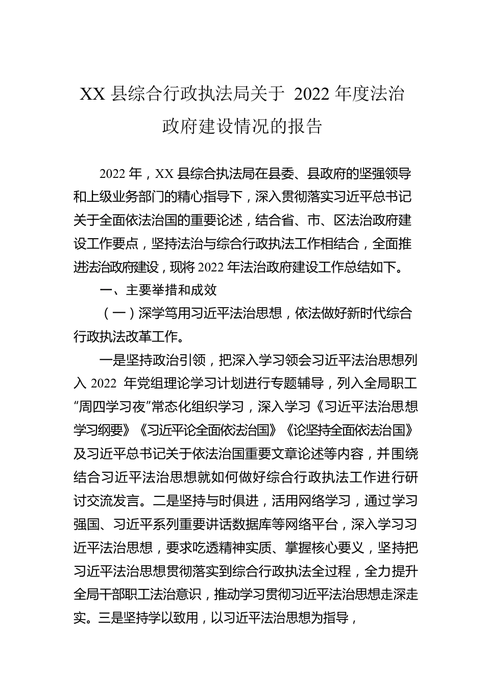 XX县综合行政执法局关于2022年度法治政府建设情况的报告2022年,XX县综合执法局在县委、县政府的坚强领导和上级业务部门的精心指导下,深入贯彻落实习近平总书记关于全面依法治国的重要论述,结合省、市、区法治政府建设工作要点,坚持法治与综合行政执法工作相结合,全面推进法治政府建设,现将2022年法治政府建设工作总结如下。一、主要举措和成效(一)深学笃用习近平法治思想,依法做好新时代综合行政执法改革工作。一是坚持政治引领,把深入学习领会习近平法治思想列入2022年党组理论学习计划进行专题辅导,列入全局职工“周四学习夜”常态化组织学习,深入学习《习近平法治思想学习纲要》《习近平论全面依法治国》《论坚持全面依法治国》及习近平总书记关于依法治国重要文章论述等内容,并围绕结合习近平法治思想就如何做好综合行政执法工作进行研讨交流发言。二是坚持与时俱进,活用网络学习,通过学习强国、习近平系列重要讲话数据库等网络平台,深入学习习近平法治思想,要求吃透精神实质、掌握核心要义,坚持把习近平法治思想贯彻落实到综合行政执法全过程,全力提升全局干部职工法治意识,推动学习贯彻习近平法治思想走深走实。三是坚持学以致用,以习近平法治思想为指导,聚焦行政处罚实施中的重点难点问题,有针对性地进行了部署安排,对于把行政处罚中所建立的优良制度转化为实际的执法效能,将发挥积极作用。(二)落实省市县指示,推进综合行政执法改革工作走深走实一是强化组织领导。作为县综合行政执法指导办公室设立单位,具体抓改革的各项工作推进,统筹推进深化行政执法体制改革、统筹协调和指导监督行政执法工作。二是推动“一支队伍管执法”。因地制宜谋划15个乡镇的执法队设置模式,下沉359名执法人员到10个赋权镇街,实有人员下沉比例80.85%;强化镇街的主体地位,明确镇街的镇长(主任)担任综合行政执法队队长,整合基层站所,纳入“县属乡用共管”体系;构建人大监督、纪检监察监督、司法监督、舆论监督、群众监督等多维度常态化执法监督体系,打造一体化行政执法监督闭环,按照“一专多能”要求,由相关业务主管部门给与相应指导和培训,同时常态化开展岗前教育、集中法制培训、日常学习等,培养综合型的执法人才;三是坚持“一张清单”管理。全面完成执法目录总清单、综合执法清单、专业执法清单、乡镇赋权清单、检查事项清单的梳理,逐条逐项界定执法和监管边界,目前综合行政执法事项1448项,占全县行政执法事项5218的27.75%。推动事项赋权,根据实际需求赋权到各镇街,目前我县城区三街道的赋权事项为517项,三个中心镇的赋权事项为485项,其他乡镇的赋权事项为105项,5个山区乡采用辐射模式。定期组织赋权事项执法效能“回头看”,在实际运行中动态调整赋权事项。厘清监管职责边界,建立健全赋权过程中部门与镇街无缝接的监管机制,强化监管部门与镇街的执法协作,避免监管漏洞。四是积极探索,求新求变。一是创新设立台州民革法律服务团“大综合一体化”XX工作站,聘请民革律师和法律工作者加入我县“综合行政执法讲师团”,按“一月一主题”给镇街执法队员开展综合法律、执法规范、执法流程、线上系统应用操作等培训,目前已举办6期。台州民革法律服务团“大综合一体化”XX工作站工作,得到市政协副主席、民革台州主委褚义军的点赞肯定。二是创新推出“三色三环”工作法,全领域推进"综合查一次"。深化柔性执法,探索实施跨领域跨部门“综合查一次”,针对事前、事中、事后环节创新推出“事前教一次”、“综合查一次”、“回头看一次”,并根据检查对象自查自纠以及现场检查情况,对检查对象开展“红、黄、绿”三色赋码监管,分别赋予不同的监管频次以及不同的惩戒力度,提高对违法行为的精准监管力度,截止目前,我县已开展跨部门“综合查一次”1289次,重复违法行为数量明显减少。《XX县探索实施“三环三色”工作法提升宗教领域法治化水平》获市委常委、统战部长朱巧湘批示肯定推广。三是结合本地特色,将XX山和合文化融入“大综合一体化”行政执法革的实践中,开展“和合执法队”创建工作,打造县域社会治理样板。文章《浙江XX探索和合执法...
