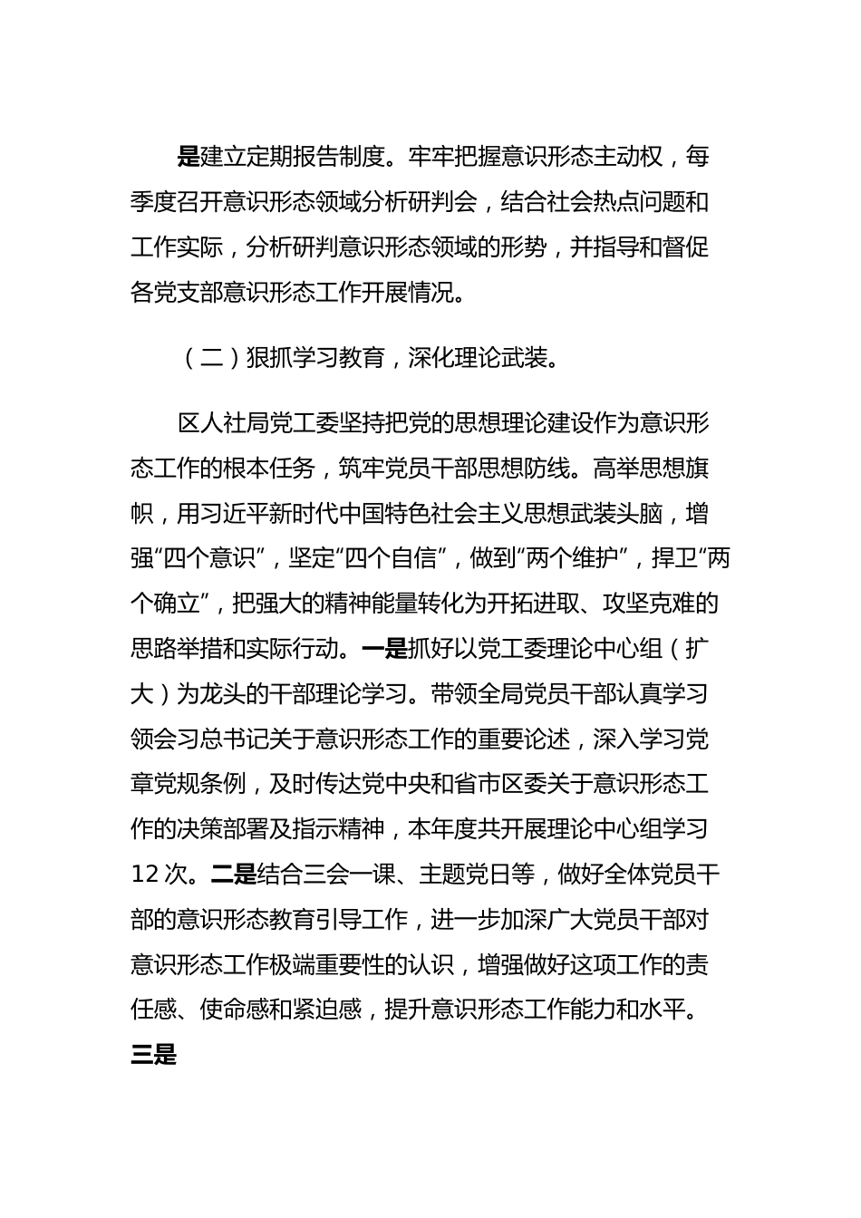 某局党工委2023年意识形态领域工作汇报今年以来,XXX党工委认真贯彻落实中央、省、市、区关于意识形态工作的决策部署和指示精神,牢牢把握正确的政治方向,以习近平总书记关于意识形态重要论述为指导,认真落实意识形态工作主体责任,深入学习贯彻上级关于意识形态工作的精神,紧紧围绕我局重点工作任务,找准立足点、切入点,扎实做好意识形态工作。现将具体工作情况汇报如下:一、工作举措和进展成效(一)强化组织领导,确保责任落实。我局党工委坚持党建统领,围绕党管意识形态的原则,全面落实意识形态工作责任制。局党工委书记作为第一责任人,旗帜鲜明的站在意识形态工作第一线,亲自主抓。班子其他成员按照“一岗双责”要求,对分管职责范围内的意识形态工作负直接责任。各支部书记认真抓好落实,层层传导压力,不折不扣地把意识形态工作落到实处。一是强化日常管理。局党工委把意识形态工作作为党的建设重要内容,与业务工作和党的建设工作紧密结合,同部署、同落实、同检查、同考核。二是严格审核把关制度。凡需上报或在公众号平台上发表涉及意识形态工作的信息,均由局领导审核签发后报送,确保发布的信息内容始终坚持正确的政治方向。三是建立定期报告制度。牢牢把握意识形态主动权,每季度召开意识形态领域分析研判会,结合社会热点问题和工作实际,分析研判意识形态领域的形势,并指导和督促各党支部意识形态工作开展情况。(二)狠抓学习教育,深化理论武装。区人社局党工委坚持把党的思想理论建设作为意识形态工作的根本任务,筑牢党员干部思想防线。高举思想旗帜,用习近平新时代中国特色社会主义思想武装头脑,增强“四个意识”,坚定“四个自信”,做到“两个维护”,捍卫“两个确立”,把强大的精神能量转化为开拓进取、攻坚克难的思路举措和实际行动。一是抓好以党工委理论中心组(扩大)为龙头的干部理论学习。带领全局党员干部认真学习领会习总书记关于意识形态工作的重要论述,深入学习党章党规条例,及时传达党中央和省市区委关于意识形态工作的决策部署及指示精神,本年度共开展理论中心组学习12次。二是结合三会一课、主题党日等,做好全体党员干部的意识形态教育引导工作,进一步加深广大党员干部对意识形态工作极端重要性的认识,增强做好这项工作的责任感、使命感和紧迫感,提升意识形态工作能力和水平。三是拓展党员教育新阵地,强化“学习强国”、支部微信群等线上学习平台的推广使用。提高全体党员干部言行的甄别能力、舆情的引导能力,确保意识形态工作政治导向不偏差、不含糊、不动摇。(三)注重宣传引导,营造良好舆论环境。以弘扬社会主义核心价值观为主旋律进行宣传,严格规范党员干部言论,自觉担负起新形势下宣传思想工作的使命任务,切实把党员干部士气鼓舞起来,精神振奋起来,确保主旋律和正能量在意识形态领域占有主导地位。一是牢牢掌控网络意识形态主导权。建立党务政务公开制度,依托区政府官网、微信公众号平台、宣传栏等形式,及时发布人事人才、公共就业、社会保险、劳动关系等人社领域民生动态信息。及时做好重要节点和敏感时期的舆论监管,针对可能发生的舆情做好防范和处置,做好信访维稳工作。二是妥善处置网络舆情。认真做好12345热线平台、一体化信访系统、区委网信办转办件回复等网络舆情咨询、投诉办理工作,本年度,信访、投诉平台共收件xxx宗,网信转办xx件。始终将“阳光答复”贯穿于信访工作中,确保事事有回音、件件有落实。三是加强对意识形态领域的日常监督,通过日常监督检查、谈心谈话、走访调研等方式,对党员意识形态上的错误思想早提醒、早纠正。不定期排查意识形态领域风险隐患和薄弱环节,及时发现和掌握苗头性倾向性问题,加强分析研判管控,对大是大非问题和政治原则问题,敢于发声、敢于亮剑,始终站稳舆论阵地建设的制高点,持续营造人社系统良好舆论氛围。(四)强化责任考核,推动工作高效开展。建立健全意识形态工作责任制的检查考核制度,推动考核工作规范化、制度化和常态化。一是党支部定期向党工委专题汇报意识形态工作,对重大理论、重大事件、重要社情民意中的苗头倾向性的问题,有针对性...