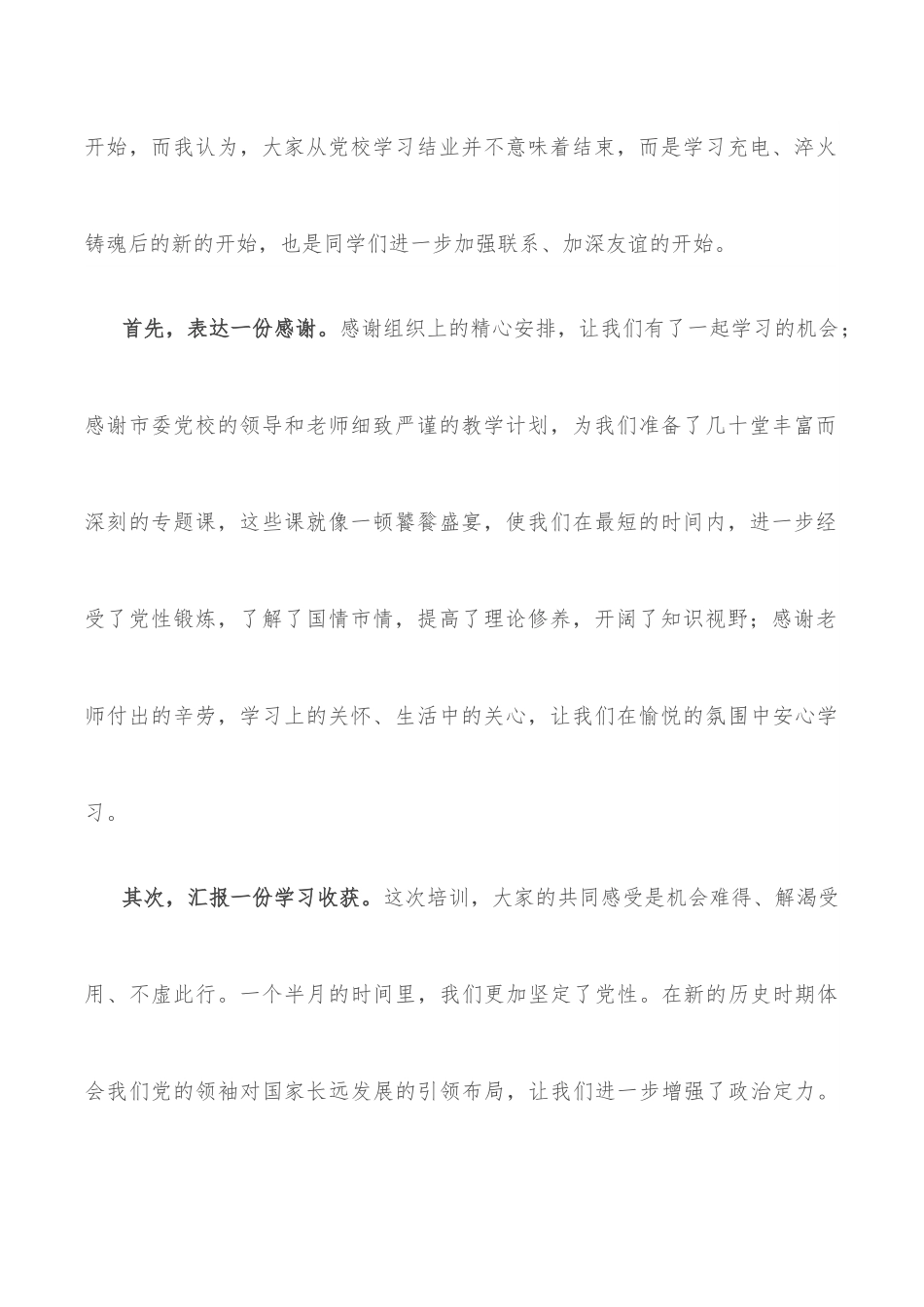党校培训结业发言聚也匆匆,散也匆匆。一转眼,六周的党校学习生活就要结束了。今天我们将挥手作别,回到各自的工作岗位上。此时此刻,心中既有不虚此行的充盈和欢喜,也有依依不舍的感怀与惆怅。六周的时间很短暂,但这段学习的经历和同学之间的友谊,却能令我们一生难忘,朝夕相处、交流讨论、结伴考察、相学相帮,在这个大集体大家庭中,有很多的人和事,很多的记忆和故事会镶嵌在今后的人生历程中,并不断地得以回忆和延续。曾看过一部于谦主演的电影《老师好》,其中有这样一段话:“人生就是一次次幸福的相聚,夹杂着一▪次次伤感的别离。我不是在最美好的时光遇见了你们,而是遇见了你们,才有了这段最美好的时光。”这就告诉我们,人生总是从一个又一个的聚散结束或开始,而我认为,大家从党校学习结业并不意味着结束,而是学习充电、淬火铸魂后的新的开始,也是同学们进一步加强联系、加深友谊的开始。首先,表达一份感谢。感谢组织上的精心安排,让我们有了一起学习的机会;感谢市委党校的领导和老师细致严谨的教学计划,为我们准备了几十堂丰富而深刻的专题课,这些课就像一顿饕餮盛宴,使我们在最短的时间内,进一步经受了党性锻炼,了解了国情市情,提高了理论修养,开阔了知识视野;感谢老师付出的辛劳,学习上的关怀、生活中的关心,让我们在愉悦的氛围中安心学习。其次,汇报一份学习收获。这次培训,大家的共同感受是机会难得、解渴受用、不虚此行。一个半月的时间里,我们更加坚定了党性。在新的历史时期体会我们党的领袖对国家长远发展的引领布局,让我们进一步增强了政治定力。党校给我们的最大财富是什么,应该不仅是书面的理论,也不仅是丰富的知识,而是一种对远大理想信念的不懈追求,我认为这就是今天在党校学习的真谛。一个半月的时间里我们收获了丰富的知识。从马克思主义理论到习近平新时代中国特色社会主义思想,从革命传承到新时代的建设,从宏观经济到产业发展,从传统文化到社会治理,每一个课程都是精品,每一堂授课我们都在吸取营养,我们都在愉悦中增长了见识,更让我们学到了很多很多新的理念。一个半月的时间里我们提高了素质能力。从分班授课到集体大讲堂,从专题讲座到师生共研,从互动交流到现场教学,每一个教学环节都凝结着校领导的精心设计;每一个教学环节都是老师们知识积累的绽放;每一个教学环节都让我们思想得到了启迪,能力得到了提高,视野和胸襟更加开阔。最后,表示一份决心。一个半月的学习培训虽然短暂,但对于我们个人的成长来说,是一次难得的“充电”和“加油”。春季学期三个班的同学来自不同领域、不同地域、不同岗位,都有着丰富的工作经验、生活阅历和渊博的学识,同他们一起学习的过程中,我感受到了自己经验的浅薄和知识的匮乏。回到工作岗位后,我们一定把这次培训学习当做一个新的工作起点,把在党校养成的优良作风秉承下去、坚持下来,指导和规范自己的言行,做到勤奋学习、敬业奉献、求真务实、严于律己;把培训当中积累的理论知识真正消化吸收、提炼升华,结合各自工作,转化成为指导工作的新思路、促进工作的新方法、推进工作的新举措,积极投身新时期**经济社会发展,为“精致城市·幸福**”建设贡献自己的一份力量。