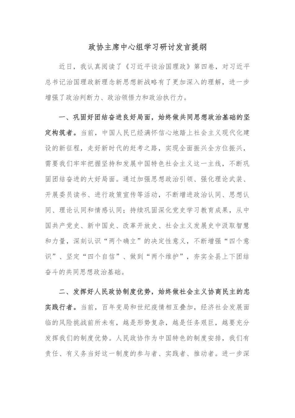 政协主席中心组学习研讨发言提纲近日,我认真阅读了《习近平谈治国理政》第四卷,对习近平总书记治国理政新理念新思想新战略有了更加深入的理解,进一步增强了政治判断力、政治领悟力和政治执行力。一、巩固好团结奋进良好局面,始终做共同思想政治基础的坚定构筑者。当前,中国人民已经满怀信心地踏上社会主义现代化建设的新征程,走好新时代的赶考之路,实现全面振兴全方位振兴,需要我们牢牢把握坚持和发展中国特色社会主义这一主线,不断巩固团结奋进的大好局面。通过加强思想政治引领、强化理论武装、开展委员读书、进行政策宣传等活动,不断增进政治认同、思想认同、理论认同和情感认同;持续巩固深化党史学习教育成果,从中国共产党史、新中国史、改革开放史、社会主义发展史中汲取智慧和力量,深刻认识“两个确立”的决定性意义,不断增强“四个意识”、坚定“四个自信”、做到“两个维护”,夯实全县上下团结奋斗的共同思想政治基础。二、发挥好人民政协制度优势,始终做社会主义协商民主的忠实践行者。当前,百年变局和世纪疫情相互叠加,经济社会发展面临的风险挑战前所未有,越是形势复杂,越是任务艰巨,越要充分发挥我们的制度优势。人民政协作为中国特色的制度安排,我们有责任、有义务当好这一制度的参与者、实践者、推动者。进一步深化对政协工作特点和规律性认识,坚持破立并举,紧扣加强党对人民政协工作的领导,更好地发挥专门协商机构作用,提高委员能力素质和履职水平,持续推进政协工作制度和机制创新,不断健全完善政协党组听取政协机关党建工作汇报;协商议题提出、成果采纳、落实反馈;以及委员培训、推荐、管理、考评等制度机制,切实把人民政协的制度效能充分地释放出来,为推进我县协商民主作出积极贡献。三、履行好人民政协工作职责,始终做建功新时代的不懈奋斗者。今年是中共二十大召开之年。全县政协组织和广大政协委员将把迎接二十大、学习宣传贯彻二十大精神作为重要政治任务,切实做到学出忠诚信仰,学出责任担当,学出奋进动力。坚持建言资政与凝聚共识双向发力,大力弘扬团结奋斗的优良传统,用好统一战线这个重要法宝,讲好身边故事、讲好政协故事、讲好**故事,赢得全县人民共鸣,汇聚各方面合力。坚持协商民主与服务群众相统一,自觉把“民之关切”作为“行之所向”,扎实开展视察调研等协商议政活动,展现“为国履职、为民尽责”的情怀,担当“凝心聚力、促进发展”的使命,以实际行动迎接中共二十大胜利召开!