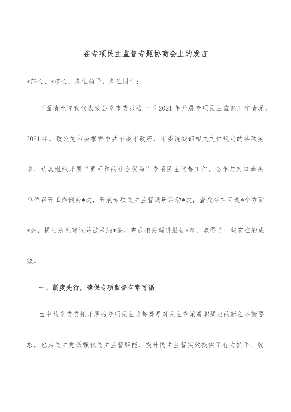 在专项民主监督专题协商会上的发言*部长、*市长,各位领导、各位同仁:下面请允许我代表致公党市委报告一下2021年开展专项民主监督工作情况。2021年,致公党市委根据中共市委市政府、市委统战部相关文件规定的各项要求,认真组织开展“更可靠的社会保障”专项民主监督工作。全年与对口牵头单位召开工作例会*次,开展专项民主监督调研活动*次,查找存在问题*个方面*条,提出意见建议并被采纳*条,完成相关调研报告*篇,取得了一些实在的成效。一、制度先行,确保专项监督有章可循由中共党委委托开展的专项民主监督既是对民主党派履职提出的新任务新要求,也为民主党派强化民主监督职能、提升民主监督实效提供了有力抓手。致公党市委不断提高政治站位,深入学习市委市政府深入排查解决突出民生问题各项部署,聚焦“更可靠的社会保障”民生工作,统筹开展专项民主监督,助推民生实事不断强化。市委挖掘政治素质优良、专业水平较高的成员组建工作团队,主委挂帅多次组织会议,带队调研监督。市委制定了严密细致的实施方案,明确工作原则、监督内容、监督形式、工作步骤、工作保障等*个方面*项具体规定,使专项民主监督工作制度化、程序化、规范化,明确工作目标、工作要求、责任分工。二、深入一线,做到民主监督有据可查致公党**市委专项民主监督组或开会座谈、或实地调研、或明察暗访,在面对面的交流、零距离的接触中,掌握了大量关于“更可靠的社会保障”工作的第一手资料。正是通过这些深入一线、用心用力挖掘实情的考察调研,专项民主监督才有了鲜活的生命力。去年3月,组织专家组成员专题调研我市殡葬改革与发展;5月,工作组成员参加*市“十四五”养老服务发展规划和*民政事业“十四五”规划的专家论证会并提出相关意见建议;6月,主委带队赴市儿童福利院开展儿童福利和未成年人保护工作专项民主监督实地调研,出席养老机构等级评定会,并参加了民政局*红色地名宣传教育活动;10月,参加康养+暨康复辅助器具宣传周产业推介会;12月,专题调研考察市民政局“我为群众办实事”实践活动民生惠民实事项目,参加2021年度深入排查深入排查解决突出民生问题专项督查,实地调研部分医院、小学和社区,并就相关工作问题进行访谈。三、锐意建言,促使民主监督有力可使致公党*市委积极行动,充分发挥各自优势特色,紧盯“更可靠的社会保障”任务推进中的薄弱环节和突出问题,深入开展专题深入的调研,及时发现和反映存在的问题,提出了许多切实可行的对策和意见建议。2021年度,致公党市委结合参政议政重要职能,组织精兵强将开展调查研究,主副委分别亲自担任多项调研课题负责人,对调研工作、调研报告、成果转化进行指导。先后完成婴幼儿托育、居家养老、老年人跨越“数字鸿沟”、现代医疗体系、高质量发展完善中医药健康服务体系等*篇专题调研报告,分别从工作现状、存在问题、原因分析、对策建议等方面进行了深入的研究,部分研究成果在致公党省委、市委的评审中获奖。比如在《大力发展家庭养老照护床等居家养老模式的建议》中,发现问题:1.居家养老服务项目供需失衡;2.居家养老服务专业人员供需失衡;3.居家养老服务质量供需失衡;4.服务分配与人群分布不对称,有效供给不足。提出建议:1、大力发展家庭床位等居家医疗模式,破解供需失衡;2、发展家庭床位的有效建议。四、协作联动,赢得党派履职有力提升市民政局等政府部门和致公党派的沟通协作进一步加强。在开展专项民主监督活动时,致公党市委结合对口联系工作,注重及时与监督领域的相关部门进行联系和沟通,保持良好的合作关系。提出的意见建议,意见中肯、建议富有建设性,得到了部门的认可,部门与党派协作互动的氛围基本形成。党派监督能力和实效得到提升,社会影响力进一步扩大。通过开展“更可靠的社会保障”专项民主监督活动,致公党派更好地服务于党委政府中心工作,反映的问题有针对性,提出的建议有操作性,履职能力得到了提升。在新的一年中,我们将按照党委政府的统一安排和要求,进一步做好今年的专项民主监督工作。还有一点具体的建议:*已进入老龄化社会,高龄化、空巢化、失能化趋势加快,建议推进居家养老居...
