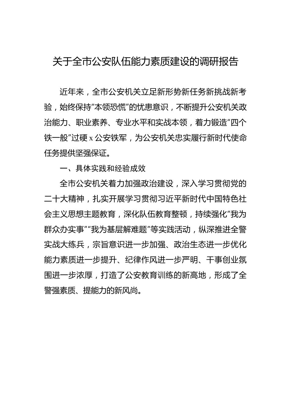 关于全市公安队伍能力素质建设的调研报告近年来,全市公安机关立足新形势新任务新挑战新考验,始终保持“本领恐慌”的忧患意识,不断提升公安机关政治能力、职业素养、专业水平和实战本领,着力锻造“四个铁一般”过硬x公安铁军,为公安机关忠实履行新时代使命任务提供坚强保证。一、具体实践和经验成效全市公安机关着力加强政治建设,深入学习贯彻党的二十大精神,扎实开展学习贯彻习近平新时代中国特色社会主义思想主题教育,深化队伍教育整顿,持续强化“我为群众办实事”“我为基层解难题”等实践活动,纵深推进全警实战大练兵,宗旨意识进一步加强、政治生态进一步优化能力素质进一步提升、纪律作风进一步严明、干事创业氛围进一步浓厚,打造了公安教育训练的新高地,形成了全警强素质、提能力的新风尚。(一)构建了实战练兵新思路。突出练兵先练“长”,组织各级领导干部开展政治轮训、培训考核、比武竞赛,调查研究,切实形成大项任务冲在前、关键时刻站排头、日常工作干在先的实干担当氛围。突出基础训练、身体素质心理健康“三维”发力,通过持续开展应知应会基本理论法规、适岗需求基本操作技能“双达标”和“健康警营”活动,大力建设心理服务团队,有效调动了广大民警辅警投身实战练兵的训练热情。突出“科学分类、精准施策、追赶超越”工作,科学制定量化考核标准,开展市、县两级公安机关教育训练画像评估,持续推进实战训练工作追赶超越高质量发展。(二)建设了警务专业新队伍。广大民警辅警履行岗位职责能力普遍提高,业务技能更加精湛,在各领域培养造就一大批适应新时代要求、发挥关键作用的专门人才和行家里手。从领导干部、先进典型、业务骨干、标兵能手中层层遴选,建成市、市、县三级教官库。目前,全市共有各级各类专兼职教官x人,经过培训认证的小教员达x余名,先后有x个集体和x名个人被评为部级大练兵“标兵集体”“标兵个人”。(三)研发了实战实训新教程。通过开展优秀实战专题课程和“微课程”制作评比活动,研发编写执法规范、警务实战、心理建设等教案教程。组织部、市、市级培训教官制作拍摄重大安保勤务及实战技能、疫情防控系列视频、微课程,让一线民警利用工作间隙和业余时间,随时随地开展自主式学习训练。全市公安机关累计编撰训练教材x本、手册指引x册、案例汇编x套,制作微课慕课视频片x部,教学训练教材建设取得实质性突破。(四)取得了实战训练新成果。先后有x个集体和x名个人荣获全国公安机关教育训练工作成绩突出集体、先进个人;x个集体、x名个人受到全国公安系统英模模范立功集体表彰大会表彰;x个集体和x名个人在公安部举办的比武竞赛中斩获荣誉;首创的“健康警营”理念被公安部写入《公安政治工作“十四五”规划》,x个创新技战法被公安部收录推广,x个经验做法被市级以上媒体宣传报道。练兵工作有力助推了建党x周年、十四运、北京冬奥会、二十大安保维稳、中国-中亚峰会安保和疫情防控等一系列重大安保任务的圆满完成。二、存在的短板和不足近年来,全市公安机关始终将练兵的“准星”瞄准实战的“靶心”,坚持“干什么练什么、缺什么补什么”的要求,以最高标准、最强组织、最实举措、最佳状态,扎实有序深入推进全警实战练兵,取得了一定的成效,但仍存在一些短板和不足。(一)重视程度还有待提高。一些公安基层单位受条件限制,教育训练软硬件保障相对滞后,甚至县级公安机关没有专门的训练场地,能够承担教育训练任务的骨干力量相对较少;个别基层领导和一些部门负责人对教育训练工作没有全面、深刻的认识,导致教育训练工作停于浅层少数民警满足于“够用”而较少考虑自我提升,重视不够。(二)训练模式还有待完善。少数公安基层单位组织实战训练的力量较为薄弱,集中性的组训工作或专项训练任务只能是简单落实、疲于应对;在实战训练中科目设置不够精准、内容不够丰富、形式不够多样,设置上容易忽视个性差异,没能做到根据不同岗位警种、年龄层次、文化程度等来针对性设置训练科目,训练上依然以单向教学模式占主导,导致教育训练缺乏针对性和吸引力;少数兼职教官既要完成本职工作,又要兼顾教学任务,导致教研能力...