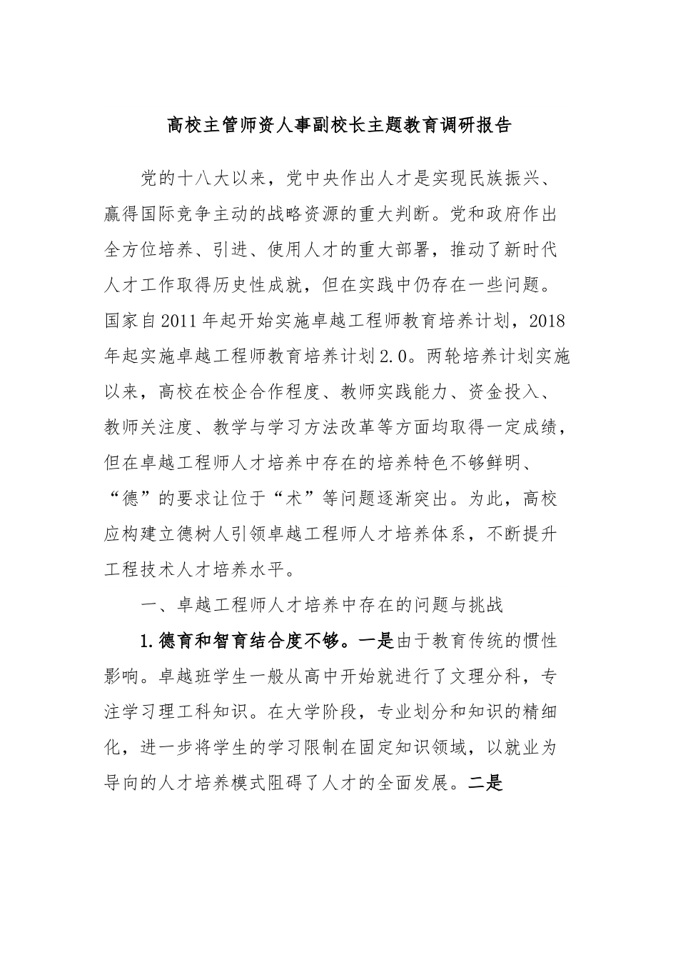 高校主管师资人事副校长主题教育调研报告党的十八大以来,党中央作出人才是实现民族振兴、赢得国际竞争主动的战略资源的重大判断。党和政府作出全方位培养、引进、使用人才的重大部署,推动了新时代人才工作取得历史性成就,但在实践中仍存在一些问题。国家自2011年起开始实施卓越工程师教育培养计划,2018年起实施卓越工程师教育培养计划2.0。两轮培养计划实施以来,高校在校企合作程度、教师实践能力、资金投入、教师关注度、教学与学习方法改革等方面均取得一定成绩,但在卓越工程师人才培养中存在的培养特色不够鲜明、“德”的要求让位于“术”等问题逐渐突出。为此,高校应构建立德树人引领卓越工程师人才培养体系,不断提升工程技术人才培养水平。一、卓越工程师人才培养中存在的问题与挑战1.德育和智育结合度不够。一是由于教育传统的惯性影响。卓越班学生一般从高中开始就进行了文理分科,专注学习理工科知识。在大学阶段,专业划分和知识的精细化,进一步将学生的学习限制在固定知识领域,以就业为导向的人才培养模式阻碍了人才的全面发展。二是由于高校思想政治工作存在短板与漏洞。思想政治工作治理体系构建有待加强,思想政治工作方式有待创新,“三全育人”推进工作在卓越班人才培养中开展得不尽如人意。2.存在利己主义倾向。在卓越计划的实施中,为保证学生生源的质量和人才培养效果,各高校往往喜欢采用强物质性的激励政策。在实践中,具有实际个人效益的活动往往受到学生的追捧,而强调奉献的活动则少有人响应。此外,卓越班中部分学生难以合理地在个人价值与社会价值之间进行权衡取舍与统筹协调,不能正确权衡个人理想与社会理想的关系。3.党团班关系不够融洽。一是党组织的战斗堡垒作用没有得到充分发挥。由于卓越班内部存在个人主义倾向,班级活力不强,党组织和团组织也很难在卓越班的班级内部产生很强的影响力和指导性。二是班级缺乏活力和凝聚力。在卓越班中,班级成员普遍缺乏共同的目标,班级凝聚力自然也就受到影响,进而阻碍了党团班关系和谐发展,不利于培养具备良好的组织管理和团结协作能力、较强的交流沟通和环境适应能力的卓越工程师人才。二、解决卓越工程师人才培养问题的一般遵循1.培根铸魂,坚守立德树人初心。习近平强调,“培养什么人,是教育的首要问题”。学生作为个体有成长成才和全面发展的需要,而思想政治工作是做人的工作,因而需要重视、回应、关切学生的合理诉求。学生的成长发展需求与思想政治教育的基本目标不是相互脱离的“两层皮”,二者具有内在的一致性。在卓越班人才培养中,做好学生的思想政治工作,需要围绕学生、关照学生、服务学生,以学生为中心,让学生们通过接受理想信念教育、思想道德教育等,扣好人生第一粒扣子,建立起正确的价值观念与行为准则并以此规范自身行为,在学习与实践中不断提高思想水平、政治觉悟、道德品质、文化素养,最终成为德才兼备、全面发展的人才。2.溯本清源,搭建新型育人体系。面向卓越班人才培养的现状和实际,高校要从培养目标、培养平台、培养机制和具体培养举措等多方面构建新型协同育人体系。德智体美劳“五育”并举中“德”是第一位的。卓越班立德树人工作,要朝着体系化方向改进,构建通识教育、思政课程和课程思政、日常思政交融贯通的思想政治工作体系,优化总体布局。习近平指出,要把立德树人融入思想道德教育、文化知识教育、社会实践教育各环节,贯穿基础教育、职业教育、高等教育各领域,体现到学科体系、教学体系、教材体系、管理体系建设各方面,培根铸魂、启智润心。这一论述为卓越班的人才培养提供了根本遵循和行动指南。3.对症下药,完善班级管理机制。卓越班级的管理与学生的生活、学习和未来发展息息相关。提升卓越班学生班级的管理效度,要以组织建设为先,在学风建设、学生骨干培养、导师队伍支持等方面协同发力,建设新型管理机制。一方面,要注重班级文化建设,通过加强教育引导,管理服务好学生。要正视学生的合理利益诉求,引导学生在关心自身利益的同时推己及人,着力培养学生的全局意识、团结协作精神和社会责任感等,使他们能正确看待个人价值与社会价值、...