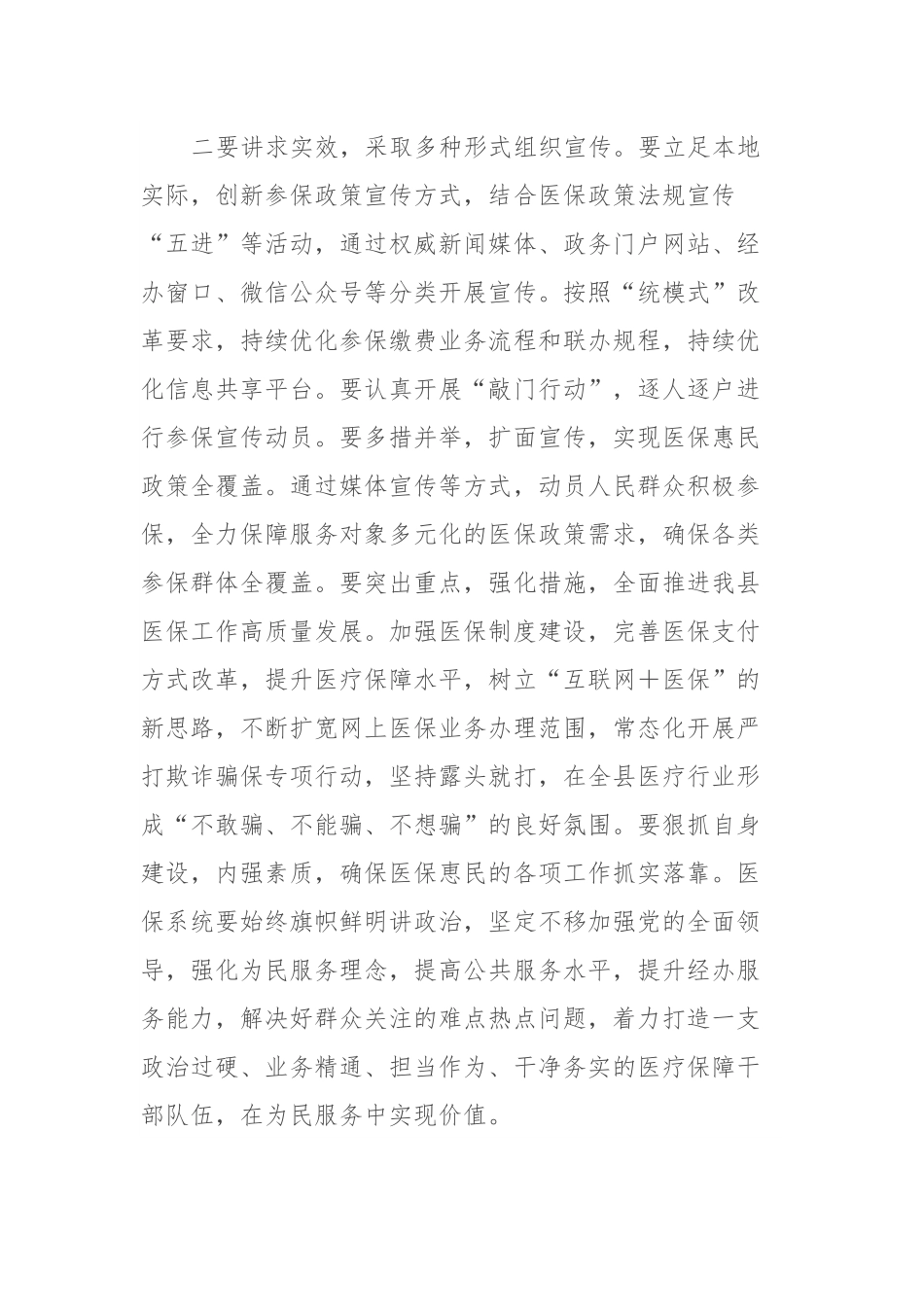 医保局长在全县基本医保全民参保计划集中宣传活动启动仪式上的讲话同志们:为更好推动全县医保政策宣传工作,进一步提高人民群众对医疗保障的认可度和医保政策的知晓度,激发人民群众参加医疗保险热情,更好享受医保待遇,今天,我们汇聚县体育馆,隆重举行基本医保全民参保计划集中宣传活动启动仪式。根据会议安排,相关镇的通知已经做了表态发言,我局XX同志也对基本医保全民参保计划进行了部署安排,下面,我讲几点意见。一要积极采取措施,突破参保瓶颈,针对不同人群,从政策、技术、服务等方面采取措施,巩固和拓展医疗保险参保成果。开展全民参保计划集中宣传,是提升医疗保障政策知晓度、增强群众参保意愿、督促企业履行参保缴费义务、助推医保参保扩面的重要举措。基本医保覆盖全民是“国之大者”,是人民群众获得享受医保待遇和服务的根本前提,是医保事业发展的全局性、基础性、先导性工作。各级医保部门要统一思想认识,强化责任担当,精心谋划部署,主动对接联合财政、教育、卫生健康、税务等部门,主要负责同志要亲自部署、亲自推动,认真组织好、开展好集中宣传活动,持续巩固参保成果。二要讲求实效,采取多种形式组织宣传。要立足本地实际,创新参保政策宣传方式,结合医保政策法规宣传“五进”等活动,通过权威新闻媒体、政务门户网站、经办窗口、微信公众号等分类开展宣传。按照“统模式”改革要求,持续优化参保缴费业务流程和联办规程,持续优化信息共享平台。要认真开展“敲门行动”,逐人逐户进行参保宣传动员。要多措并举,扩面宣传,实现医保惠民政策全覆盖。通过媒体宣传等方式,动员人民群众积极参保,全力保障服务对象多元化的医保政策需求,确保各类参保群体全覆盖。要突出重点,强化措施,全面推进我县医保工作高质量发展。加强医保制度建设,完善医保支付方式改革,提升医疗保障水平,树立“互联网+医保”的新思路,不断扩宽网上医保业务办理范围,常态化开展严打欺诈骗保专项行动,坚持露头就打,在全县医疗行业形成“不敢骗、不能骗、不想骗”的良好氛围。要狠抓自身建设,内强素质,确保医保恵民的各项工作抓实落靠。医保系统要始终旗帜鲜明讲政治,坚定不移加强党的全面领导,强化为民服务理念,提高公共服务水平,提升经办服务能力,解决好群众关注的难点热点问题,着力打造一支政治过硬、业务精通、担当作为、干净务实的医疗保障干部队伍,在为民服务中实现价值。三要注重总结提炼,积极推广好经验好做法。各地要及时总结、集中宣传典型经验,推广行之有效的经验做法,形成长效机制,制度化、规范化、常态化开展参保宣传。全县的医保系统要用公平统一、均等可及的高水平医疗保障惠民政策,持续吸引鼓励群众参保,严格规范企业依法参保,织密医疗保障网络。全县医保系统特别是各级经办机构要认真贯彻落实主题教育中关于大兴调查研究的工作要求,深入企事业单位,宣传政策、解答疑问,同时,用好“医保高铁”这个信息化工具,实现精准扩面。全民参保宣传员要积极投身全市参保扩面工作,重点关注“一老一小”和灵活就业人员这三类群体,通过全面有力的医保宣传,激发群众的参保意愿并做好参保经办服务。四是要打造XX特色的参保政策体系和高水平的待遇保障体系,实现群众由“要我参保”转变为“我要参保”。要紧紧依托“医保高铁”信息平台推进精准扩面,实现参保数据由“信息孤岛”转变为“数据大陆”。要持续发挥“15分钟医保服务圈”及延伸服务点功能,实现参保服务由“等人上门”转变为“服务上门”。要全面运用“XX医保”微信公众号,开展“八走进”活动,实现参保宣传由“单一渠道”转变为“多元发动”。要用公平统一、均等可及的高水平医疗保障惠民政策,持续吸引鼓励群众参保,严格规范企业依法参保,织密医疗保障网络。我县将凝聚合力、勠力同心,从顾大局、惠民生、促发展、保稳定的高度出发,主动对标国家、省、市相关工作部署要求,全力推进城乡居民基本医疗保险全覆盖,为XX加快建设绿色低碳发展示范区提供更加坚实的医疗保障。谢谢大家!