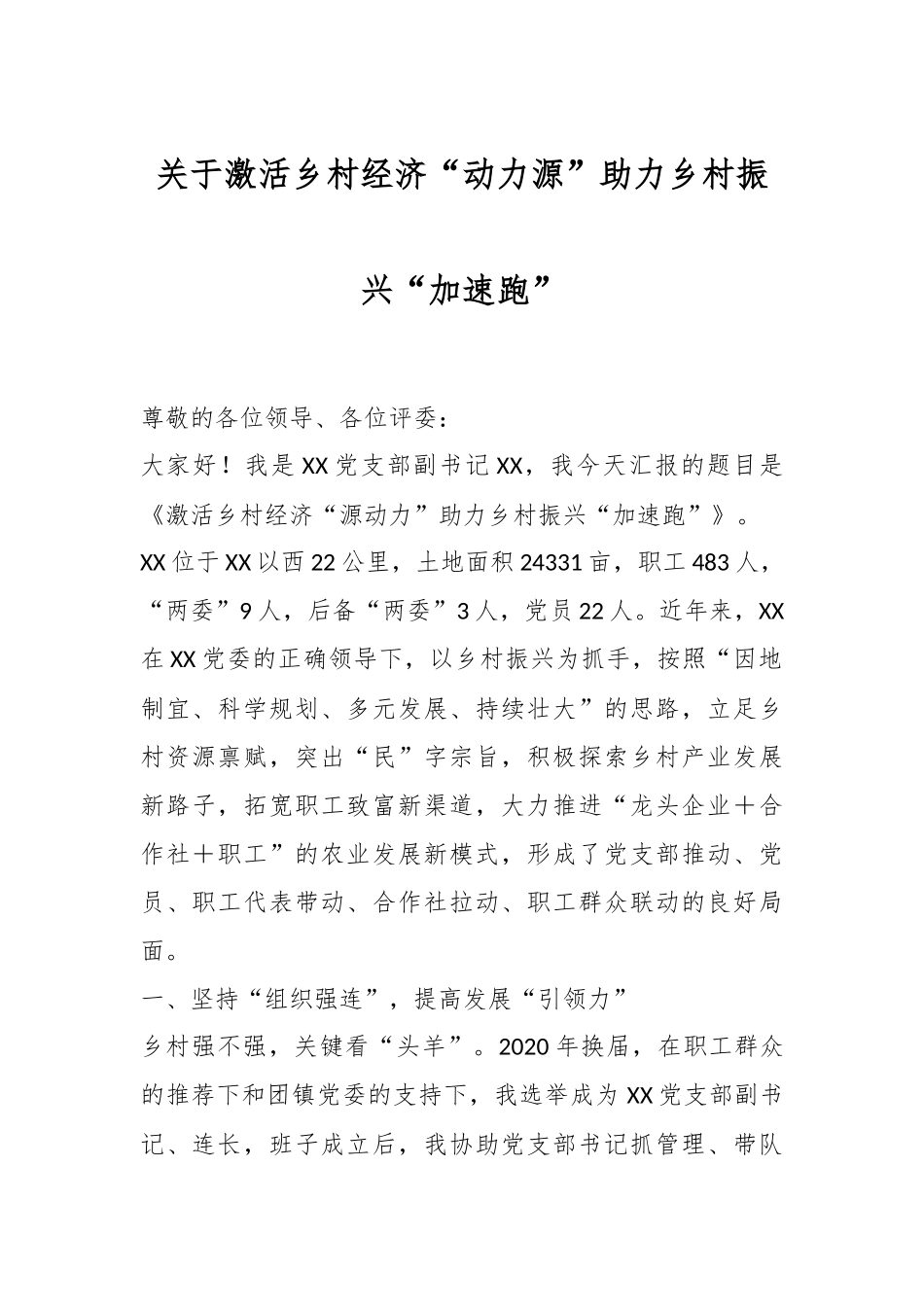 关于激活乡村经济“动力源”助力乡村振兴“加速跑”尊敬的各位领导、各位评委:大家好!我是XX党支部副书记XX,我今天汇报的题目是《激活乡村经济“源动力”助力乡村振兴“加速跑”》。XX位于XX以西22公里,土地面积24331亩,职工483人,“两委”9人,后备“两委”3人,党员22人。近年来,XX在XX党委的正确领导下,以乡村振兴为抓手,按照“因地制宜、科学规划、多元发展、持续壮大”的思路,立足乡村资源禀赋,突出“民”字宗旨,积极探索乡村产业发展新路子,拓宽职工致富新渠道,大力推进“龙头企业+合作社+职工”的农业发展新模式,形成了党支部推动、党员、职工代表带动、合作社拉动、职工群众联动的良好局面。一、坚持“组织强连”,提高发展“引领力”乡村强不强,关键看“头羊”。2020年换届,在职工群众的推荐下和团镇党委的支持下,我选举成为XX党支部副书记、连长,班子成立后,我协助党支部书记抓管理、带队伍,不断提高支部引领力。一是抓好思想建设打基础。把学习习近平新时代中国特色社会主义思想作为首要任务,利用“三会一课”、主题党日活动开展学习,不断提升党员干部的政治意识和政治能力。二是筑牢战斗堡垒补短板选优配齐乡村“两委”班子,班子年龄结构更加合理,学历层次更加优化,干事创业精神更加昂扬。按照“七个标准化”因地制宜,使用运转经费和党建经费8万元修缮阵地,完善配套阵地软硬件设施。三是抓好队伍管理强弱项。按照“两委”特长合理分工、制定工作AB角,严格“两委”日常考核,落实“五必仿五必记”和联系职工群众工作制度,有效破解“两委”班子“庸、懒、散”问题,大大提升了“两委”的贯彻执行力,着力打造一直政治素质过硬、工作能力突出、职工群众满意的“两委”队伍。二、坚持“产业富连”,提高发展“硬实力”乡村富不富,关键看支部。作为党支部副书记、连长,我的主责主业就是要想方设法帮职工群众增收,让职工群众的钱包鼓起来,这样才能通过发展来解难题,凝聚人心。一是要尊重市场。团场综合配套改革后,乡村职工直接面对市场,我通过讲政策、将方法,让职工尊重市场规律和产业发展规律,在提升棉花品质上下功夫,坚持调优做强棉花产业不动摇,以市场需求为导向,以提质增效为目标依托乡村土地资源优势,打造万亩优质棉田。二是敬畏市场。随着这几年棉花行情暴涨暴跌,让我们深深感受到了市场的残酷,为了让职工群众增强抵御风险能力,2022年,乡村以开展“百企助百连”为契机主动与塔河种业合作,从政策、资金、技术等方面,引导职工发展“公司+基地+农户”的种植模式,通过引进推广塔河2号、塔河3号塔河4号等优质棉花品种,打造“一连一品”特色种植模式,2022年棉花平均单产480公斤以上,种植户交售棉花每公斤可享受塔河种业0.3元的扩繁补贴,额外享受XX质量奖补资金0.4元,实现全连增收近450余万元。三是顺应市场。由于部分职工市场意识淡薄,搞生产容易造成一窝蜂,盲目跟风种植,导致产品过剩、卖不出好价钱。我将工作重点放在一个“导”字上,只要对职工有利的,必须正确引导,在尊重职工意愿的前提下,指导职工不断调整优化种植业结构,因地制宜发展茴香,小米等高产值作物套作,积极引导生产基础好、种植规模大、田间配套设施齐全的新型主体开展规模化生产示范创建,扩大粮油种植面积,满足市场需求。2022年乡村实现总产值1.8亿元,职均收入5.6万元。三、坚持“实干兴连”,提高发展“服务力”金杯银杯不如职工的口碑,金奖银奖不如老百姓的夸奖。作为一名基层的党员干部,要把职工群众满意作为最大政绩,珍惜职工赋予的权力,以“时时放心不下”的状态履好职尽好责,请群众参与、让群众评判、受群众监督。一是权为民所用。把权用在为人民群众办实事、谋实惠上,有利于职工群众的事,要千方百计、积极主动、真心实意全力以赴地去做,作为土地腾退大户乡村,30800亩开发性经营地涉及168名种植户,合理妥善安置原有种植户这个棘手的问题,我带领乡村两委白天入户晚上走访耐心讲政策,讲法规,耐心做好解释工作,截至目前,腾退户无一上访。二是利为民所谋。充分尊重民意,发扬民主,用好“四议两公开”“一事一议”...