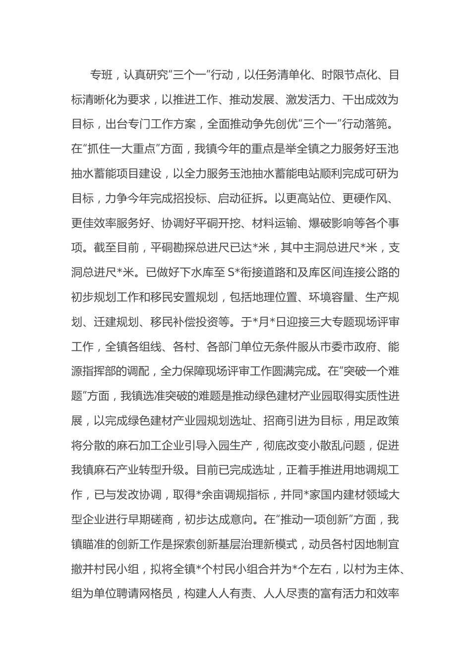 镇2022年迎检工作汇报材料2022年,是党的二十大召开之年,是实施“十四五”规划承上启下的重要一年,是开启全面建设社会主义现代化国家新征程的奠基之年。今年,*镇牢牢把握抽水蓄能百年难遇重大项目建设机会,紧咬市委“*”工作目标,坚持“生态优先、稳中求进、产业富民、融长发展”工作总方针,全力建设更高质量的生态*、平安*、文化*、幸福*。现将半年来重点工作汇报如下:2022年,*镇工作目标为建设更高质量生态平安文化幸福*。发展方针为生态优先、稳中求进、产业富民、融长发展。发展要求为开放开明(要优化环境、创新理念、全面融长)、善作善成(要转变作风、踔厉奋发、落篼落实)、创先争优(要单项争先进,整体夺红旗)。发展路径为“一三五”发展路径,一是要建强一支镇村组党员干部队伍。二是要抓好三大产业,规范发展麻石产业,全力服务能源产业,做大做强农旅产业。三是推进五大行动,基础建设、教育振兴、基层治理、财源建设、生态建设三年行动。将机关干部分为四个大组十六个小组,采取组线包村的形式,由每组的组长(亦即党政负责干部)并选派十六名优秀干部强化联包村工作,指导各村干部合理分工,强力推动各项工作有序开展。抓发展强落实,做好六方面重点工作一、围绕“方向更明”,全力攻坚“三个一”为全面贯彻落实市委“抓住一大重点、突破一个难题、推动一项创新”的争先创优“三个一”行动,我镇成立由书记镇长挂帅的工作专班,认真研究“三个一”行动,以任务清单化、时限节点化、目标清晰化为要求,以推进工作、推动发展、激发活力、干出成效为目标,出台专门工作方案,全面推动争先创优“三个一”行动落篼。在“抓住一大重点”方面,我镇今年的重点是举全镇之力服务好玉池抽水蓄能项目建设,以全力服务玉池抽水蓄能电站顺利完成可研为目标,力争今年完成招投标、启动征拆。以更高站位、更硬作风、更佳效率服务好、协调好平硐开挖、材料运输、爆破影响等各个事项。截至目前,平硐勘探总进尺已达*米,其中主洞总进尺*米,支洞总进尺*米。已做好下水库至S*衔接道路和及库区间连接公路的初步规划工作和移民安置规划,包括地理位置、环境容量、生产规划、迁建规划、移民补偿投资等。于*月*日迎接三大专题现场评审工作,全镇各组线、各村、各部门单位无条件服从市委市政府、能源指挥部的调配,全力保障现场评审工作圆满完成。在“突破一个难题”方面,我镇选准突破的难题是推动绿色建材产业园取得实质性进展,以完成绿色建材产业园规划选址、招商引进为目标,用足政策将分散的麻石加工企业引导入园生产,彻底改变小散乱问题,促进我镇麻石产业转型升级。目前已完成选址,正着手推进用地调规工作,已与发改协调,取得*余亩调规指标,并同*家国内建材领域大型企业进行早期磋商,初步达成意向。在“推动一项创新”方面,我镇瞄准的创新工作是探索创新基层治理新模式,动员各村因地制宜撤并村民小组,拟将全镇*个村民小组合并为*个左右,以村为主体、组为单位聘请网格员,构建人人有责、人人尽责的富有活力和效率的新型基层社会治理共同体。该项工作经过充分前期准备,现已全面铺开,计划将全镇*个村民小组合并为*个,*个村中已有*个完成全部合组工作,总完成进度为*个,占比*%。二、围绕“基础更实”,深入基层强党建扎实开展“四亮创建”。围绕疫情防控、森林防灭火、违规墓地整治、防溺水等中心工作,开展主题当日活动*次,把各级党组织和广大党员的力量集聚到中心工作上来。玉池山村围绕防返贫监测、志愿服务、联络乡友等重点工作成立了*支“妇女工作队”,并选拔当地有决心、有爱心、有公心的女性党员担任“妇女队长”,做到党的中心工作推进到哪里,党的旗帜就飘扬在哪里,组织工作的保障就跟进到哪里。深入推进“从严治党”。出台了全新的《机关管理制度》从考勤、财经管理、公务接待、集中学习等*个方面严明纪律,坚持把纪律挺在前面,从机关开始带头讲规矩,带动全镇上下严格遵循廉洁纪律、群众纪律、工作纪律和生活纪律,让铁的纪律真正成为党员干部的日常习惯。三、围绕“实力更强”,持之以恒抓发展坚持把产业发展作为工作主线,全面推动镇域经济高...