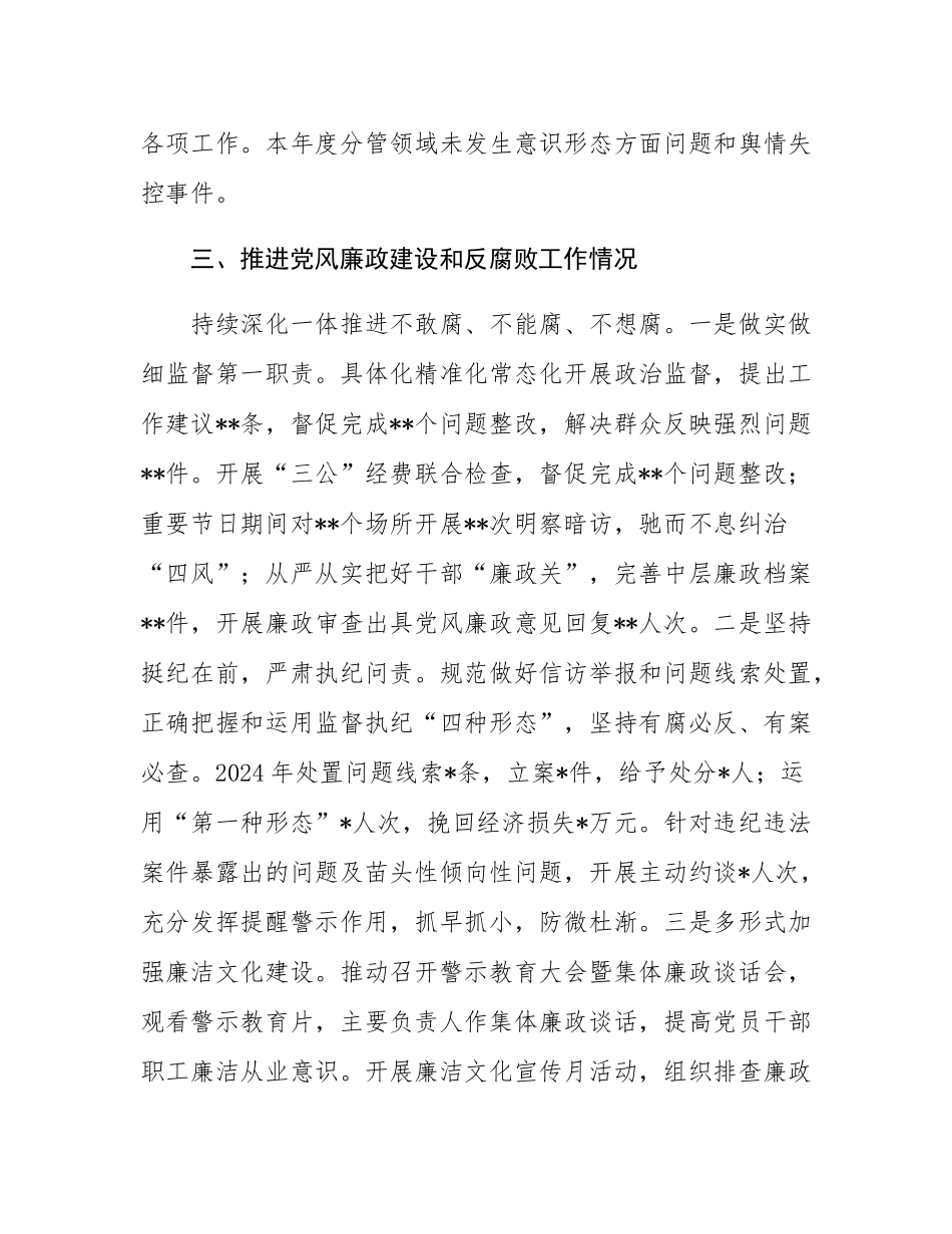 国有企业领导2024年度落实党风廉政建设主体责任述责述廉报告2024年,在市委的正确领导下,我认真贯彻落实上级党风廉政建设和反腐败工作各项部署,聚焦主责主业,忠诚履职尽责,现将本人一年来的履职情况报告如下。一、执行政治纪律和政治规矩情况本人始终把严守政治纪律和政治规矩视为首要职责,坚决维护党中央权威和集中统一领导,在思想上、政治上、行动上同以同志为核心的党中央保持高度一致。持续深学细悟践行总书记关于党的自我革命的重要思想,严格执行“第一议题”制度,认真学习贯彻党的二十大和二十届中纪委三次全会精神,深入领会总书记关于广西工作论述的重要要求。自觉遵守新形势下党内政治生活若干准则,落实党员领导干部双重组织生活制度,以普通党员身份参加所在党支部组织生活,给全面从严治党联系点支部党员上主题党课,推动强化支部党员的党性修养。认真参加上级组织的各类学习培训,努力提升政治素养和业务能力。工作中依纪依规履职,管好身边人,做好身边事,带头执行重大问题请示报告制度,如实报告个人有关事项,自觉抵制特权思想与现象,严格家庭家教家风,以实际行动践行“两个维护”。二、履行管党治党责任情况一是结合实际,研究制定2024年纪检监察工作要点,组织层层签订《党风廉政建设责任书》,推动形成科学定责、全面履责、严肃督责、规范考责的党风廉政建设责任链条“闭环”。二是对照市委巡察组反馈的意见,实地抽查整改情况,对整改进度缓慢的部门制发监督工作反馈单、建议单,有力推进市委巡察反馈的**个具体问题按时保质完成整改。三是加强同级监督和下属企业“一把手”监督。发挥近距离常态化监督优势,开展“一对一”谈心谈话,切实推动同级党政领导班子成员履行全面从严治党主体责任和“一岗双责”责任。春节前集体约谈下属企业“一把手”,督促抓好员工教育管理监督,切实做到严于律己、严负其责、严管所辖,正确履职。四是组织人员列席下属企业党委年度民主生活会和党支部年度组织生活会,督促认真开展批评与自我批评,严肃党内政治生活。五是认真贯彻落实党委关于意识形态工作的决策部署,切实履行意识形态工作主体责任,带领分管部门积极抓好意识形态领域各项工作。本年度分管领域未发生意识形态方面问题和舆情失控事件。三、推进党风廉政建设和反腐败工作情况持续深化一体推进不敢腐、不能腐、不想腐。一是做实做细监督第一职责。具体化精准化常态化开展政治监督,提出工作建议**条,督促完成**个问题整改,解决群众反映强烈问题**件。开展“三公”经费联合检查,督促完成**个问题整改;重要节日期间对**个场所开展**次明察暗访,驰而不息纠治“四风”;从严从实把好干部“廉政关”,完善中层廉政档案**件,开展廉政审查出具党风廉政意见回复**人次。二是坚持挺纪在前,严肃执纪问责。规范做好信访举报和问题线索处置,正确把握和运用监督执纪“四种形态”,坚持有腐必反、有案必查。2024年处置问题线索*条,立案*件,给予处分*人;运用“第一种形态”*人次,挽回经济损失*万元。针对违纪违法案件暴露出的问题及苗头性倾向性问题,开展主动约谈*人次,充分发挥提醒警示作用,抓早抓小,防微杜渐。三是多形式加强廉洁文化建设。推动召开警示教育大会暨集体廉政谈话会,观看警示教育片,主要负责人作集体廉政谈话,提高党员干部职工廉洁从业意识。开展廉洁文化宣传月活动,组织排查廉政风险点**条、签订《家庭助廉倡议书》**份、《干部职工“八小时外”行为活动承诺书》**份,筑牢廉洁家庭防线。四是扎实抓好以案促改促治“后半篇文章”。针对有关人员严重违法违纪问题,制发监督工作反馈单*份,督促做好以案促改工作,督促抓好教育及管理,完善制度建设,充分发挥警示教育治本功效。四、执行廉洁纪律情况自觉遵守《廉洁自律准则》《国有企业领导人员廉洁从业规定》等党纪条规,严格执行民主集中制和“三重一大”决策制度,做到依规依纪依法用权。认真落实中央八项规定及其实施细则精神,在工作和生活中自觉接受各方面监督,牢固树立廉洁从业意识。自觉净化个人“社交圈”、“朋友圈”,坚决防止“灯下黑”;带头抓好家庭家教家风建设,...
