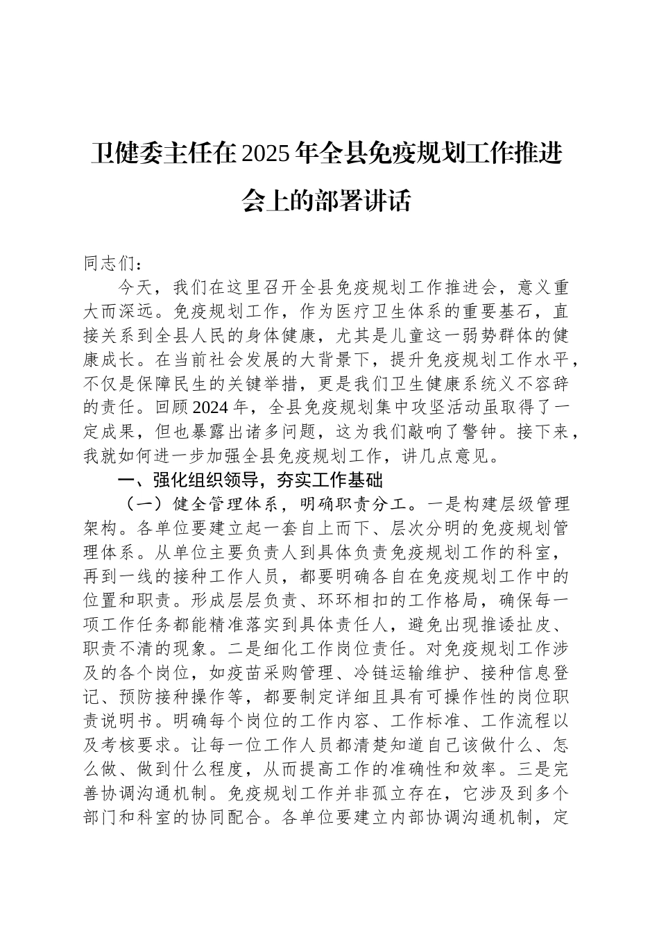 卫健委主任在2025年全县免疫规划工作推进会上的部署讲话同志们:今天,我们在这里召开全县免疫规划工作推进会,意义重大而深远。免疫规划工作,作为医疗卫生体系的重要基石,直接关系到全县人民的身体健康,尤其是儿童这一弱势群体的健康成长。在当前社会发展的大背景下,提升免疫规划工作水平,不仅是保障民生的关键举措,更是我们卫生健康系统义不容辞的责任。回顾2024年,全县免疫规划集中攻坚活动虽取得了一定成果,但也暴露出诸多问题,这为我们敲响了警钟。接下来,我就如何进一步加强全县免疫规划工作,讲几点意见。一、强化组织领导,夯实工作基础(一)健全管理体系,明确职责分工。一是构建层级管理架构。各单位要建立起一套自上而下、层次分明的免疫规划管理体系。从单位主要负责人到具体负责免疫规划工作的科室,再到一线的接种工作人员,都要明确各自在免疫规划工作中的位置和职责。形成层层负责、环环相扣的工作格局,确保每一项工作任务都能精准落实到具体责任人,避免出现推诿扯皮、职责不清的现象。二是细化工作岗位责任。对免疫规划工作涉及的各个岗位,如疫苗采购管理、冷链运输维护、接种信息登记、预防接种操作等,都要制定详细且具有可操作性的岗位职责说明书。明确每个岗位的工作内容、工作标准、工作流程以及考核要求。让每一位工作人员都清楚知道自己该做什么、怎么做、做到什么程度,从而提高工作的准确性和效率。三是完善协调沟通机制。免疫规划工作并非孤立存在,它涉及到多个部门和科室的协同配合。各单位要建立内部协调沟通机制,定期召开免疫规划工作协调会,及时解决工作中出现的问题和矛盾。同时,要加强与上级主管部门、其他兄弟单位以及相关社会机构的沟通与协作,形成工作合力,共同推进免疫规划工作顺利开展。(二)加强人员培训,提升专业素养。一是开展系统知识培训。针对免疫规划工作的复杂性和专业性,要定期组织全面系统的知识培训。培训内容涵盖免疫规划相关法律法规、政策文件、疫苗基础知识、接种操作规范、异常反应处置等方面。邀请行业内专家、业务骨干进行授课,采用理论讲解、案例分析、现场演示等多种教学方式,确保培训效果,使工作人员全面掌握免疫规划工作所需的知识体系。二是强化技能实操训练。预防接种是一项实践性很强的工作,除了理论知识,更要注重实际操作技能的培养。各单位要建立专门的技能实操培训基地,配备必要的培训设备和模拟接种器材。定期组织工作人员进行接种操作技能训练,包括疫苗接种部位的选择、注射手法、接种流程等。通过反复练习和考核,确保每一位接种人员都能熟练掌握规范的操作技能,减少因操作不当引发的风险。三是注重持续教育提升。免疫规划领域的知识和技术不断更新发展,为了使工作人员始终保持专业敏锐度和业务能力,要建立持续教育机制。鼓励工作人员参加各类学术研讨会、线上培训课程、专业进修等活动。及时了解行业最新动态和研究成果,不断更新知识结构,提升自身专业素养,以更好地适应免疫规划工作的发展需求。(三)完善工作制度,规范工作流程。一是优化疫苗管理制度。疫苗的质量和供应安全是免疫规划工作的核心。各单位要进一步完善疫苗采购、储存、运输、使用等环节的管理制度。严格按照国家和省市相关规定,规范疫苗采购渠道,确保疫苗质量可靠。加强疫苗冷链管理,建立完善的冷链监测系统,实时监控疫苗储存和运输过程中的温度,保证疫苗在适宜的环境下保存和运输,防止疫苗失效。二是规范预防接种流程。预防接种流程的规范与否直接关系到接种效果和安全。要制定详细、科学的预防接种工作流程,从接种前的健康询问、接种禁忌筛查,到接种过程中的疫苗接种操作、接种后留观等环节,都要有明确的操作规范和要求。同时,要加强对接种流程的监督检查,确保每一个接种环节都严格按照规范执行,避免出现接种差错事故。三是建立质量控制制度。为了保证免疫规划工作的质量,各单位要建立健全质量控制制度。定期对免疫规划工作进行内部质量考核,包括疫苗接种率、接种信息准确性、冷链设备运行状况、工作人员业务水平等方面。通过质量考核,及时发现工作中存在的问题和不足,制定针对性...