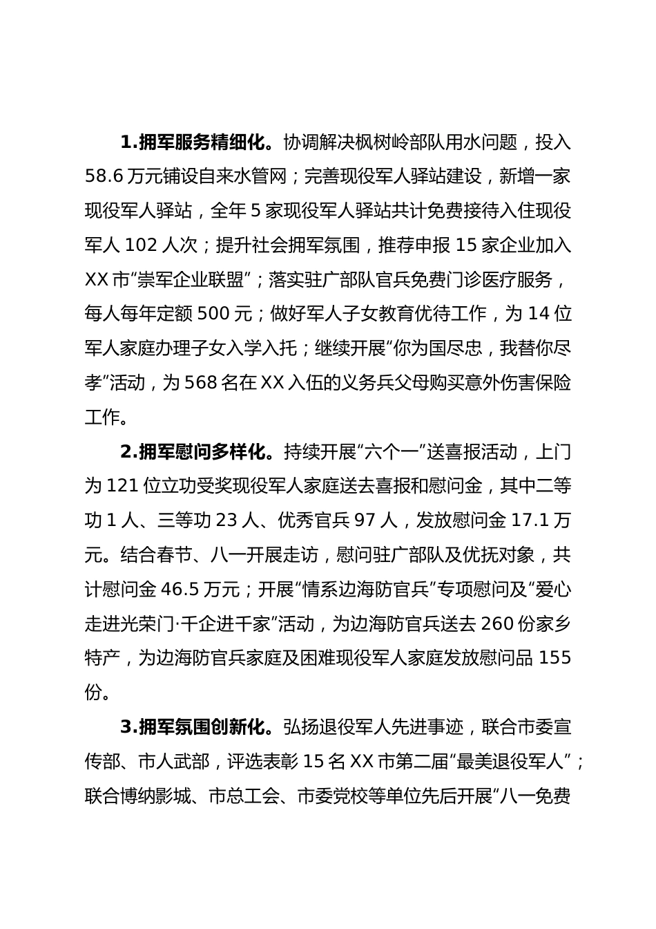 退役军人事务局2022年工作总结和2023年工作计划2022年在市委市政府的坚强领导下,在上级主管部门的指导下,我局围绕“让军人成为全社会尊崇的职业”的工作目标,全力以赴做好退役军人服务保障,各项工作均取得较大成效,现将相关工作开展情况报告如下:一、2022年工作总结:(一)退役军人思想政治引领工作1.强化领导,凝聚合力。召开市委退役军人事务领导小组会议,专题部署谋划,扎实做好拥军优属、拥政爱民工作。认真落实向退役军人事务部门派驻军队人员的要求,一名军队人员兼任局党组成员、副局长,一名军队文职人员兼任退役军人事务工作领导小组办公室秘书科副科长。2.统筹兼顾,有机融合。结合疫情防控常态化要求,加强与人武部、学校等单位沟通协调,将《退役军人保障法》“六进”活动与普法工作、文明创建工作有机结合,扎实开展“法律政策落实年”、“回头看”工作,严格依法依规办事。3.信息政务,高效服务。按时按质完成政务公开,建成视频会议系统,完善退役军人事务政务内网,高效使用退役军人综合服务平台,为退役军人提供便捷、高效贴心的个性化、精准化服务,打通服务退役军人“最后一公里”。(二)拥军褒扬工作1.拥军服务精细化。协调解决枫树岭部队用水问题,投入58.6万元铺设自来水管网;完善现役军人驿站建设,新增一家现役军人驿站,全年5家现役军人驿站共计免费接待入住现役军人102人次;提升社会拥军氛围,推荐申报15家企业加入XX市“崇军企业联盟”;落实驻广部队官兵免费门诊医疗服务,每人每年定额500元;做好军人子女教育优待工作,为14位军人家庭办理子女入学入托;继续开展“你为国尽忠,我替你尽孝”活动,为568名在XX入伍的义务兵父母购买意外伤害保险工作。2.拥军慰问多样化。持续开展“六个一”送喜报活动,上门为121位立功受奖现役军人家庭送去喜报和慰问金,其中二等功1人、三等功23人、优秀官兵97人,发放慰问金17.1万元。结合春节、八一开展走访,慰问驻广部队及优抚对象,共计慰问金46.5万元;开展“情系边海防官兵”专项慰问及“爱心走进光荣门·千企进千家”活动,为边海防官兵送去260份家乡特产,为边海防官兵家庭及困难现役军人家庭发放慰问品155份。3.拥军氛围创新化。弘扬退役军人先进事迹,联合市委宣传部、市人武部,评选表彰15名XX市第二届“最美退役军人”;联合博纳影城、市总工会、市委党校等单位先后开展“八一免费观影”、“文化进军营”、“喜迎XX大、理论进军营”活动,向部队赠送书籍149册300余本,丰富了官兵文化生活。成功实现创建“四连冠”目标,2022年7月获评全省双拥模范城称号,一名同志获全省爱国拥军模范荣誉称号。4.褒扬纪念规范化。认真组织开展清明节、9·30烈士纪念日活动,弘扬先烈精神,传承红色文化,培养爱国情怀;完成全市85处县级以下烈士纪念设施褒扬纪念信息系统录入工作,67座零散烈士墓均按“六有”标准完成修缮,18处零散烈士墓迁入市烈士陵园实施集中管护。(三)优待抚恤工作1.优抚政策落实到位。认真贯彻落实各项优抚政策,及时上报审核新增享受优抚补助对象,适时调整国家优抚补助对象补助标准,各类补助按标准通过“一卡通”发放到位。截至2022年10月共发放抚恤补助资金X人次X万元(预计全年发放X人次X万元)。全年共发放优待金X人次X万元(其中义务兵(预备消防士)X人X万元,重点优抚对象X人X万元)。2.“暖心解难”机制落实到位。一是走访联系长效化。坚持“村级周探望、乡镇月走访、县级季联络”关爱帮扶机制,坚持定期走访,掌握解决实际困难。市局领导班子成员每人联系2名优抚对象,内设科室联系12个乡镇街道18名优抚对象,全局工作人员分片包干联系指导12个乡镇街道,乡镇确定28名联系人联系127名优抚对象,村级全员联系辖区所有优抚对象。二是帮扶援助规范化。联合市财政局下发《XX市困难退役军人帮扶援助工作及革命老区农村综合保障体系专项资金管理使用实施细则》,对于存在实际生活困难的,采取临时救助、动员社会力量帮扶等方式进行帮扶,截止目前已发放帮扶援助补助资金78.5元,帮助288人次解决生活、医疗、住房等困难(全年安排帮扶援助资金167.6万元)。三是暖心服务精准化...