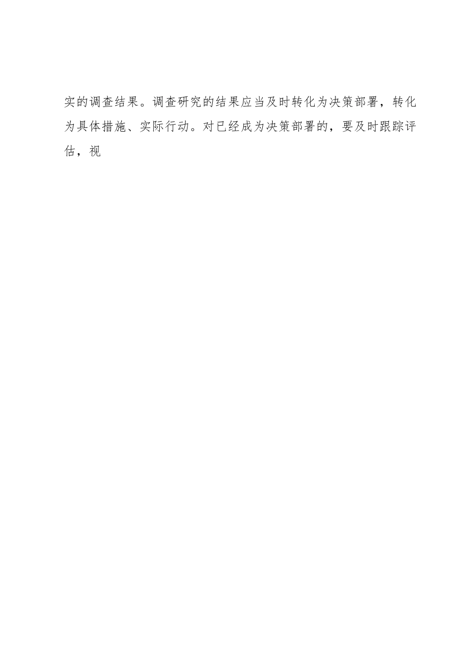 关于调查研究重要论述的心得体会调查研究是做好各项工作的基本前提和根本保障,也是党员干部需着力提高的“七种能力”之一。作为党员干部,要充分发挥自身优势,主动深入基层,深入群众,保持谦虚谨慎、勤奋刻苦、求真务实的工作作风,在调查研究的过程中不断拉近与群众的距离,在实际工作中苦练基本功,不断提高自身综合能力水平做到情况掌握在一线,感情融合在一线,问题解决在一线。一、调查研究是做好一切工作的基础总书记指出,“调查研究是谋事之基、成事之道”。充分说明,调查研究是做好工作的前提,调查研究能力是必备的基本功是领导干部素质和水平的体现。要提高调查研究能力,就要弄清楚为什么要调查研究。千言万语,说到底就是一句话,是为了做到从实际出发。因为只有从实际出发,我们制定的方案、发展思路、远景规划才有成功的可能。领导干部一定要亲自调查研究,坚持到群众中去,到实践中去,了解和掌握第一手情况,倾听基层干部群众所想所急所盼,只有这样才有发言权。调查研究要客观、全面、深入、公正,多看实地,多听各方面的意见。对于调查得来的大量材料和情况要认真研究分析,以“去粗取精、去伪存真、由此及彼、由表及里”的“改造制作功夫”,形成客观真实的调查结果。调查研究的结果应当及时转化为决策部署,转化为具体措施、实际行动。对已经成为决策部署的,要及时跟踪评估,视情况调整,直到使之符合客观实际、符合发展规律、合乎人心民意。二、调查研究是关系党和人民事业得失成败的大问题调查研究是谋事之基、成事之道。总书记在不同场合反复强调,用好调查研究这一我们党的“传家宝”,练好调查研究这项“基本功”。面对新矛盾、新问题,领导干部要了解真实情况,掌握工作主动权,作出科学决策,深入实地的调查研究必不可少今年是全面贯彻落实党的XX大精神开局之年。越是开局之年,我们越要大兴调查研究之风,为全面贯彻全国两会关于经济社会发展各项部署,做好基本功,打好提前量。只有真正沉下去,奔波在基层,重视并且善于调查研究,才能了解真情况、发现真问题找到真药方,站到新的进发点上。调查研究的过程就是科学决策的过程,既省略不得、又马虎不得。做好调查研究工作,要有眼睛向下的兴趣和决心。只有深入基层掌握第一手材料、听取职工群众心声,努力把真实情况掌握得更多一些、把工作中存在的差距和不足找得更准一些,细致入微地做好调查研究,才能为解决问题、提高工作质效奠定坚实基础。大兴调查研究之风,要求我们到现场、到生产第一线。领导干部要多深入现场,多为现场会观摩会、推进会营造轻松愉悦的氛围,积极引导职工群众展开讨论,让职工群众知无不言,言无不尽。要让做得好的地方、单位个人现身说法,让职工群众现场看、现场悟、现场学,做到“拨亮一盏灯,照亮一大片”,不断推动各项工作取得新进展。三、调查研究要重视方式方法调查研究首先要站稳人民立场,想问题、作决策、办事情都要想一想是不是站在人民立场上、是不是有助于解决群众急难愁盼问题、是不是有利于增进人民福祉,增强人民群众的获得感、幸福感、安全感,同时,调查研究成果的质量如何、形成的意见正确与否,最终都要由人民群众实践来检验。实现中华民族伟大复兴的中国梦是新时代赋予中国共产党人的历史使命,是一项前所未有的开创性事业。前进道路上,不可避免会出现许多难以预料的风险、挑战,只有始终坚持并不断加强调查研究,才能真正做到一切从实际出发、理论联系实际、实事求是,真正保持党同人民群众的血肉联系,才能从根本上保证党的路线方针政策和各项决策的正确制定与贯彻执行,才能在工作中尽可能防止和减少失误,及时迅速纠正错误。调查研究,是对客观实际情况的调查了解和分析研究,目的是把事情的真相和全貌调查清楚,把问题的本质和规律把握准确,把解决问题的思路和对策研究透彻,我们要有明确的目的,带着问题下去,尽力掌握调研活动的主动权要扑下身子、沉到一线,迈开步子、走出院子,到车间码头,到田间地头,到市场社区,亲自察看、亲身体验。要多层次、多方位、多渠道地调查了解情况,既要调查机关,又要调查基层;既要调查干部,又要调...