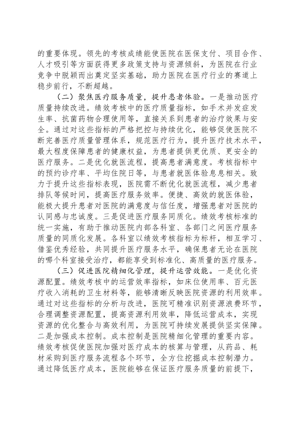 党委书记在2025年县人民医院迎接公立医院绩效考核工作推进会上的讲话同志们:公立医院绩效考核,绝非一项简单的任务考核,它是关乎医院长远发展、关乎患者就医体验、关乎医疗行业整体进步的关键举措。通过绩效考核,我们能够精准把握医院在医疗服务、学科建设、运营管理等多方面的优势与不足,从而有的放矢地进行改进与提升。在当前医疗行业竞争日益激烈、群众对医疗服务期望不断提高的大背景下,扎实推进绩效考核工作,对我院实现高质量发展具有极为重要的现实意义。下面,我就如何更好地推进我院的绩效考核工作讲几点意见。一、深化认知,明晰绩效考核重要意义(一)关乎医院发展全局,指引战略方向。一是绩效考核结果直观反映医院综合实力。涵盖医疗质量、运营效率、持续发展、满意度评价等多个维度的考核指标,宛如一面镜子,清晰映照出医院在各个领域的工作成效。优异的考核成绩,不仅是对医院过往工作的高度认可,更是向社会各界展示医院强大实力的有力名片,有助于提升医院的知名度与美誉度,吸引更多患者前来就医,为医院发展赢得更广阔的空间。二是为医院战略规划提供关键依据。通过对绩效考核数据的深入分析,我们能够洞察医院在不同学科、不同业务板块的发展态势,明确优势与短板所在。基于此,医院可科学合理地制定未来发展战略,精准配置资源,加大对薄弱环节的扶持力度,巩固和强化优势领域,推动医院整体发展战略与绩效考核导向深度契合,实现可持续发展。三是助力医院在行业竞争中抢占先机。在医疗市场竞争愈发激烈的当下,绩效考核成绩已成为医院竞争力的重要体现。领先的考核成绩能使医院在医保支付、项目合作、人才吸引等方面获得更多政策支持与资源倾斜,为医院在行业竞争中脱颖而出奠定坚实基础,助力医院在医疗行业的赛道上稳步前行,不断超越。(二)聚焦医疗服务质量,提升患者体验。一是推动医疗质量持续改进。绩效考核中的医疗质量指标,如手术并发症发生率、抗菌药物合理使用等,直接关系到患者的治疗效果与安全。通过对这些指标的严格把控与持续优化,能够促使医院不断完善医疗质量管理体系,规范医疗行为,提升医疗技术水平,最大程度保障患者的健康权益,为患者提供更优质、更安全的医疗服务。二是优化就医流程,提高患者满意度。考核指标中的预约诊疗率、平均住院日等,与患者就医体验息息相关。致力于提升这些指标表现,医院需不断优化就医流程,减少患者排队等候时间,提高医疗服务效率。便捷、高效的就医体验,能极大提升患者对医院的满意度与信任度,增强患者对医院的认同感与忠诚度。三是促进医疗服务同质化。绩效考核标准的统一实施,有助于推动医院内部各科室、各部门之间医疗服务质量的同质化发展。各科室以绩效考核指标为标杆,相互学习、借鉴优秀经验,共同提升医疗服务水平,确保患者无论在医院的哪个科室接受治疗,都能享受到标准化、高质量的医疗服务。(三)促进医院精细化管理,提升运营效能。一是优化资源配置。绩效考核中的运营效率指标,如床位使用率、百元医疗收入消耗的卫生材料等,能够清晰反映医院资源的利用效率。通过对这些指标的分析与改进,医院可精准识别资源浪费环节,合理调整资源配置,提高资源利用效率,降低运营成本,实现资源的优化整合与高效利用,为医院可持续发展提供坚实保障。二是加强成本控制。成本控制是医院精细化管理的重要内容。绩效考核促使医院加强对医疗成本的核算与管理,从药品、耗材采购到医疗服务流程各个环节,全方位挖掘成本控制潜力。通过降低医疗成本,医院能够在保证医疗服务质量的前提下,提升经济效益,增强医院的核心竞争力,实现经济效益与社会效益的双赢。三是提升管理效能。绩效考核指标体系为医院管理提供了明确的工作目标与衡量标准。各部门、各科室围绕考核指标开展工作,能够有效增强工作的计划性与针对性,减少管理的盲目性与随意性。同时,通过绩效考核结果的反馈与应用,能够及时发现管理中存在的问题并加以改进,不断提升医院的管理效能,推动医院管理水平向更高层次迈进。二、剖析现状,精准定位工作薄弱环节(一)医疗质量层面,部分指标有待提升。一是医疗安全指标仍有优...