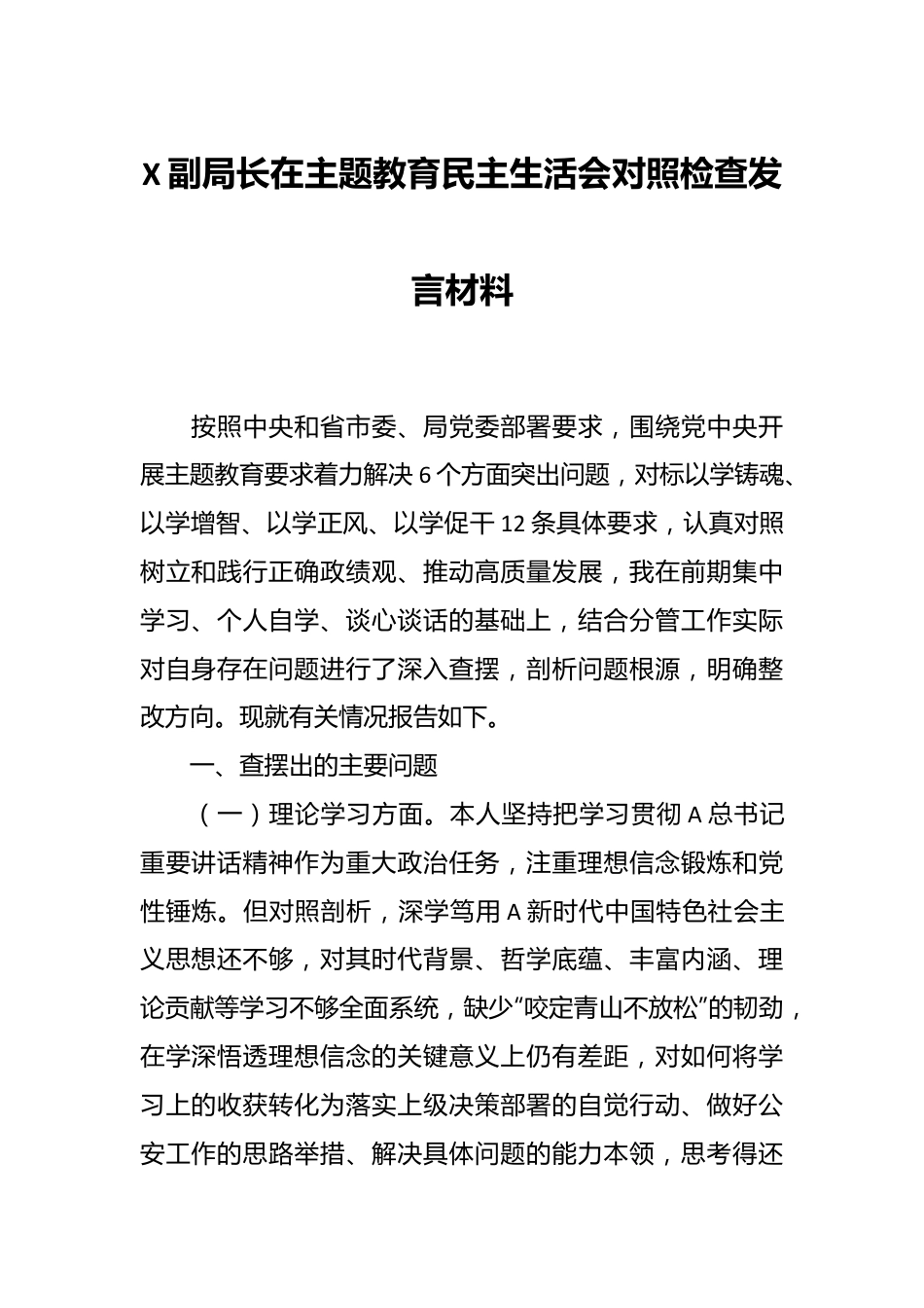 X副局长在主题教育民主生活会对照检查发言材料按照中央和省市委、局党委部署要求,围绕党中央开展主题教育要求着力解决6个方面突出问题,对标以学铸魂、以学增智、以学正风、以学促干12条具体要求,认真对照树立和践行正确政绩观、推动高质量发展,我在前期集中学习、个人自学、谈心谈话的基础上,结合分管工作实际对自身存在问题进行了深入查摆,剖析问题根源,明确整改方向。现就有关情况报告如下。一、查摆出的主要问题(一)理论学习方面。本人坚持把学习贯彻A总书记重要讲话精神作为重大政治任务,注重理想信念锻炼和党性锤炼。但对照剖析,深学笃用A新时代中国特色社会主义思想还不够,对其时代背景、哲学底蕴、丰富内涵、理论贡献等学习不够全面系统,缺少“咬定青山不放松”的韧劲,在学深悟透理想信念的关键意义上仍有差距,对如何将学习上的收获转化为落实上级决策部署的自觉行动、做好公安工作的思路举措、解决具体问题的能力本领,思考得还不够深、研究得还不够透,指导实践的效果还不够明显。(二)政治素质方面。本人毫不动摇坚持和加强党对公安工作的绝对领导,自觉严肃党内政治生活。但对害群之马的鉴别力、洞察力、发现力还有待进一步加强,主动开展工作的斗争精神、斗争策略还不够。经常性深入基层调查研究、对基层工作进行指导督促还不够,对一些问题发现不够及时,对一些顽瘴痼疾掌握不够全面,没有及时采取有力措施加以整改。对待工作、对待身边的人,偏好于就事论事,不能很好地从政治角度观察现象、思考问题,从政治上观大势、看全局、见微知著的能力还需再提升。(三)能力本领方面。能够立足岗位,尽职履职,敢于担当,敢于作为,主动应对风险挑战,着力破解突出矛盾,扎实做好“六稳”工作,全面落实“六保”任务。但在创新推进公安工作方面,还存在办法不够多、眼界不够宽的问题。比如,在推进公安工作高质量发展,融入国家治理体系和治理能力现代化方面还存在亮点不够多、支撑力不够强的问题;在“枫桥式派出所”建设、派出所“一室两队”改革等基层基础建设方面,还存在步子不够大、进度不够快的问题。这与自己专业知识面有限、创新谋划不够、推动不够果断也有一定关系。有时虽对某些工作有所思考,但思想上顾虑多,推动上不够大胆,最终没有付诸实践,还需要进一步总结经验、开阔思路、敢于先行先试。(四)担当作为方面。平时深入基层调研和联系群众倾听意见还不够到位,掌握第一手资料,发现深层次问题较少,没能很好的为基层及时减负。在树立正确政绩观方面,有时也存在偏重实用主义倾向,更多精力放在了急难险重任务上,而沉下心来研究谋划分管工作发展规律、发展战略方面做得还不够。对自身各方面要求较严,但对下级往往是鼓励激励多、严格批评少,泛泛提醒多、红脸出汗少,有时在一些不涉及自己分管领域的“小”事情上,标准不够高、要求不够严,个别问题没有得到彻底整改。(五)工作作风方面。作为从基层成长起来的干部,对队伍的整体情况、思想状况、能力特点掌握比较全面,也很有感情。但随着岗位调整、工作环境的变化,到基层调研走访、与民警谈心谈话的覆盖面和深度仍有不足,对队伍中的新情况、新问题及苗头隐患排查不够细致彻底,对民警8小时外的监督还存在盲区,对有些问题产生的深层次原因分析仍有不足。同时,在应对繁重复杂的工作时,自己一定程度上还存在重安排、轻督导的现象,平时交办事情多了,跟踪督办抓落实少了,有时把安排了当做落实了,缺乏持续跟踪问效、一抓到底的“钉钉子”精神。(六)廉洁自律方面。我始终做到政治上清醒、生活上清正、工作上清廉,重操守、慎交友、淡名利、高追求没有利用职权谋取不正当利益,能够合理区分生活与工作家事和公事,能够依法依规依程序办理各种事项,牢固树立干净干事、勤政廉洁的良好形象。但在全面从严管党治警上下的功夫还不够深入,有时认为队伍管理有政工和纪检部门在抓,容易满足于个人不违规、不触线、不出事,纪律要求点对点谈话较少,分管单位队伍中仍有党员民警因违规用权和涉及经济问题受到处理。(七)对照典型案例检视方面。去年查处XX系列案,呈现出链条式、塌方式、...