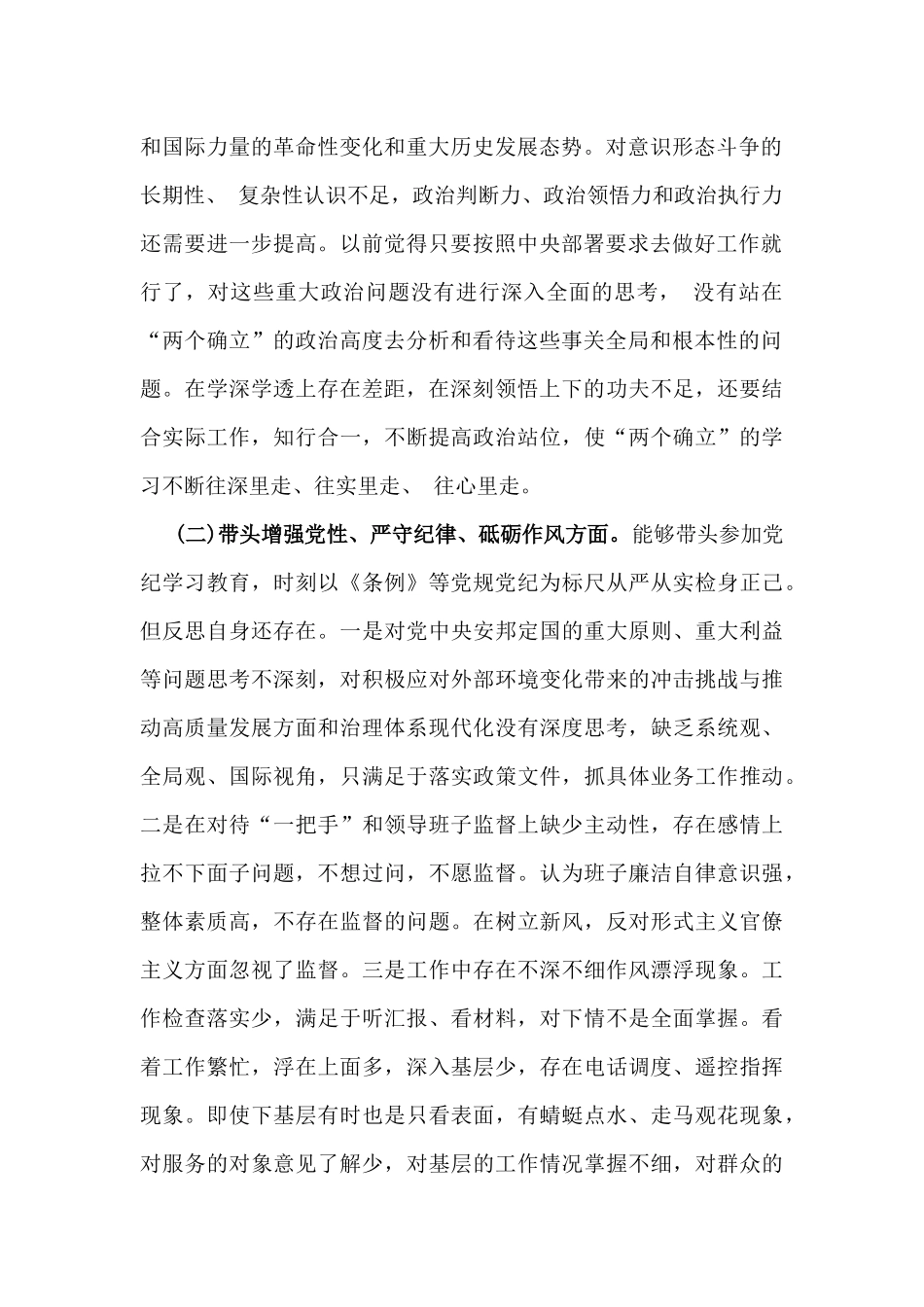 2025年围绕带头增强党性、严守纪律、砥砺作风等“四个带头方面”个人对照检查材料、存在的问题、整改措施努力方向【五篇】供参考2025年局长围绕带头增强党性、严守纪律、砥砺作风等“四个带头方面”个人对照检查材料按照《关于开好2024年度党员领导干部民主生活会的通知》要求,会前,我深入学习领会习近平总书记重要讲话重要指示精神,认真学习党章、《中国共产党纪律处分条例》等党内法规,深刻领会进一步全面深化改革的重大意义,与班子成员和广大干部进行了谈心谈话,征求了各层次、各方面的意见和建议,联系本人思想和工作实际,重点围绕4个方面认真查摆问题,进行党性分析,深刻检视反思,从思想根源剖析问题产生的原因,明确整改措施和努力方向。现作对照查摆如下:一、存在的突出问题(一)带头严守政治纪律和政治规矩,维护党的团结统一方面。能够深领会“两个确立”的决定性意义,坚决做到“两个维护”,带头严守政治纪律和政治规矩,自觉在思想上政治上行动上同以习近平同志为核心的党中央保持高度一致。但反思自身还存在没在站在“百年未有之大变局”“国之大者”的高度去深刻理解当前国际格局和国际体系的深刻调整,没有深刻理解全球治理体系的深刻变革和国际力量的革命性变化和重大历史发展态势。对意识形态斗争的长期性、复杂性认识不足,政治判断力、政治领悟力和政治执行力还需要进一步提高。以前觉得只要按照中央部署要求去做好工作就行了,对这些重大政治问题没有进行深入全面的思考,没有站在“两个确立”的政治高度去分析和看待这些事关全局和根本性的问题。在学深学透上存在差距,在深刻领悟上下的功夫不足,还要结合实际工作,知行合一,不断提高政治站位,使“两个确立”的学习不断往深里走、往实里走、往心里走。(二)带头增强党性、严守纪律、砥砺作风方面。能够带头参加党纪学习教育,时刻以《条例》等党规党纪为标尺从严从实检身正己。但反思自身还存在。一是对党中央安邦定国的重大原则、重大利益等问题思考不深刻,对积极应对外部环境变化带来的冲击挑战与推动高质量发展方面和治理体系现代化没有深度思考,缺乏系统观、全局观、国际视角,只满足于落实政策文件,抓具体业务工作推动。二是在对待“一把手”和领导班子监督上缺少主动性,存在感情上拉不下面子问题,不想过问,不愿监督。认为班子廉洁自律意识强,整体素质高,不存在监督的问题。在树立新风,反对形式主义官僚主义方面忽视了监督。三是工作中存在不深不细作风漂浮现象。工作检查落实少,满足于听汇报、看材料,对下情不是全面掌握。看着工作繁忙,浮在上面多,深入基层少,存在电话调度、遥控指挥现象。即使下基层有时也是只看表面,有蜻蜓点水、走马观花现象,对服务的对象意见了解少,对基层的工作情况掌握不细,对群众的要求了解不深入。有时不善于带着问题去调查研究,不善于在调研中发现办实事、解难题的方法。一些下基层的活动没有聚焦问题和短板做深度的研究和推动,没有解决深层次矛盾,没有建立工作长效机制。(三)带头在遵规守纪、清正廉洁前提下勇于担责、敢于创新方面。能够树立和践行正确政绩观,于直面矛盾问题。但反思自身还存在形式主义官僚主义现象。存在布置多,检查少,落实效率偏低的问题。对于一些工作的指导协调力度不够,具体抓落实不够到位,化解基层难题不够经常,有时还存在“官僚主义”作风,习惯于坐在办公室或召开会议协调解决问题,真正到基层直面解决实际问题不够经常、不够深入,开拓创新精神不强,满足现状,发展创新动力不足,意识不强。有些时候存在“以会议落实会议、以文件落实文件”现象。(四)带头履行全面从严治党政治责任方面。能够坚持用改革精神和严的标准管党治党,深化运用监督执纪“四种形态”。但反思自身还存在对意识形态工作的规律性认识有待深化和加强。一是对习近平总书记关于“意识形态工作是党的一项极端重要的工作”“牢牢掌握意识形态工作领导权”等一系列重要论述学习认识还需加深、执行力度还需加大。二是意识形态工作责任和办法抓的力度还不到位,“一手硬、一手软”的现象还存在。三是对意识形态工作的有效监督和指导措施办法少...