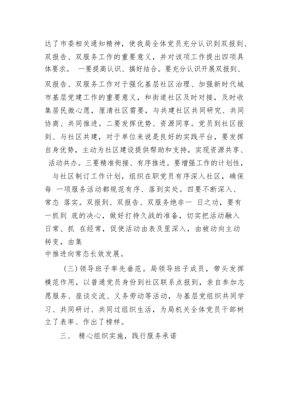 某区关于开展“双报到双服务”工作情况的调研报告按照市委组织部要求,我区采取召开座谈会、走访调查等形式,对近年来全区在职党员“双报到双服务”工作情况进行了梳理总结,现将有关情况报告如下。一、基本情况xx区总面积1889平方公里,总人口近86万人,共有党组织1099个,党员27002名,其中区直机关在职党员6440名。近年来,xx区高度重视党员管理工作,积极引导机关事业单位在职党员到居住地社区党组织报到,参与社区建设、管理和服务,实现八小时内服务单位、八小时外奉献社区,逐步建立起“工作在单位、活动在社区、奉献双岗位”的机制。同时,坚持把该项活动作为改进党员干部工作作风、密切党群干群关系、加强联系服务群众的重要举措,紧密结合实际,加强调查摸底,科学设置岗位,精心组织活动,赢得了社区居民群众的普遍好评。截至目前,全区已有5200余名机关党员主动到社区报到,每年开展各类服务活动近万场次。二、主要做法(一)加强组织领导。一是集中统一报到。下发《关于在全区开展“在职党员进社区联系服务群众”活动的通知》,印制统一《在职党员进社区联系服务群众活动报到卡》,要求各机关单位党组织按照“不扰民、不烦民、不乱民”的“三不"原则,组织本单位本系统党员到居住地社区党组织报到。二是做好对接服务。要求各城区街道党工委和社区党组织积极做好在职党员报到的接收工作,在社区党群服务中心设立"在职党员报到处",安排专人填写《活动报到卡回执单》,并及时把到社区报到的党员编入其住址所在网格党支部。三是建立工作台账。要求在职党员到社区报到时填写《"在职党员进社区联系服务群众”活动登记表》,并交由社区党组织留存。同时,区委组织部下发《xx区"在职党员进社区联系服务群众”活动情况汇总表》,各社区按照季度汇总报到情况,由所在街道汇总后报区委组织。二、加强组织领导,提高思想认识(一)研究制定方案。为确保双报到、双报告、双服务工作常态化制度化开展,局党组把开展该项工作纳入民政系统党建工作总体布局,结合实际,研究制定了《关于建立双报到、双报告制度深化局属党支部与社区党组织共驻共建的实施方案》。(二)积极组织动员。1月上旬组织召开了动员会,传达了市委相关通知精神,使我局全体党员充分认识到双报到、双报告、双服务工作的重要意义,并对该项工作提出四项具体要求。一要提高认识、搞好结合。要充分认识开展双报到、双报告、双服务工作对于强化基层社区治理、加强新时代城市基层党建工作的重要意义,和街道社区及时对接,及时收集居民微心愿,厘清社区需要,与共建社区共同研究、共同协商、共同推进。二要发挥优势、资源同享。党员到社区报到、与社区共建,对于单位来说是良好的实践平台,要发挥自身优势,主动为社区建设提供帮助和支持,实现资源共享、活动共办。三要精准衔接、有序推进。要增强工作的计划性,与社区制订工作计划,组织在职党员有序深入社区,确保每一项服务活动都规范有序、落到实处。四要不断深入、常态落实。双报到、双报告、双服务绝非一日之功,要有一抓到底的决心,做好打持久战的准备,切实把活动融入日常、抓在经常,促使活动由表及里深入,由被动向主动转变,由集中推进向常态长效发展。(三)领导班子率先垂范。局领导班子成员,带头发挥模范作用,以普通党员身份到社区联系点报到,亲自参加志愿服务、座谈交流、义务劳动等活动,与基层党组织共同学习、共同研讨、共同过组织生活,为局机关全体党员干部树立了表率、作出了榜样。三、精心组织实施,践行服务承诺(一)主动参与报到。一是落实报到制度。按照《市直单位党组织落实双报到、双报告、双服务制度工作方案》要求,年初,局属X个党支部党员干部分别在党支部书记的带领下,持《驻区单位党组织报到联系单》积极到社区报到,与X个社区签订了《共驻共建协议书》,进一步密切了社区党组织与驻区党支部的联系,建立了互联互通互动机制。二是全面查漏补缺。20XX年X月对局属X个党支部及在职党员报到情况进行一次全面排查摸底,认真查漏补缺,建立完善的工作台账,确保信息不错、人员不漏,确保报到工作全覆盖、无死角。截至目前,市直民政系统X名在职党员...