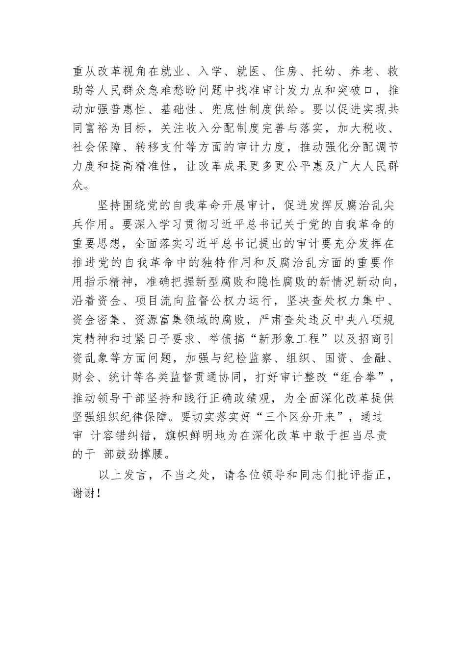 交流发言:坚持以审计监督纵深推进改革、以改革精神提升审计质效尊敬的各位领导,同志们:党的二十届三中全会明确了进一步全面深化改革的总目标,并对进一步全面深化改革作出系统部署。审计作为党和国家监督体系的重要组成部分,是推动国家治理体系和治理能力现代化的重要力量,以高质量经济监督促进全面深化改革是审计的重大政治任务。必须始终坚持以习近平新时代中国特色社会主义思想为指导,把准审计在中国式现代化进程中的定位、优势和作用,深入贯彻落实全会精神,把改革摆在更加突出的位置,立足推进国家治理体系和治理能力现代化总目标,坚持系统观念和正确方法论,抓住改革重点领域,坚持“先立后破”,以审计监督纵深推进改革、以改革精神提升审计质效。坚持围绕党和国家中心工作开展审计,促进解决制约构建新发展格局和推动高质量发展的卡点堵点问题。要坚持创新在我国现代化建设全局中的核心地位,聚焦科教兴国、人才强国、创新驱动发展战略和教育科技人才体制机制一体改革等重大措施落实,揭示影响高水平科技自立自强、打好关键核心技术攻坚战等方面的问题,推动打通束缚新质生产力发展的堵点卡点。要紧扣经济建设中心工作和高质量发展首要任务,着眼推动加快全国统一大市场建设和扩大国际合作,密切关注财税、金融、国企国资、外贸外资等关键领域重大管理体制改革的落实和进展情况,深入揭示招商引资、优化营商环境、金融支持实体经济、助企纾困、对外投资等关键环节存在的问题,更好发挥审计监督保障、规范促进和决策参谋作用,推动重大改革任务稳步推进。要坚持协调发展理念,聚焦农业农村优先发展、巩固拓展脱贫攻坚成果、推进乡村全面振兴、健全生态环境治理体系和低碳绿色发展机制等方面,反映统筹推进“五位一体”总体布局和协调推进“四个全面”战略布局中不坚决、不作为、不善为、乱作为等问题,推动加快构建新发展格局。坚持围绕总体国家安全观开展审计,促进以高水平安全保障高质量发展。要贯彻高质量发展和高水平安全良性互动的要求,聚焦中国式现代化面临的新情况新问题,突出改革目标和问题导向,始终坚持发扬斗争精神,敢于啃硬骨头,敢于突进深水区,敢于面对新矛盾新挑战,密切关注房地产、地方政府债务、中小金融机构、粮食、生态环保等重点领域,深入揭示重大经济贪腐、重大财务舞弊、重大财政造假、重大生态毁损等突出风险,及时反映影响经济安全的苗头性、倾向性问题,推动破除各方面体制机制弊端,促进改革为中国式现代化注入强劲动力。坚持围绕以人民为中心的发展思想开展审计,促进改革成果由人民共享。要以促进社会公平正义、增进人民福祉为出发点和落脚点,紧盯人民群众最关心最直接最现实的利益问题,努力把审计监督跟进到民生保障的“最后一公里”,注重从改革视角在就业、入学、就医、住房、托幼、养老、救助等人民群众急难愁盼问题中找准审计发力点和突破口,推动加强普惠性、基础性、兜底性制度供给。要以促进实现共同富裕为目标,关注收入分配制度完善与落实,加大税收、社会保障、转移支付等方面的审计力度,推动强化分配调节力度和提高精准性,让改革成果更多更公平惠及广大人民群众。坚持围绕党的自我革命开展审计,促进发挥反腐治乱尖兵作用。要深入学习贯彻习近平总书记关于党的自我革命的重要思想,全面落实习近平总书记提出的审计要充分发挥在推进党的自我革命中的独特作用和反腐治乱方面的重要作用指示精神,准确把握新型腐败和隐性腐败的新情况新动向,沿着资金、项目流向监督公权力运行,坚决查处权力集中、资金密集、资源富集领域的腐败,严肃查处违反中央八项规定精神和过紧日子要求、举债搞“新形象工程”以及招商引资乱象等方面问题,加强与纪检监察、组织、国资、金融、财会、统计等各类监督贯通协同,打好审计整改“组合拳”,推动领导干部坚持和践行正确政绩观,为全面深化改革提供坚强组织纪律保障。要切实落实好“三个区分开来”,通过审计容错纠错,旗帜鲜明地为在深化改革中敢于担当尽责的干部鼓劲撑腰。以上发言,不当之处,请各位领导和同志们批评指正,谢谢!