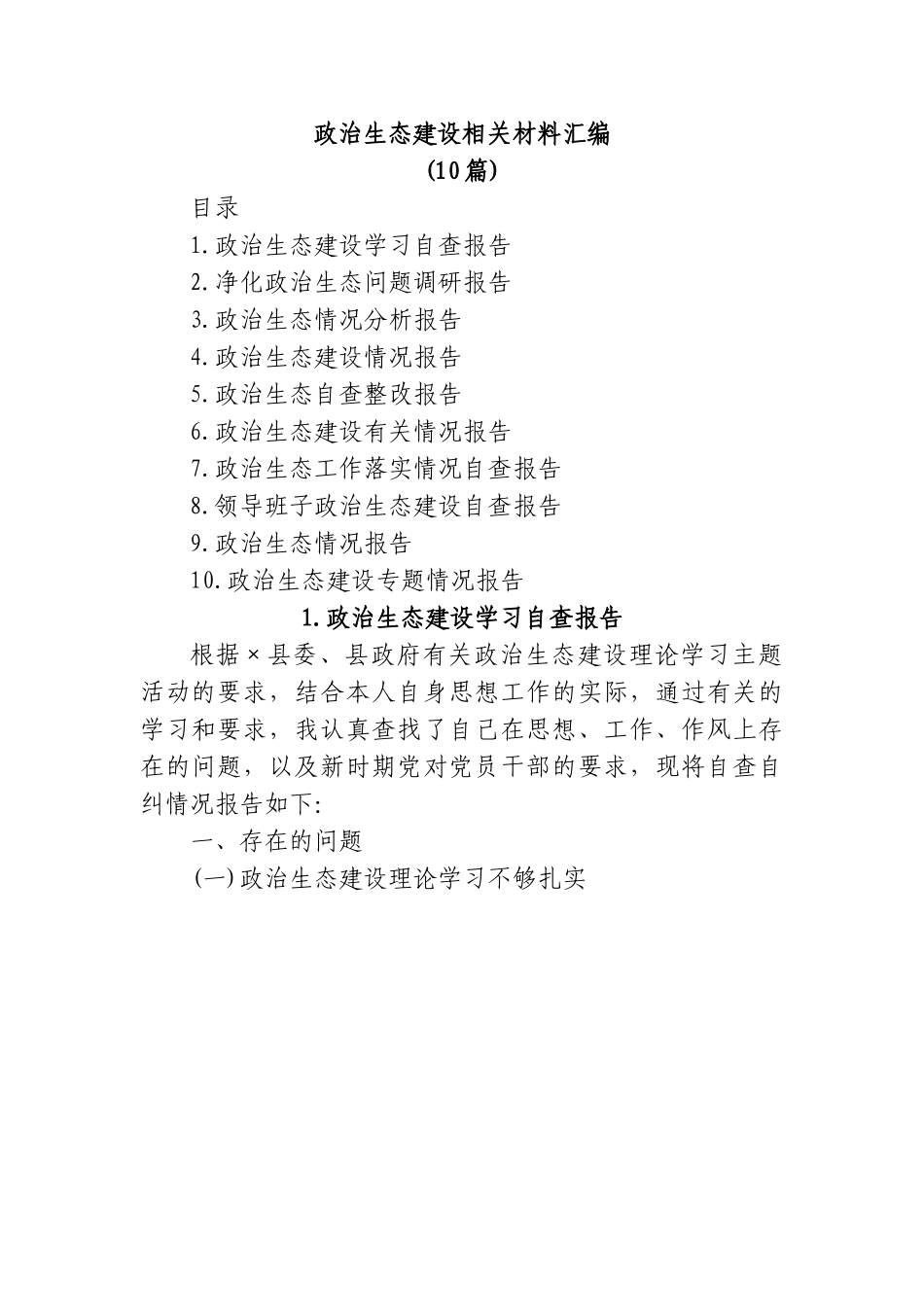 政治生态建设相关材料汇编(10篇)目录1.政治生态建设学习自查报告2.净化政治生态问题调研报告3.政治生态情况分析报告4.政治生态建设情况报告5.政治生态自查整改报告6.政治生态建设有关情况报告7.政治生态工作落实情况自查报告8.领导班子政治生态建设自查报告9.政治生态情况报告10.政治生态建设专题情况报告1.政治生态建设学习自查报告根据×县委、县政府有关政治生态建设理论学习主题活动的要求,结合本人自身思想工作的实际,通过有关的学习和要求,我认真查找了自己在思想、工作、作风上存在的问题,以及新时期党对党员干部的要求,现将自查自纠情况报告如下:一、存在的问题(一)政治生态建设理论学习不够扎实一是理论学习不够。只满足于看文件、读报纸,没有静下心来仔细研读,很少阅读马克思主义、毛泽东思想、邓小平理论、政治生态建设理论的原文原著,看得多、思考的少,浏览得多、记住的少。二是相关知识学习不够,自认为现在来党史办工作了,相关的理论知识学好了就行了,其他诸如时事、政治、别的理论知识学不学无所谓,放松了这些方面知识的学习。三是业务知识学习不够,自己×年末进入党史办工作,学习注重热点关键知识,缺乏对党史研究理论知识的系统学习,对有关职能理论知识理解得不够深,钻得不透。(二)由于自己是病休,对工作的全局观念性不强对提高自身的职能理论知识水平要求不强,没有很好地发挥自身的有关作用。对有关党史资料的搜集、调查不多,联系、指导少,没有很好地发挥自身的有关作用,不利于党史资料搜集工作的全面开展和作用的发挥。(三)宗旨观念不够牢固一是因为自己有高血压、脑血栓的病,在家休息,对党史资料搜集工作帮不了忙,无法出力,所以,除了文艺创作,在有关网站上发表了《秀水状元毛自知》、《福利赌神柳南波》、《瑶乡太平军》等数百万字的长篇小说外没有对党史资料搜集做出贡献,这是工作不全面、革命意志衰退的表现。二是自己很少来办公室,有担心他人认为自己碍手碍脚的思想,认为自己从县文联到党史办,职位变了,职能变了,怕话儿讲不到点子上,讲了后会让领导为难,把党和人民的利益放在首位考虑得不够。二、产生问题的根源1、放松了政治生态建设的理论学习。由于对学习的重要性认识不足,自觉不自觉地放松了理论学习,自以自己是病休,有三十多年的工作经验,保养好身体,做好文艺创作,当好县法院的人民陪审员就已经足够,缺乏对政治生态建设的新理论、新知识的学习。常把学习当作软任务总认为自己不是理论工作者,没有必要去深钻细研,懂得一些基本观点、基本原理能适应工作就行。对于工作只求服从领导,服务大局,不求高标准、出精品的思想导致对理论学习的兴趣不浓,运用理论知识指导工作实践的能力不强。2、放松了对自身主观世界的改造。认为自己工作了三十多年,经验不少,以致于学习政治生态建设理论的劲头小了,深入群众、深入基层调查了解实际问题的时间少了精神状态和进取心也差了。深入剖析这种思想,还是考虑个人的利益多了一些,考虑人民群众的利益少了一些,宗旨观念有所淡化。近年来,自己随着职务的变动,宗旨观念在头脑中树得还不够牢,没有很好地针对实际问题倾听群众的意见,制定针对性措施,寻求解决问题的最佳方法。3、放松了自身的党性修养的锻炼。反思我在思想作风方面存在的问题,一个深层次的原因,就是近些年来党性锻炼所下的气力不够,政治生态建设学习的力度不够,世界观的改造抓得不够紧,为人民服务的宗旨观和艰苦奋斗的精神淡薄了。随着环境变了,主观主义多些,久而久之对群众的呼声、群众的疾苦、群众的困难了解不够,解决得也不够及时。主要的根源是政治生态建设这方面有歇气松劲的思想。三、整改措施1、坚持理论学习,加强对政治生态建设的理论学习,努力提高自身的理论、思想、政治素质。进一步提高对政治生态建设理论学习重要性的认识,增强学习的紧迫感和自觉性,真正把理论学习作为提高自身政治、理论、思想素质的第一要务,自觉做到:一从应付性学习转变为主动钻研学习,从主要着眼于改造客观世界转变为改造客观世界与主观世界相结合,从为了工作需要的“不得不学”转变为了提升自己理...