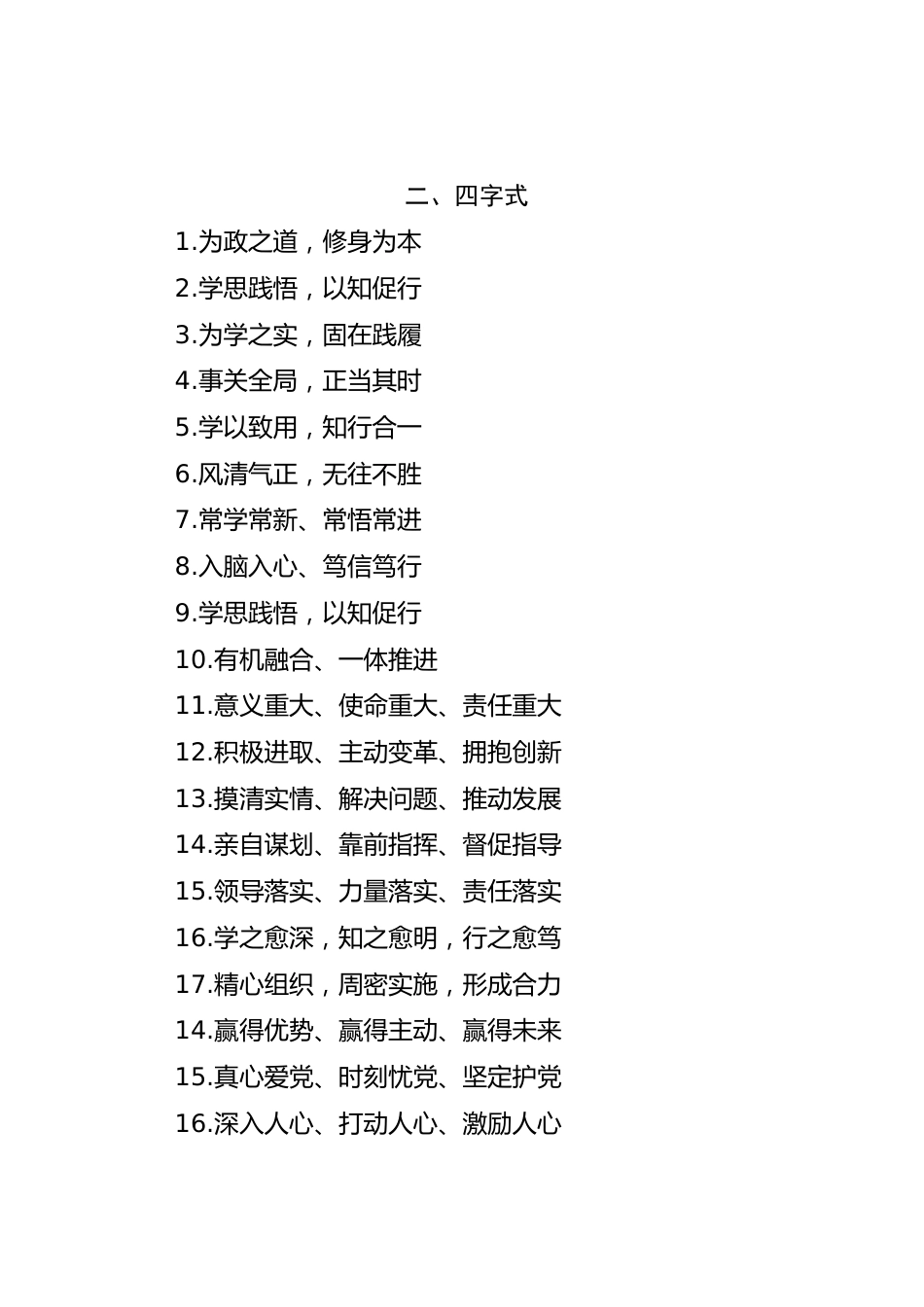 一、三字式1.抓重点、攻难点、通卡点、破堵点2.走基层、找问题、想办法、促发展3.谋划好、组织好、落实好4.感染力、穿透力、影响力5.引领者、营造者、维护者6.学思想、强党性、重实践7.读其言、明其意、知其理。8.两手抓、两促进9.整体性、协同性10.时间紧、任务重、要求高11.查不足、找差距、明方向12.边学习、边对照、边检视、边整改13.坚持原原本本学,读原著、学原文、悟原理,全面系统研读。二、四字式1.为政之道,修身为本2.学思践悟,以知促行3.为学之实,固在践履4.事关全局,正当其时5.学以致用,知行合一6.风清气正,无往不胜7.常学常新、常悟常进8.入脑入心、笃信笃行9.学思践悟,以知促行10.有机融合、一体推进11.意义重大、使命重大、责任重大12.积极进取、主动变革、拥抱创新13.摸清实情、解决问题、推动发展14.亲自谋划、靠前指挥、督促指导15.领导落实、力量落实、责任落实16.学之愈深,知之愈明,行之愈笃17.精心组织,周密实施,形成合力14.赢得优势、赢得主动、赢得未来15.真心爱党、时刻忧党、坚定护党16.深入人心、打动人心、激励人心17.亲自谋划、靠前指挥、督促指导18.真理力量、实践力量、人格力量19.梳理问题,列出清单、找准症结20.锤炼党性、净化党风、严明党纪21.学做结合、查改贯通、标本兼治22.无比感动、无比自豪、无比振奋23.发展所需、改革所急、基层所盼、民心所向24.真心爱党、时刻忧党、坚定护党、全力兴党25.心有所信,方能行远;学有所悟,而后笃行26.高屋建瓴、视野宏阔、思想深邃、内涵丰富27.以学铸魂、以学增智、以学正风、以学促干28.重大战略、重大规划、重大政策、重大改革、重大项目三、五字式1.下好先手棋,打好主动仗2.一语不能践,万卷徒空虚3.时间不等人、机遇不等人4.学思用贯通、知信行统一5.抓住窗口期,跑出加速度6.知为行之始,学为用之先7.人人是环境,个个是因子8.奋进新征程,建功新时代9.高标准开展、高质量推进10.原原本本读,带着感情悟,联系实际思11.展真理之旗、掌时代之舵、扬复兴之帆12.首责在党委,关键在领导,重点在落实13.风清则气正,气正则心齐,心齐则事成14.带着嘱托学、带着感情学、带着责任学15.奔着问题去、带着问题学、对着问题改16.解决新问题、总结新经验、探索新规律四、六字式1.江山就是人民,人民就是江山2.治国必先治党,治党务必从严3.任务已经明确,关键在于落实4.核心凝聚力量,旗帜指引方向5.奋斗创造历史,实干成就未来6.聚焦根本任务,对准具体目标7.目标昭示方向,目标凝聚力量8.开展理论学习,接受思想洗礼7.敢于直面问题,勇于修正错误10.坚持问题导向,改进调研方式11.拿出实招硬招,完善制度机制12.起步影响结果,方法决定成效13.蓝图催人奋进,嘱托激励人心14.打破思维定势、打破路径依赖15.扛稳主体责任,坚持以上率下,精心组织实施16.建立问题清单,找准问题症结,制定整改方案17.加强组织领导,对准既定目标,扎扎实实推进18.加强组织领导,务求工作实效,加强宣传引导19.坚持典型引路,回应社会关切,反映进展成效20.深入了解情况,提出工作建议,发现总结典型21.筑牢信仰之基、补足精神之钙、把稳思想之舵22.符合客观实际、顺应发展规律、合乎群众意愿23.促进发展平衡、提高开放水平、增加群众收入24.原原本本消化、层层递进深化、立足实际转化25.一切工作安排、一切推进措施、一切工作要求26.接受政治体检,打扫政治灰尘,纠正行为偏差27.不负伟大时代、不负巨大关怀、不负殷切重托28.扛起主体责任,精心组织实施,有力有序推进29.列出问题清单,找准问题症结,制定整改方案,敢于动真碰硬30.锻造政治品格,筑牢政治忠诚,强化政治历练,恪守政治纪律31.压紧压实责任,强化督促指导,坚持统筹兼顾,加强宣传引导32.抵御重大风险、克服重大阻力、化解重大矛盾、解决重大问题33.学思想是基础、强党性是核心、重实践是手段、建新功是目的34.提升境界格局,激励担当作为,注重改革创新,增强斗争本领35.提高理论素养、坚定理想信念、升华觉悟境界、增强能力本领36.坚持问题导向,善于发现问题、敢于正视问题、切实解决问题37.加强组织领导、抓好工作指导、强化宣传引导,精心...