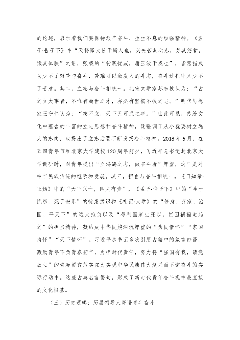 专题党课:培养矢志奋斗的时代新人同志们:在党的二十大报告中,习近平总书记指出:“广大青年要立志做有理想、敢担当、能吃苦、肯奋斗的新时代好青年。”奋斗精神是中华传统美德,“肯奋斗”是新时代好青年的重要素质。无论是过去还是现在,我们党取得的一切辉煌成就都离不开艰苦奋斗精神。近年来,习近平总书记始终把青年工作放在心上,在不同的场合和时间段,发表了一系列关于“青年奋斗”主题的重要讲话、贺信以及致辞等,创造性地提出了关于广大青年要永久保持奋斗的新理念、新论断,形成了具有丰富内涵的习近平新时代青年奋斗观,这既是对青年在伟大事业中建功立业的殷殷嘱托,也是对青年担起新征程新使命新担当的要求。为进一步深入研究阐释习近平新时代青年奋斗观,教育引导新时代青年树立正确的奋斗观,今天,由我为大家作一堂党课报告,与同志们共同交流。一、习近平新时代青年奋斗观的生成逻辑习近平新时代青年奋斗观的生成逻辑包括理论逻辑、文化逻辑、历史逻辑、现实逻辑等方面内容。(一)理论逻辑:马克思主义的青年奋斗思想马克思认为,青年不是一个抽象的概念,它是每个人的人生发展都必须经历的一个阶段,作为现实的、活动的、处在人生黄金阶段的青年,就是要敢于善于承担责任,为无产阶级的解放和全人类的幸福而奋斗。毋庸置疑,青年时期马克思的目标就是为实现全世界人类的幸福而奋斗。现实中他亲自参加无产阶级运动,在这过程中,马克思深刻地认识到青年的社会历史重要作用,认为青年工人代表着无产阶级运动的方向和未来社会发展的方向。伟大的无产阶级革命家列宁非常重视青年在革命运动中的作用,十分关切把先进的青年引导到革命斗争中来,赞扬了参加斗争的俄国青年的英勇精神。在苏维埃共和国成立的头几年,他指出,地基业已清除好了,共产主义青年后辈的任务也就是应当在这块地基上建设共产主义社会,青年的历史使命就是要把实现共产主义社会作为人生的最终目标。中国共产党从成立之初,就始终秉持马克思主义关于青年奋斗、担当的思想,无论在各个时期,都把党的事业与青年工作同部署同安排,形成了富有中国特色的青年奋斗精神。习近平总书记以马克思主义奋斗思想为理论根基,形成了具有符合青年特征、时代潮流的新时代青年奋斗观,不断推动马克思主义青年奋斗思想中国化时代化。(二)文化逻辑:中华民族艰苦奋斗精神中华民族拥有五千多年的灿烂文化,历史久远、博大精深,形成了深厚的传统文化底蕴和长盛不衰的文化基因。这不仅为习近平总书记关于新时代青年要奋斗的相关论述提供了思想之源,也为提升国家文化软实力、建设文化强国提供了源源不断的动力。其一,艰苦与奋斗相统一。比如《易经》中“天行健,君子以自强不息”的论述,启示着我们要保持艰苦奋斗、生生不息的顽强精神。《孟子·告子下》中“天将降大任于斯人也,必先苦其心志,劳其筋骨,饿其体肤”之语,张载的“贫贱忧戚,庸玉汝于成也”,皆意指成功少不了艰苦与奋斗,苦难可以激发人的斗志,奋斗过程中又少不了苦难。其二,立志与奋斗相统一。北宋文学家苏东坡认为:“古之立大事者,不惟有超世之才,亦必有坚韧不拔之志。”明代思想家王守仁认为:“志不立,天下无可成之事。”由此可见,传统文化中蕴含的丰富的立志思想和奋斗精神,既强调了从小就要树立远大的志向,也提出了立志后要不断发扬奋斗精神。2018年5月,在五四青年节和北京大学建校120周年前夕,习近平总书记赴北京大学调研时,对青年提出“立鸿鹄之志,做奋斗者”厚望,这正是对中华民族传统的继承和发展。其三,担当与奋斗相统一。《日知录·正始》中的“天下兴亡,匹夫有责”,《孟子·告子下》中的“生于忧患,死于安乐”的忧患意识和《礼记·大学》的“修身、齐家、治国、平天下”的远大抱负以及“苟利国家生死以,岂因祸福避趋之”的担当精神,凝结成中华民族深沉厚重的“为民情怀”“家国情怀”“天下情怀”。习近平总书记多次引用古籍中的箴言妙语,激励青年不负青春韶华,勇担时代责任,努力将“强国有我,请党放心”的青春誓言落实在为实现中华民族伟大复兴而不懈奋斗的实际行动中。这些古典名言警句,形成了新时...