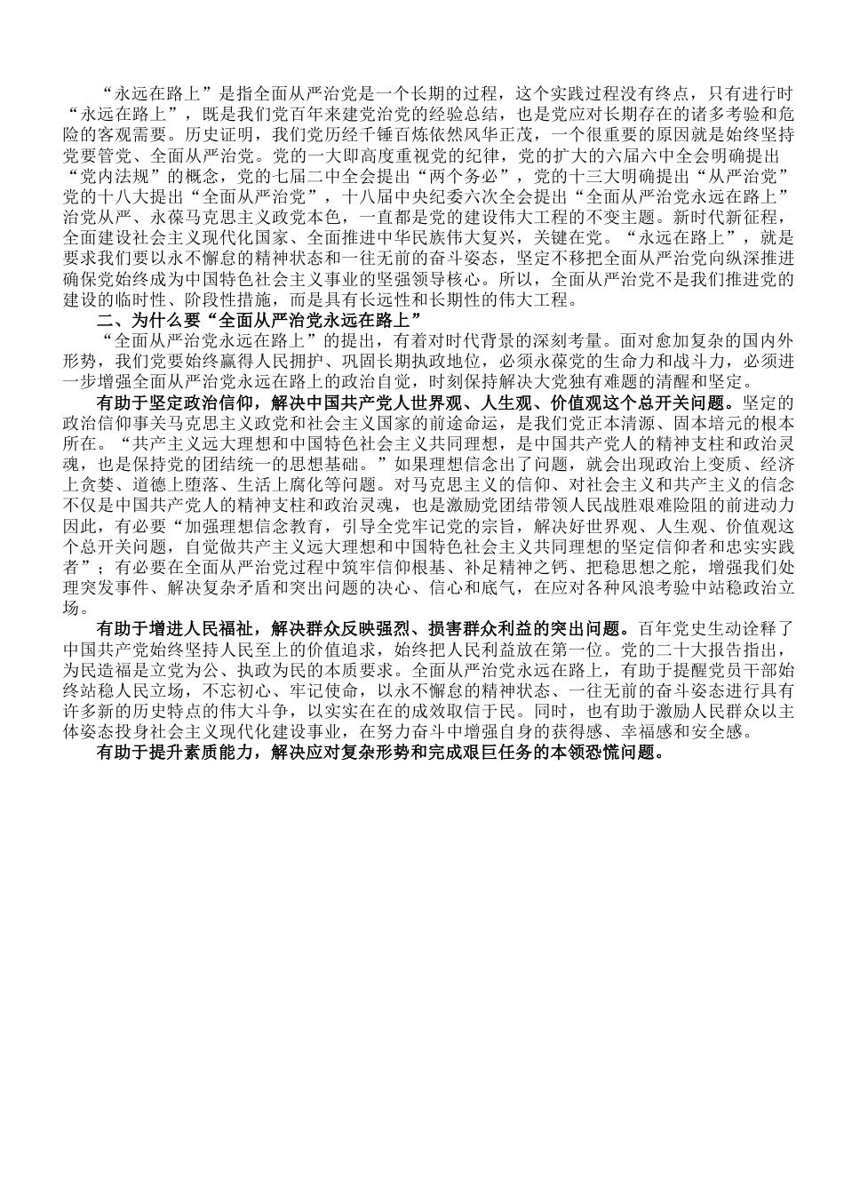 同志们:全面从严治党在党的二十大报告中所占篇幅较大,凸显其极端重要性。习近平总书记深刻指出:“全面从严治党永远在路上,党的自我革命永远在路上。”这一重大判断揭示了我们党历经百年依然风华正茂的奥秘所在,充分彰显了我们党一以贯之坚持自我革命、确保党永远不变质、不变色、不变味的政治决心,标志着我们党对建设长期执政的马克思主义政党的规律性认识达到新高度。全面从严治党是党对中国特色社会主义建设规律认识深化和理论创新的重大成果之一。中国共产党的百年奋斗历史,是党不断推进中华民族伟大复兴的历史,也是党不断加强自身建设推进自我革命的历史。一、“全面从严治党永远在路上”的科学内涵“全面从严治党永远在路上”内涵丰富而深刻,是新时代我们党在深刻认识与把握执政党执政规律的基础上,对党的自我革命规律认识的深化与升华。党的十八大以来,以习近平同志为核心的党中央坚决推进全面从严治党,在从严治党的基础上突出了体系化和常态化,拓展了管党治党的时空维度。在实践中不断丰富和完善全面从严治党的内涵,推动了“全面从严治党永远在路上”理论和实践的同步发展,使“全面从严治党永远在路上”成为党中央深入推进新时代党的建设新的伟大工程的鲜明主题。所谓“全面”,是指从严治党内容上全涵盖、对象上全涵盖、责任上全链条、制度上全贯通内容上全涵盖,是指党的建设推进到哪里,全面从严治党体系就要构建到哪里,全面从严治党涵盖党的建设各方面。对象上全覆盖,是指全面从严治党要管全党、治全党,从严抓好领导干部队伍、党员队伍、各级党组织建设,尤其是要抓住“关键少数”以上率下。责任上全链条,是指依据党内法规,各级党委(党组)都要全面压紧压实从严治党主体责任,各级纪委要担负起监督责任、敢于执纪问责,增强管党治党意识、落实管党治党责任。制度上全贯通,是指用制度促进全面从严治党各个体系贯通联动,推动反腐败工作制度化、法治化、规范化,真正实现制度治党、依规治党。要做到“全面”,就要树立系统思维,确立整体观念,用普遍联系的观点,认真分析全面从严治党各个要素的功能作用及其相互关系,从多个方面、多维主体出发,形成党建合力,推动全面从严治党向纵深发展,把党建设成为坚强的领导核心。“从严治党”关键在严,体现在“真”和“敢”上。做到真管真严、敢管敢严、长管长严,是对党的建设长期性、复杂性、艰巨性的科学回应。治国必先治党,治党务必从严。从严治党,就是要做到无禁区,保证“从严”落实于各领域、各环节、各主体,做到规矩面前人人平等;设立严标准,严打腐败苗头,严惩腐败行为,在强化震慑力的同时树立规矩的权威。首先,从严是一种态度,真正做到从严要有真管、敢管的责任感,明确职责并将自身职责落实到位。要严在态度、严在细节、严在行动、严在落实,要敢于突破利益固化的藩篱,要“以猛药去疴、重典治乱的决心,以刮骨疗毒、壮士断腕的勇气”,坚持惩治不放松,保持高压态势,推进全面从严治党向纵深发展。其次,从严治党是指制定严格纪律、规矩。强化纪律建设、制度建设至关重要,各级党组织要认真贯彻执行《中国共产党廉洁自律准则》《中国共产党纪律处分条例》等规章制度使其真正成为“带电的高压线”,营造守纪律、讲规矩的良好氛围。从严治党,要一体推进不敢腐、不能腐、不想腐,始终保持严的氛围。“永远在路上”是指全面从严治党是一个长期的过程,这个实践过程没有终点,只有进行时“永远在路上”,既是我们党百年来建党治党的经验总结,也是党应对长期存在的诸多考验和危险的客观需要。历史证明,我们党历经千锤百炼依然风华正茂,一个很重要的原因就是始终坚持党要管党、全面从严治党。党的一大即高度重视党的纪律,党的扩大的六届六中全会明确提出“党内法规”的概念,党的七届二中全会提出“两个务必”,党的十三大明确提出“从严治党”党的十八大提出“全面从严治党”,十八届中央纪委六次全会提出“全面从严治党永远在路上”治党从严、永葆马克思主义政党本色,一直都是党的建设伟大工程的不变主题。新时代新征程,全面建设社会主义现代化国家、全面推进中华民族伟大复兴,关...