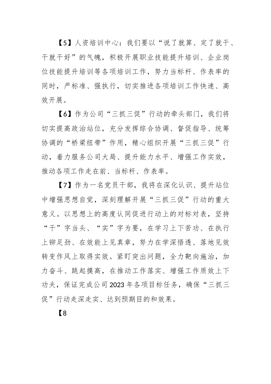 “三抓三促”行动心得感言【1】开展“三抓三促”行动,是坚定信心、知重负重,集聚势能、奋力奔跑的行动指南。作为国企基层职工,我们将勇于担当,敢于负责,不断提升理论素养和业务水平做好动物疫病预防检测、业务拓展、植物种苗生产等各项工作任务,全力以赴推动公司全面发展。【2】作为基层职工,我们将深入贯彻集团党委和公司“三抓三促”动员部署会议精神,持续在创新上下功夫,坚持运用创新理念和方法破解集团花卉产业发展出现的难题,运用成熟、科学的方法推进实务性研究与品质提升工作。【3】作为一名基层工作人员,在开展“三抓三促”行动中,我将深入贯彻落实好新区及集团公司“三抓三促”行动会议精神,对照工作实际,进一步加强政治理论、专业知识的学习,优化工作制度、流程及方式方法,细化岗位职责,不断提高自身业务素质和执行能力,做到向书本学、向群众学、向先进学、向实践学,不断提质效、强本领,持之以恒转变工作作风、全力以赴做好本职工作。【4】我们将立足黄河流域生态储备林动态监测、项目质量及项目安全管理等重点工作,切实提高政治站位,认真落实“三抓三促”行动要求,以时不我待的精神、分秒必争的行动抓实工作、提升效能。【5】人资培训中心:我们要以“说了就算、定了就干、干就干好”的气魄,积极开展职业技能提升培训、企业岗位技能提升培训等各项培训工作,努力当标杆、作表率的同时,严标准、强执行,切实推进各项培训工作快速、高效开展。【6】作为公司“三抓三促”行动的牵头部门,我们将切实提高政治站位,充分发挥综合协调、督促指导、统筹协调的“桥梁纽带”作用,精心组织开展“三抓三促”行动,着力服务公司大局、提升能力水平、增强工作实效,推动各项工作走在前、当标杆、作表率。【7】作为一名党员干部,我将在深化认识、提升站位中增强思想自觉,深刻理解开展“三抓三促”行动的重大意义。以思想上的高度认同促进行动上的对标对表,坚持“干”字当头、“实”字为要,在学习上下苦功、在执行上铆足劲、在效能上见真章,努力在学深悟透、落地见效转变作风上取得实效。紧盯突出问题,全力靶向施治,加力奋斗、跳起摸高,在推动工作落实、增强工作质效上下功夫,保证完成公司2023年各项目标任务,确保“三抓三促”行动走深走实、达到预期目的和效果。【8】“三抓三促”行动为我们进一步增强履职本领、提升工作能力、推动各项工作高质量发展指明了方向、明确了路径。我将以“三抓三促”行动为契机,认真学习领会全省和集团公司“三抓三促”行动动员部署会议精神,抓自身学习着力提升七种能力、八项本领,履职落实到位,执行尽责到位,增强干事创业的拼劲和干劲。坚定信心、知重负重,为“三抓三促”行动落地见效、集团公司完成全年目标任务贡献力量。【9】作为一名基层工作人员,在开展“三抓三促”行动中,我将深入贯彻落实好新区及集团公司“三抓三促”行动会议精神,对照工作实际,进一步加强政治理论、专业知识的学习,优化工作制度、流程及方式方法,细化岗位职责,不断提高自身业务素质和执行能力,做到向书本学、向群众学、向先进学、向实践学,不断提质效、强本领,持之以恒转变工作作风、全力以赴做好本职工作。【10】:“三抓三促”行动是深入贯彻党的二十大精神,凝心聚力促全省经济社会发展的重大举措。作为一名党员,我们必须要有芒刺在背、寝食难安的紧迫感,要有只争朝夕、奋勇向前的责任感。我将把此次行动作为提振干事激情的不竭动力,转化为在学习生活中、工作岗位上不懈奋斗的具体行动,为集团高质量发展贡献自己的力量。【11】开展“三抓三促”行动,要在学习上下功夫、在执行上铆足劲、在效能上见真章,我们将努力找准找实“三抓三促”行动与本职工作的契合点,做好果蔬产业动态监测及务实性研究工作,积极推进公司健康转型发展。