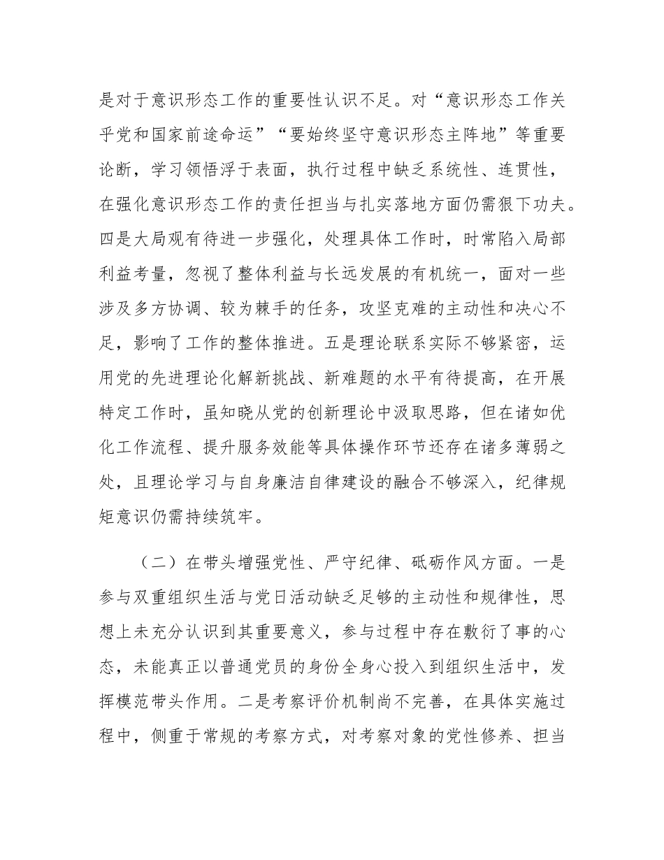 领导干部2024年度专题民主生活会、组织生活会对照检查材料(四个带头)根据局党组关于召开2024年度民主生活会的工作部署,我紧紧围绕本次民主生活会主题,结合自身实际情况,认真对照“四个带头”,全面深入查摆了自身存在的突出问题,认真分析了问题产生的原因,针对问题和原因,逐项明确了下一步整改措施。按照会议安排,现将个人对照检查情况汇报如下。一、存在的主要问题(一)在带头严守政治纪律和政治规矩,维护党的团结统一方面。一是贯彻上级决策部署不够有力。有时存在机械执行的情况,未能充分结合本部门实际灵活变通,导致落实效果打折扣,全局统筹谋划的视野不够开阔,在立足整体、长远布局高质量发展路径上办法不多,破解基层治理深层次矛盾的能力还需大力提升。二是在学思践悟融合方面存在脱节现象。面对意识形态领域复杂多变的局势,对各类思潮的动态监测不够敏锐,运用政治洞察力去剖析经济社会多元问题的本领欠缺,对当下意识形态走向的宏观把控和微观洞察不够精准,未能将“政治三力”切实转化为指导工作的有力武器和高效实践。三是对于意识形态工作的重要性认识不足。对“意识形态工作关乎党和国家前途命运”“要始终坚守意识形态主阵地”等重要论断,学习领悟浮于表面,执行过程中缺乏系统性、连贯性,在强化意识形态工作的责任担当与扎实落地方面仍需狠下功夫。四是大局观有待进一步强化,处理具体工作时,时常陷入局部利益考量,忽视了整体利益与长远发展的有机统一,面对一些涉及多方协调、较为棘手的任务,攻坚克难的主动性和决心不足,影响了工作的整体推进。五是理论联系实际不够紧密,运用党的先进理论化解新挑战、新难题的水平有待提高,在开展特定工作时,虽知晓从党的创新理论中汲取思路,但在诸如优化工作流程、提升服务效能等具体操作环节还存在诸多薄弱之处,且理论学习与自身廉洁自律建设的融合不够深入,纪律规矩意识仍需持续筑牢。(二)在带头增强党性、严守纪律、砥砺作风方面。一是参与双重组织生活与党日活动缺乏足够的主动性和规律性,思想上未充分认识到其重要意义,参与过程中存在敷衍了事的心态,未能真正以普通党员的身份全身心投入到组织生活中,发挥模范带头作用。二是考察评价机制尚不完善,在具体实施过程中,侧重于常规的考察方式,对考察对象的党性修养、担当精神、创新能力等深层次特质的考量不够细致入微,测评指标的设定缺乏精准度,难以全面、客观地反映真实情况。三是严肃党内政治生活的引领示范作用发挥不够到位,班子成员履行党员基本义务时,离高标准、严要求还有一定差距,以普通党员身份参与支部组织生活的自觉性和频次都有待提高,开展批评与自我批评时往往避重就轻,讲党课的质量和深度也有所欠缺。四是党内政治生活的规范性仍需加强,尽管党委班子成员总体上能严守政治纪律和政治规矩,严肃处理违规行为,但个别同志还存在参与党组织活动不积极、不按时的问题,部分同志在相互批评环节,对一些潜在的作风问题未能开诚布公地指出,影响了党内政治生活的质量。五是工作中存在安于现状、标准不高的现象,部分单位缺乏与先进标杆看齐的勇气和魄力,缺乏大局意识,只满足于完成基本任务,忽视了工作质量的提升,在对外沟通协调方面不够积极主动,致使一些重要项目和资金争取困难重重,阻碍了事业发展。(三)在带头遵规守纪、清正廉洁前提下勇于担责、敢于创新方面。一是年轻干部培养体系存在漏洞,在注重业务能力培养的同时,对其政治素养塑造、廉洁从政引导的重视程度不够,缺乏系统全面的教育规划。年轻干部正处于成长的关键期,面对纷繁复杂的社会环境,容易因缺乏正确引导而在廉洁自律方面出现问题,凸显完善培养机制、全方位助力年轻干部成长的紧迫性。二是容错纠错机制在实际运用中存在梗阻,其本意是为担当作为者保驾护航,但具体界定界限不够清晰,操作细则过于繁杂,使得基层干部在探索创新时顾虑重重,不敢放开手脚大胆尝试,严重束缚了基层工作的创新活力,亟待优化机制,让好政策真正落地生效。三是主动接受监督的意识淡薄,部分领导干部仍残留着陈旧的权力观念,没有正确认识到监督对于自身和工作的重要...