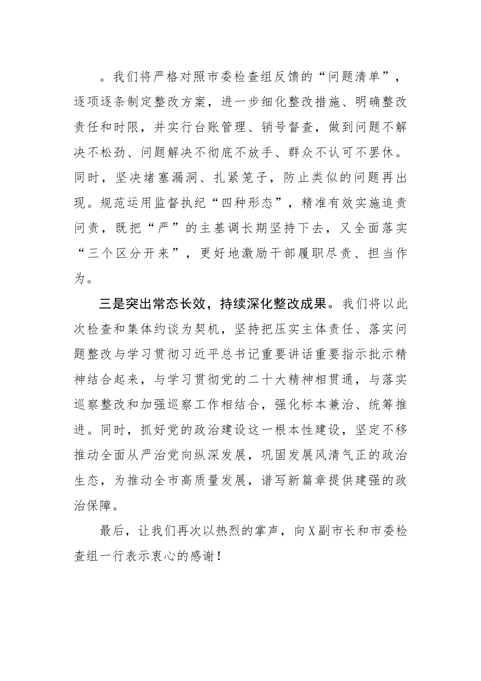 在全面从严治党主体责任检查集体约谈会上的表态发言刚才,市委第七检查组X组长通报了全面从严治党主题责任检查发现的问题,X副市长作了集体约谈讲话,既客观评价了我们的工作,又严肃指出了我们存在的不足和问题,并提出了针对性、指导性都很强的整改要求,充分体现了市委对我县工作的重视和支持,对X县各级领导干部的关心关爱。这次检查是一次全面精准的“政治体检”,检查组指出的问题,抓住了实质、切中了要害,找准了我们的“病灶”,开出了“药房”。我们诚恳接受、照单全收,并将举一反三,坚决抓好整改落实。这里,我代表X县县委作如下表态:一是强化政治意识,主动扛起整改责任。我们将坚决把问题整改作为当前一项重要政治任务抓紧抓实,进一步强化政治责任、政治担当,主动对标对表《党委(党组)全面从严治党主体责任规定》,切实以整改落实的行动和成效忠诚捍卫“两个确立”,坚决做到“两个维护”。我本人将严格履行“第一责任人”责任,主动认领,带头整改;县委常委班子要按照职责分工抓好分管领域和分管部门的整改工作,纪检监察机关要加大全程跟踪督办和问责问效的力度;各级党组织主要负责同志要把整改工作记在心里、扛在肩上,要把自己摆进去、把工作摆进去、把职责摆进去,做到主动抓、亲自抓、坚决改,确保整改落细落实落到位。二是坚持多措并举,着力提升整改质量。我们将严格对照市委检查组反馈的“问题清单”,逐项逐条制定整改方案,进一步细化整改措施、明确整改责任和时限,并实行台账管理、销号督查,做到问题不解决不松劲、问题解决不彻底不放手、群众不认可不罢休。同时,坚决堵塞漏洞、扎紧笼子,防止类似的问题再出现。规范运用监督执纪“四种形态”,精准有效实施追责问责,既把“严”的主基调长期坚持下去,又全面落实“三个区分开来”,更好地激励干部履职尽责、担当作为。三是突出常态长效,持续深化整改成果。我们将以此次检查和集体约谈为契机,坚持把压实主体责任、落实问题整改与学习贯彻习近平总书记重要讲话重要指示批示精神结合起来,与学习贯彻党的二十大精神相贯通,与落实巡察整改和加强巡察工作相结合,强化标本兼治、统筹推进。同时,抓好党的政治建设这一根本性建设,坚定不移推动全面从严治党向纵深发展,巩固发展风清气正的政治生态,为推动全市高质量发展,谱写新篇章提供建强的政治保障。最后,让我们再次以热烈的掌声,向X副市长和市委检查组一行表示衷心的感谢!