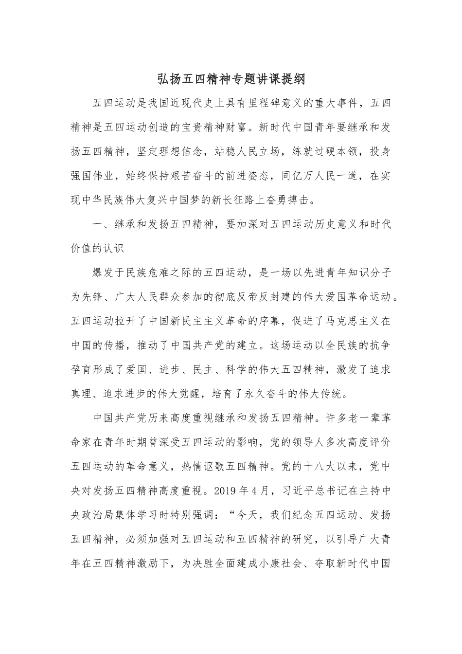 弘扬五四精神专题讲课提纲五四运动是我国近现代史上具有里程碑意义的重大事件,五四精神是五四运动创造的宝贵精神财富。新时代中国青年要继承和发扬五四精神,坚定理想信念,站稳人民立场,练就过硬本领,投身强国伟业,始终保持艰苦奋斗的前进姿态,同亿万人民一道,在实现中华民族伟大复兴中国梦的新长征路上奋勇搏击。一、继承和发扬五四精神,要加深对五四运动历史意义和时代价值的认识爆发于民族危难之际的五四运动,是一场以先进青年知识分子为先锋、广大人民群众参加的彻底反帝反封建的伟大爱国革命运动。五四运动拉开了中国新民主主义革命的序幕,促进了马克思主义在中国的传播,推动了中国共产党的建立。这场运动以全民族的抗争孕育形成了爱国、进步、民主、科学的伟大五四精神,激发了追求真理、追求进步的伟大觉醒,培育了永久奋斗的伟大传统。中国共产党历来高度重视继承和发扬五四精神。许多老一辈革命家在青年时期曾深受五四运动的影响,党的领导人多次高度评价五四运动的革命意义,热情讴歌五四精神。党的十八大以来,党中央对发扬五四精神高度重视。2019年4月,习近平总书记在主持中央政治局集体学习时特别强调:“今天,我们纪念五四运动、发扬五四精神,必须加强对五四运动和五四精神的研究,以引导广大青年在五四精神激励下,为决胜全面建成小康社会、夺取新时代中国特色社会主义伟大胜利、实现中华民族伟大复兴的中国梦不懈奋斗。”五四精神的核心是爱国主义精神,这也是我们民族精神的核心。百年来,在中国共产党领导下,一代代中国青年继承和发扬五四精神,积极投身党领导的革命、建设、改革伟大事业,在为祖国、为人民、为民族的奉献中焕发青春光彩、谱写青春乐章,始终是实现中华民族伟大复兴的先锋力量。五四精神是中华民族百折不挠、自强不息的民族精神的生动写照。五四运动以来中国青年从斗争实践中懂得,中国社会发展,中华民族振兴,中国人民幸福,不能依靠他人恩赐,必须依靠自己的英勇奋斗来实现,用青春之我创造青春之中国、青春之民族。五四精神体现了中国人民和中华民族近代以来追求的先进价值观,与我们今天弘扬和践行的社会主义核心价值观是相通的。五四运动前后,先进知识分子和革命青年在追求真理中传播新思想新文化,越来越多中国先进分子集合在马克思主义旗帜下。今天,在中国共产党领导下,我们坚定道路自信、理论自信、制度自信、文化自信,实现中华民族伟大复兴展现出前所未有的光明前景。二、继承和发扬五四精神,要代表广大青年、赢得广大青年、依靠广大青年青年兴则国家兴,青年强则国家强。在中国共产党直接关怀和领导下,1922年中国共产主义青年团的前身中国社会主义青年团在中国革命的伟大洪流中正式成立。1939年5月,党中央在五四运动二十周年之际首次举办五四运动纪念活动,确定5月4日为中国青年节。在革命、建设、改革各个历史时期,我们党都高度重视青年、关怀青年、信任青年,对青年一代寄予殷切期望,把青年看作是祖国的未来、民族的希望,把青年作为党和人民事业发展的生力军,支持青年在人民的伟大奋斗中实现自己的人生理想。党的十八大以来,以习近平同志为核心的党中央从党和国家事业发展全局出发,高度重视和大力推进青年工作,推动我国青年工作取得了一系列历史性成就。我们党召开了党的历史上第一次中央党的群团工作会议,出台了新中国历史上第一个青年发展规划,部署了共青团改革。党中央明确了青年工作的战略地位、中国青年运动的时代主题、青年工作的职责使命、青年一代健康成长的正确道路、青年工作的路径方法、共青团改革发展的目标任务,明确必须加强党对青年工作的领导,为做好新时代党的青年工作提供了根本遵循。习近平总书记不仅从党和国家工作全局出发为青年工作掌舵领航,还身体力行关怀鼓励青年成长成才,做青年朋友的知心人、青年工作的热心人、青年群众的引路人。他多次到高等院校、职业学校和中小学考察调研,参加学生活动,与师生座谈,或以书信的方式与各行各业、各年龄层青年交流,既谈学习方法、工作方法,也聊人生理想、道路选择。在给北京大学考古文博学院2009级本科团支部全体同学的回信中,...